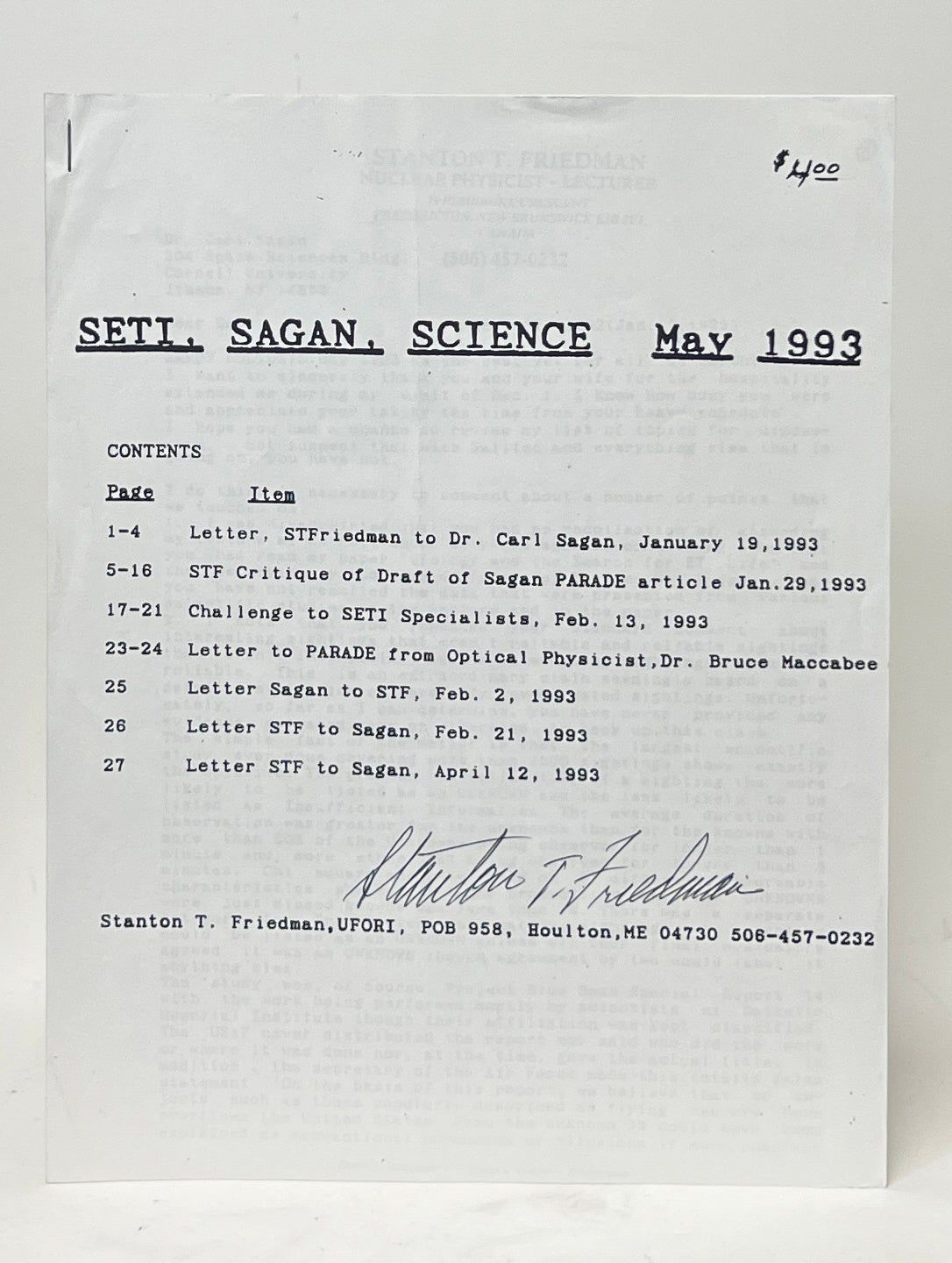 Houlton: Stanton T. Friedman, 1993. First Edition. Paperback. Very Good. Signed by Friedman on the cover. 27p. Very Good. Pages lightly toned and bumped, light creases at the top-middle. Firmly bound with one staple, clean internally. A reproduction of a letter to the editor of Parade by Bruce Maccabee commenting on a Carl Sagan article, and more interestingly, correspondence between Friedman and Carl Sagan in which Friedman, with passive-aggressive panache, calls out Sagan for his apparently flippant and ill-researched article published in a 1993 issue of Parade. At one point, Friedman criticizes Sagan's article page-by-page, which goes on for about ten pages. An interesting look behind the curtain of ufology and science. No copies located in OCLC. From the collection of Tom Benson.