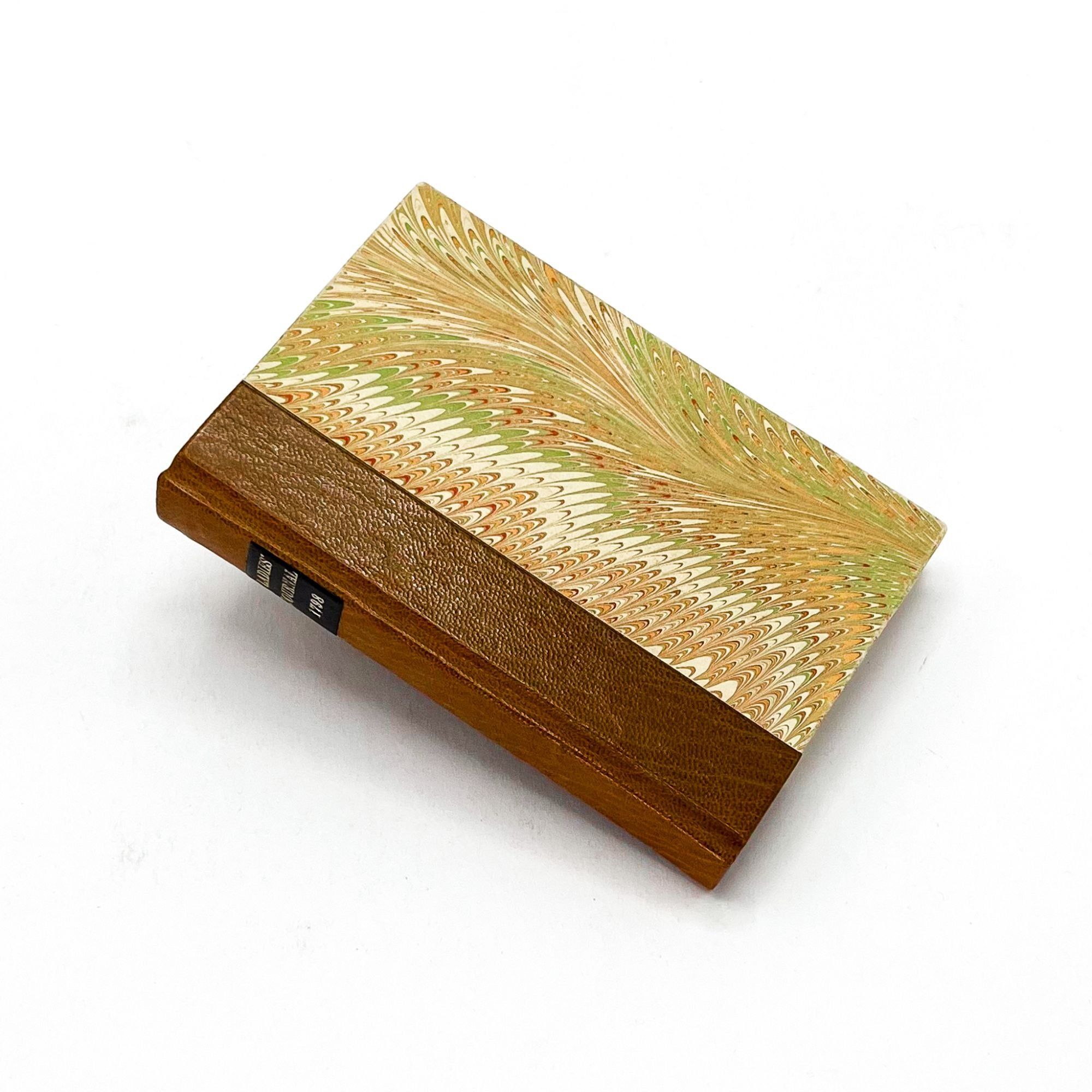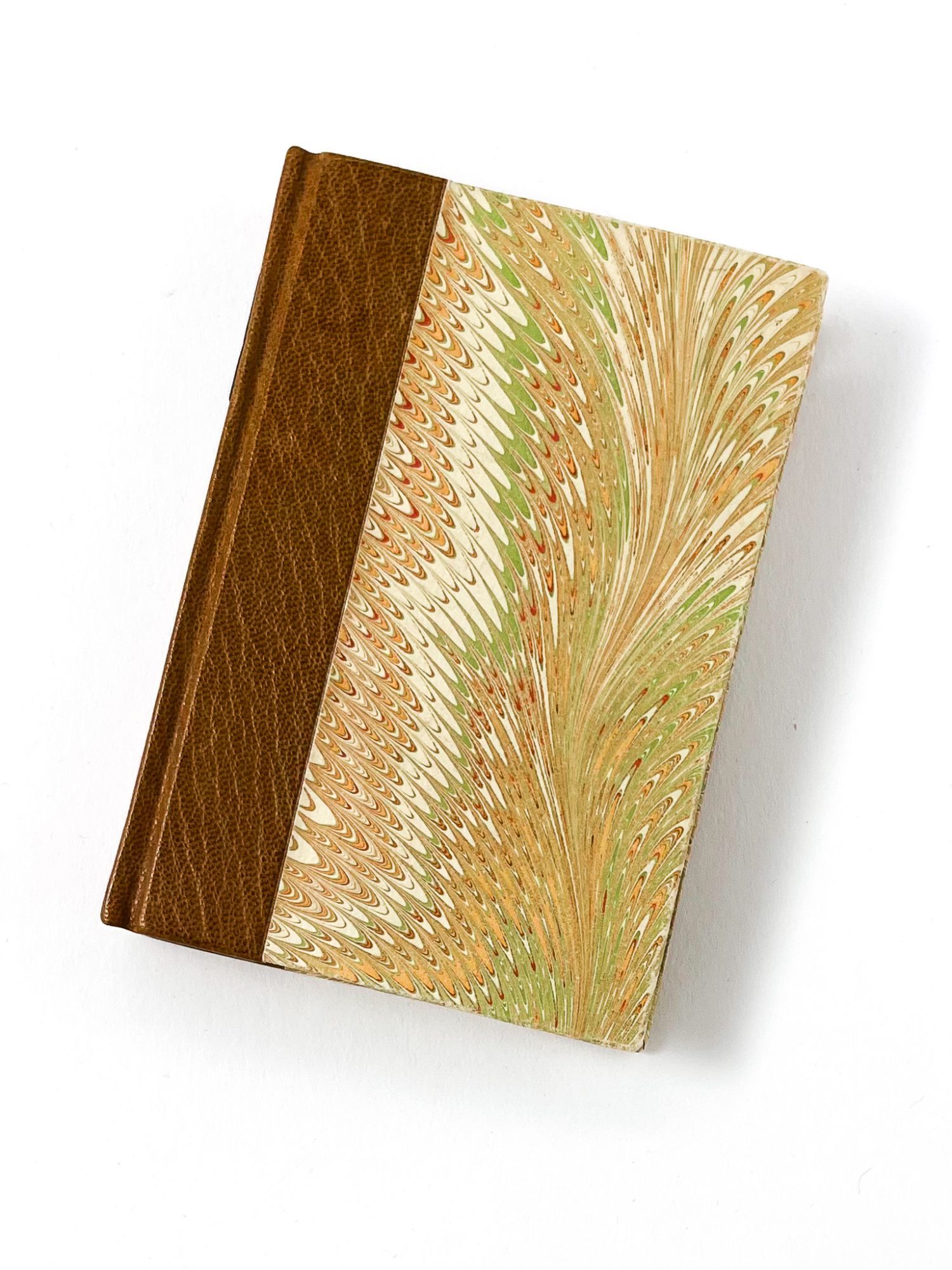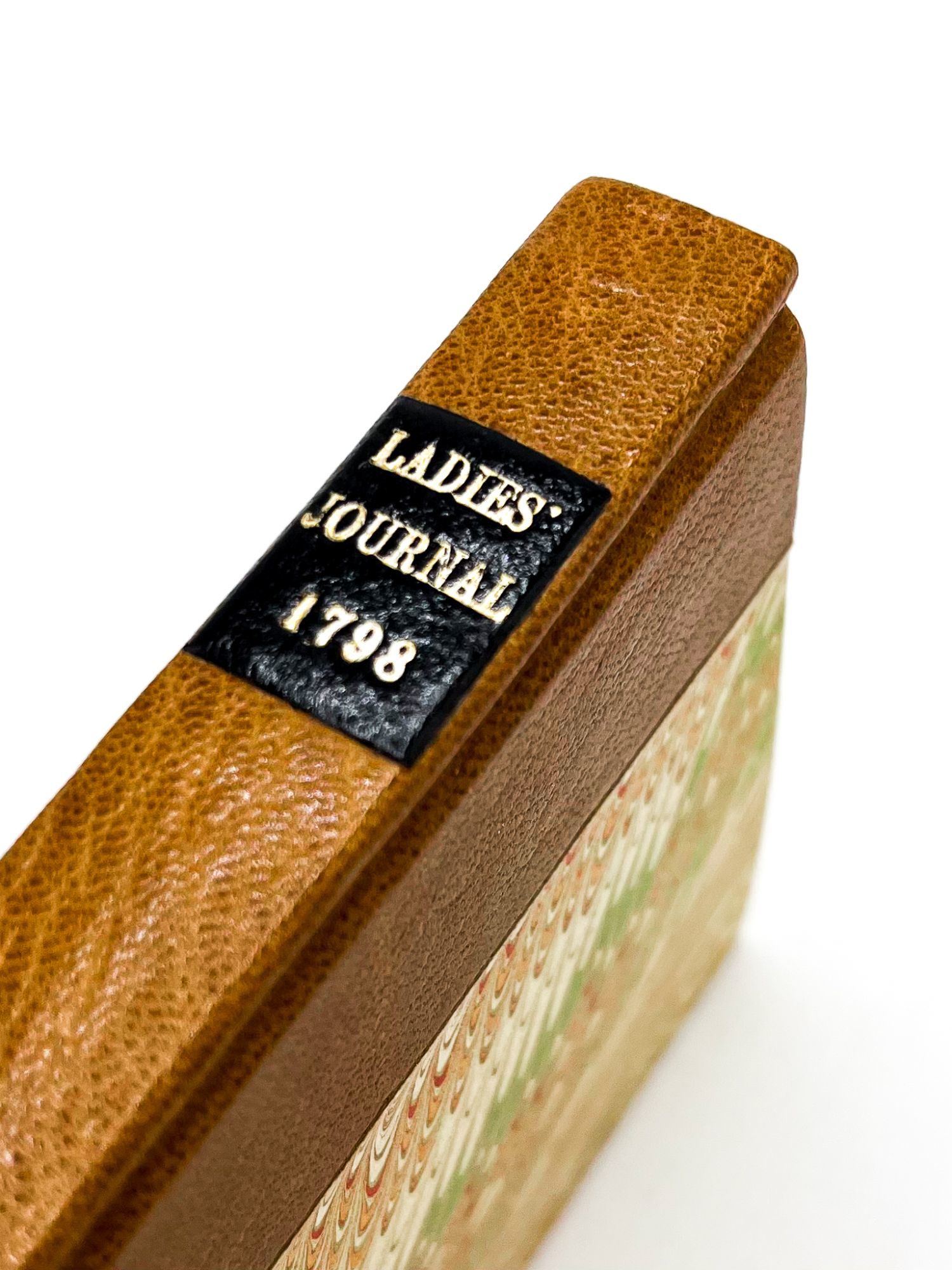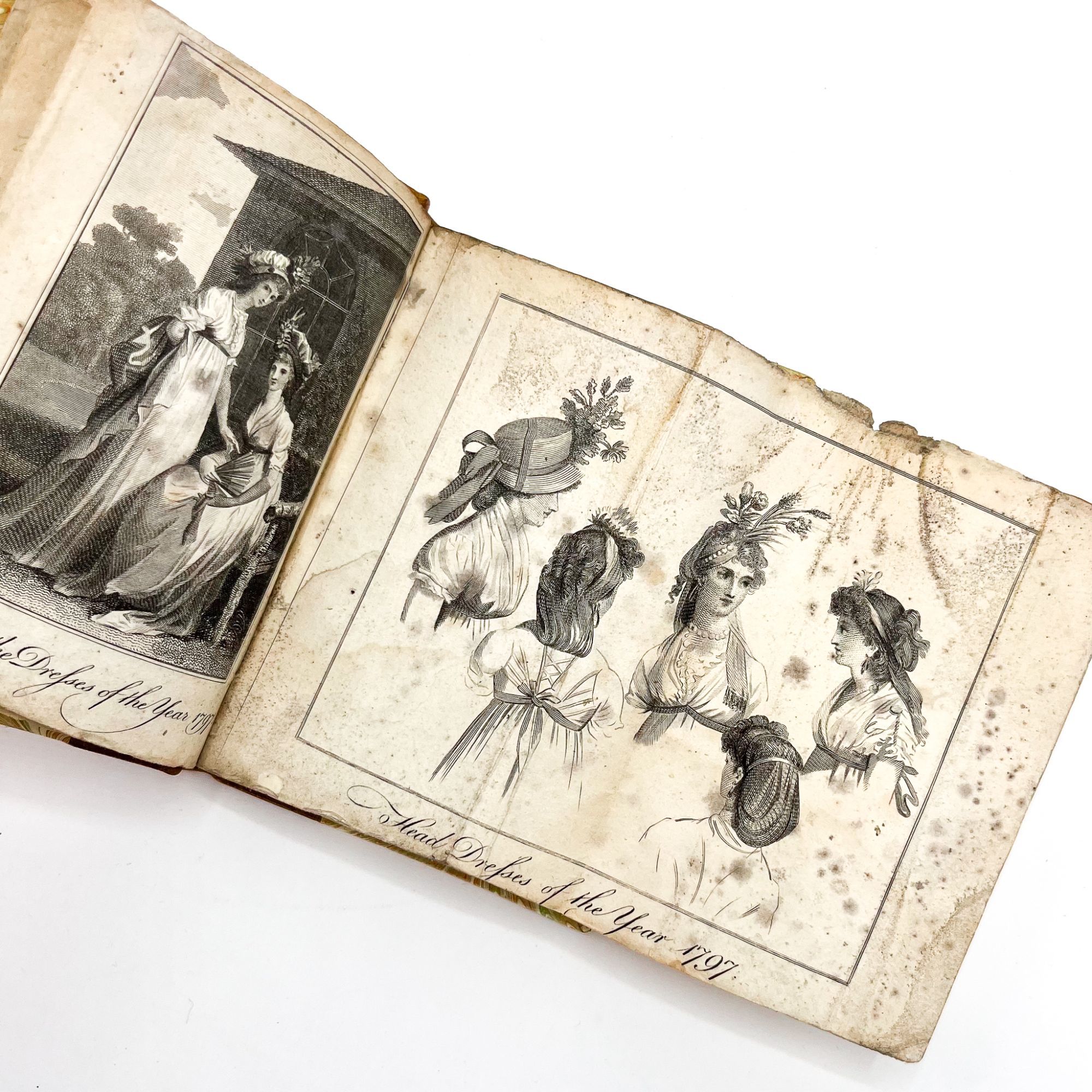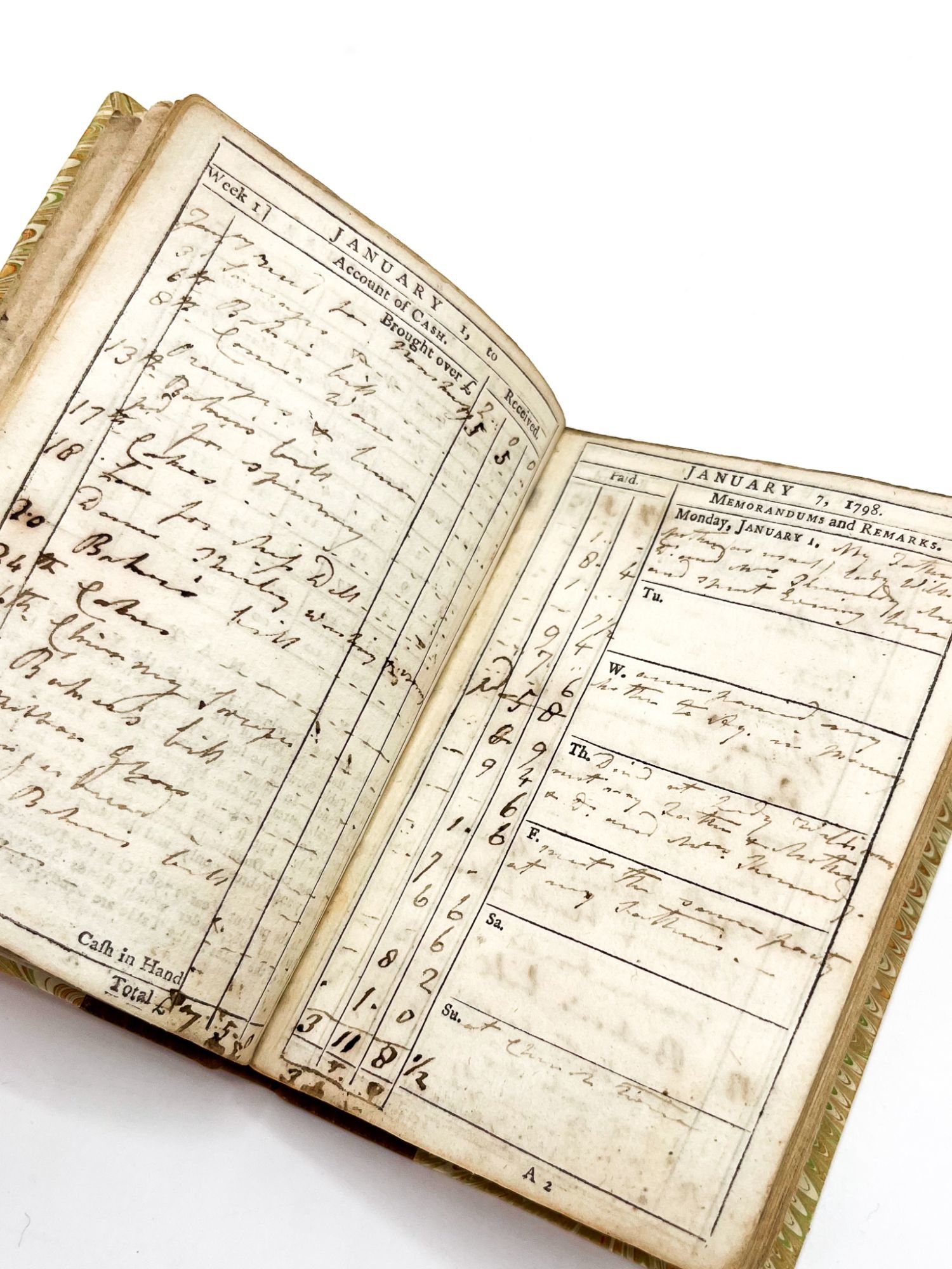 London: Printed for G.G. & J. Robinson, 1797. Very good.. Pocketbook of the same kind used by the acclaimed novelist and playwright Elizabeth Inchbald, with many portions filled in by a contemporary owner. Elizabeth Inchbald kept a thin but regular pocketbook diary for more than fifty years, recording her expenses, her daily reads, her visits from friends and famous figures alike, her drafts on various works, and more. The surviving Inchbald pocketbooks are now held at the Folger Shakespeare Library. The present pocketbook is one of the same editions that Inchbald owned, designed to keep accounts as well as to note down memoranda. A 1790s owner has filled in many entries through November, 1798. Like Inchbald, she has recorded expenses ("Eggs - Butter") and social call ("My Mother visited me"). A lovely window into the quotidian life of a Georgian woman. 4.5'' x 3.25''. Modern quarter straight-grained tan morocco, marbled paper boards, black morocco spine label. Illustrated with two engraved fashion plates: "Ladies in the Dresses of the Year 1797" and folding plate "Head Dresses of the Year 1797." Unpaginated. Contemporary ink marginalia throughout, covering a large number of entries and keeping accounts. Some dampstain and foxing to engravings. First and last few leaves heavily soiled. Top edge closely trimmed. Firm.