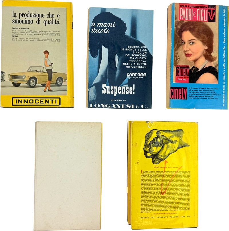 Five popular Italian-language noir novels, all but one translated from the original English. The dust jacket and cover designs all employ original color photographs of beautiful women, all partly to fully en deshabille, the rear jacket panels additionally used for advertisements, whether for the publisher's crime series, a television program, or a nifty sports car.