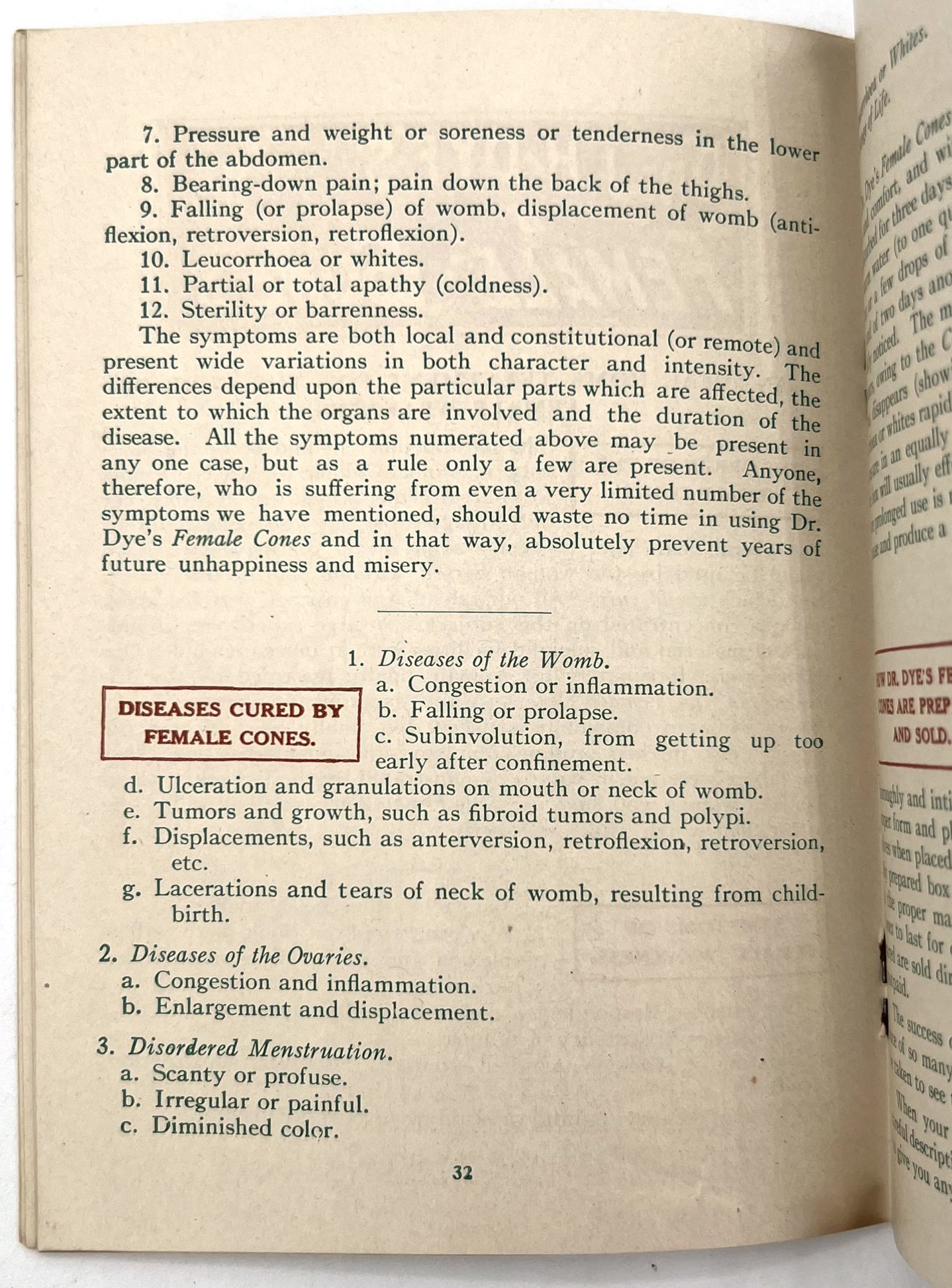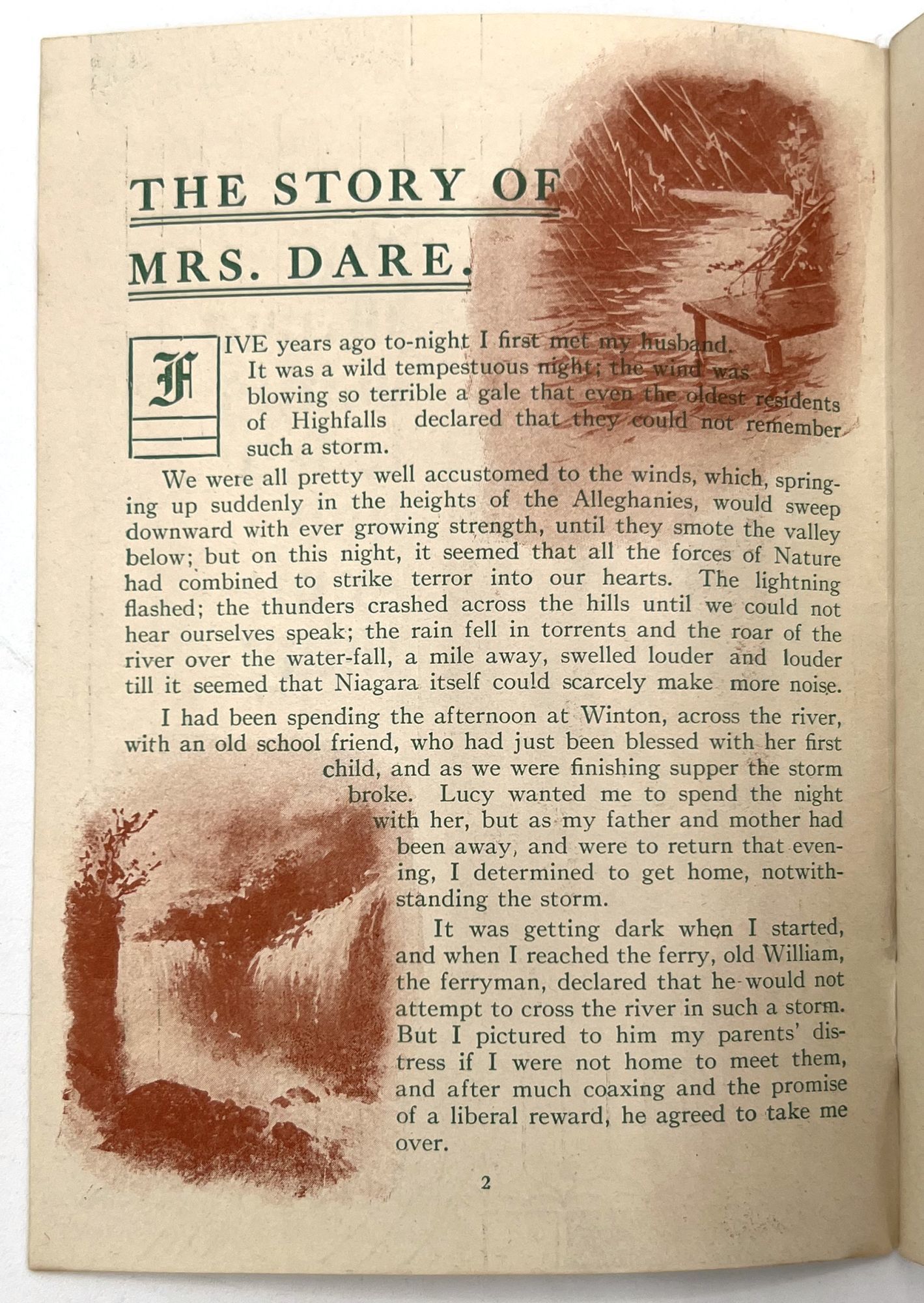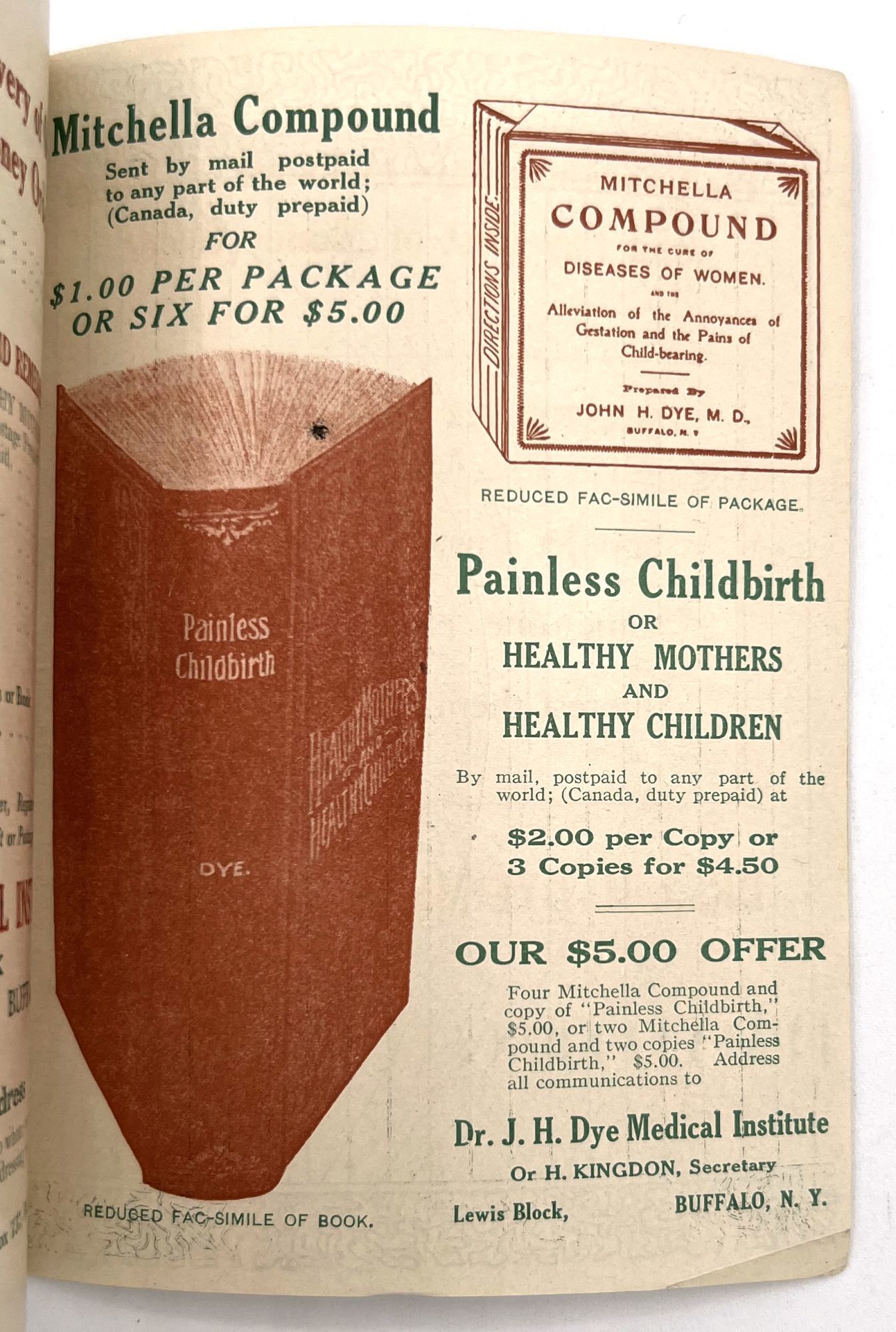 Buffalo, New York: Dr. J.H. Dye Medical Institute, 1900. Very good. Toned.. A slightly later edition of a booklet advertising Dr. J.H. Dye's Mitchella Compound, a patent medicine that claims to cure diseases specific to women and promote painless childbirth. Marketed towards women, it begins with the ten-page "Story of Mrs. Dare", which is soaked in sentiment and reads like a melodrama. The main character, Mrs. Dare, recounts meeting her future husband in a tempestuous storm, and the happiness they found in marriage before she fell pregnant and experienced "sufferings that only a woman can know, until at last my husband seemed to think that I was always complaining and so I made up my mind to endure all in silence" (p. 5). A literal angel appears in a dream after childbirth to inform Mrs. Dare that her sickly baby, pain, and sufferings are the "result of her own folly" (p. 6) and that she should have taken Mitchella Compound throughout her pregnancy. Mrs. Dare awakens and takes the medicine: "Soon all trace of disease left me, my mirth and beauty returned, my husband once more seemed to love me as at first, and when my second child was born, I scarcely had a pain" (p. 7). Thank goodness for pharmaceuticals!