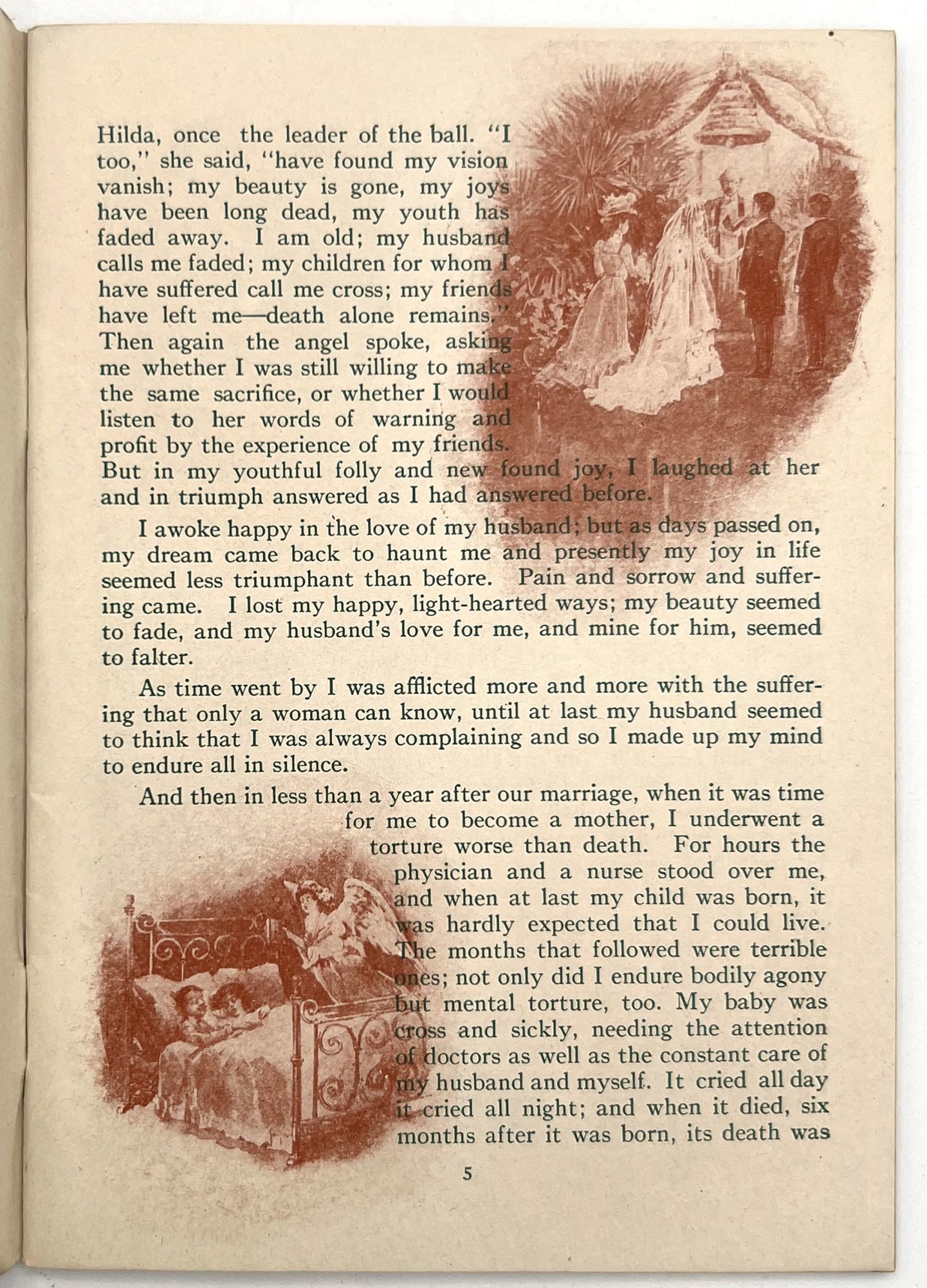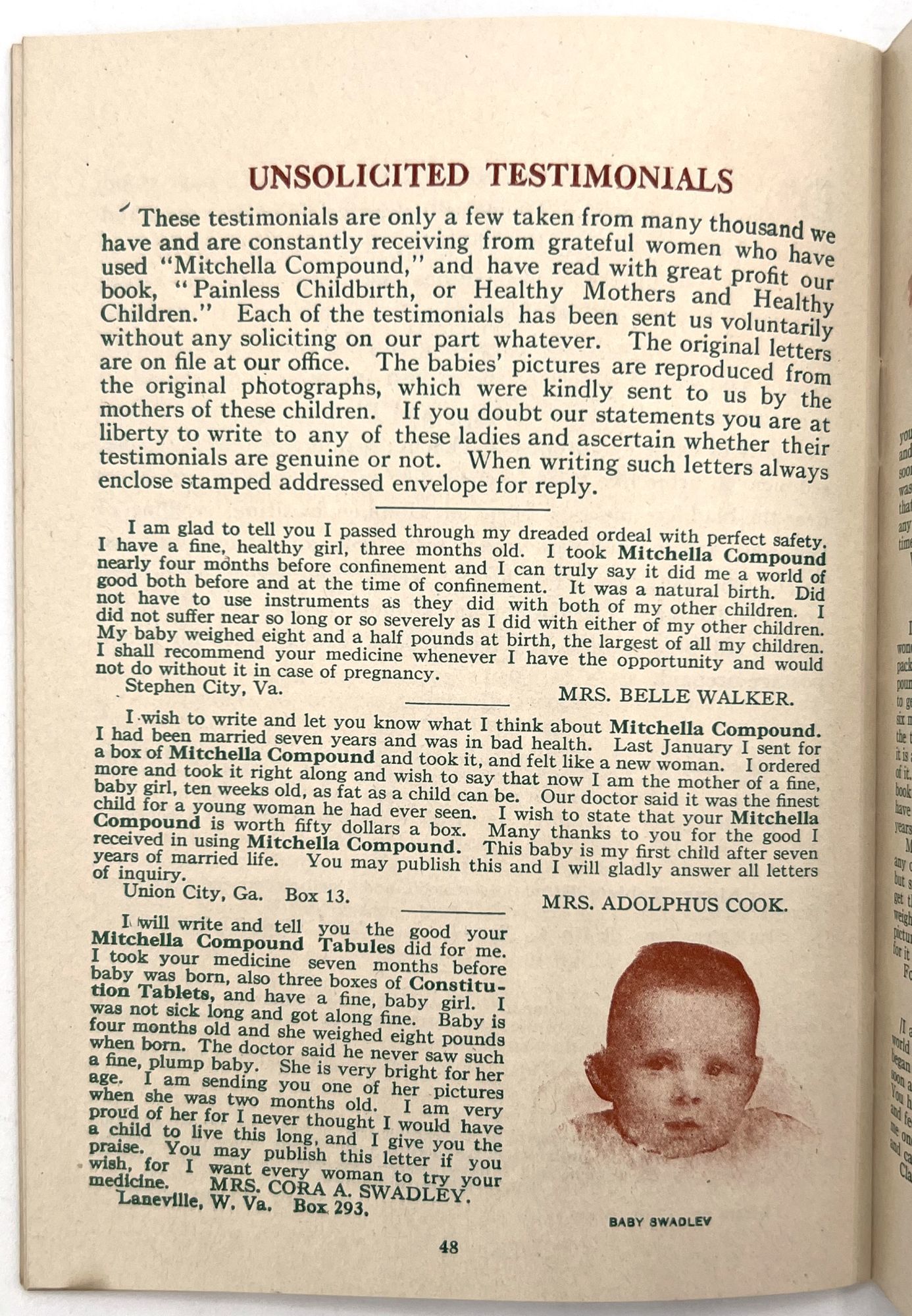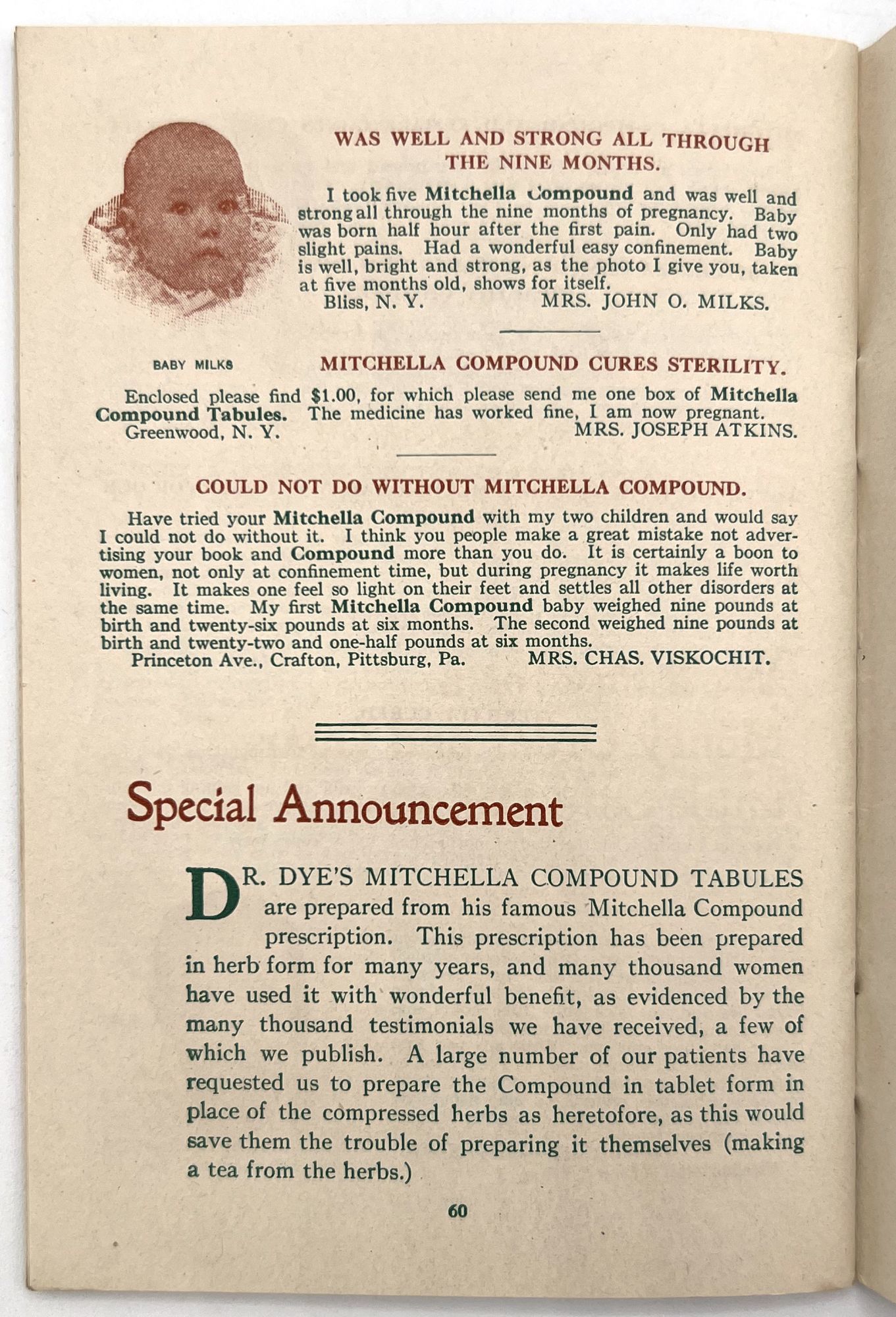 Following the "Story of Mrs. Dare" is several pages further describing the benefits of taking Mitchella Compound, focusing heavily on the trope of women who bring suffering upon themselves, and reinforcing the erroneous notion that sterility, pain, and "sickly" babies are the result of a woman's own failings. The final eight pages are comprised of testimonials punctuated by photos of healthy, cherubic-faced infants whose mothers presumably benefitted from the product. Single vol. (6" by 4.25"), pp. 64, illus., stapled in original illustrated self wrappers.