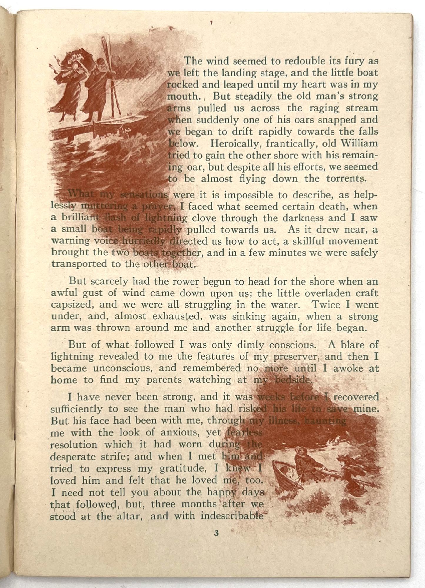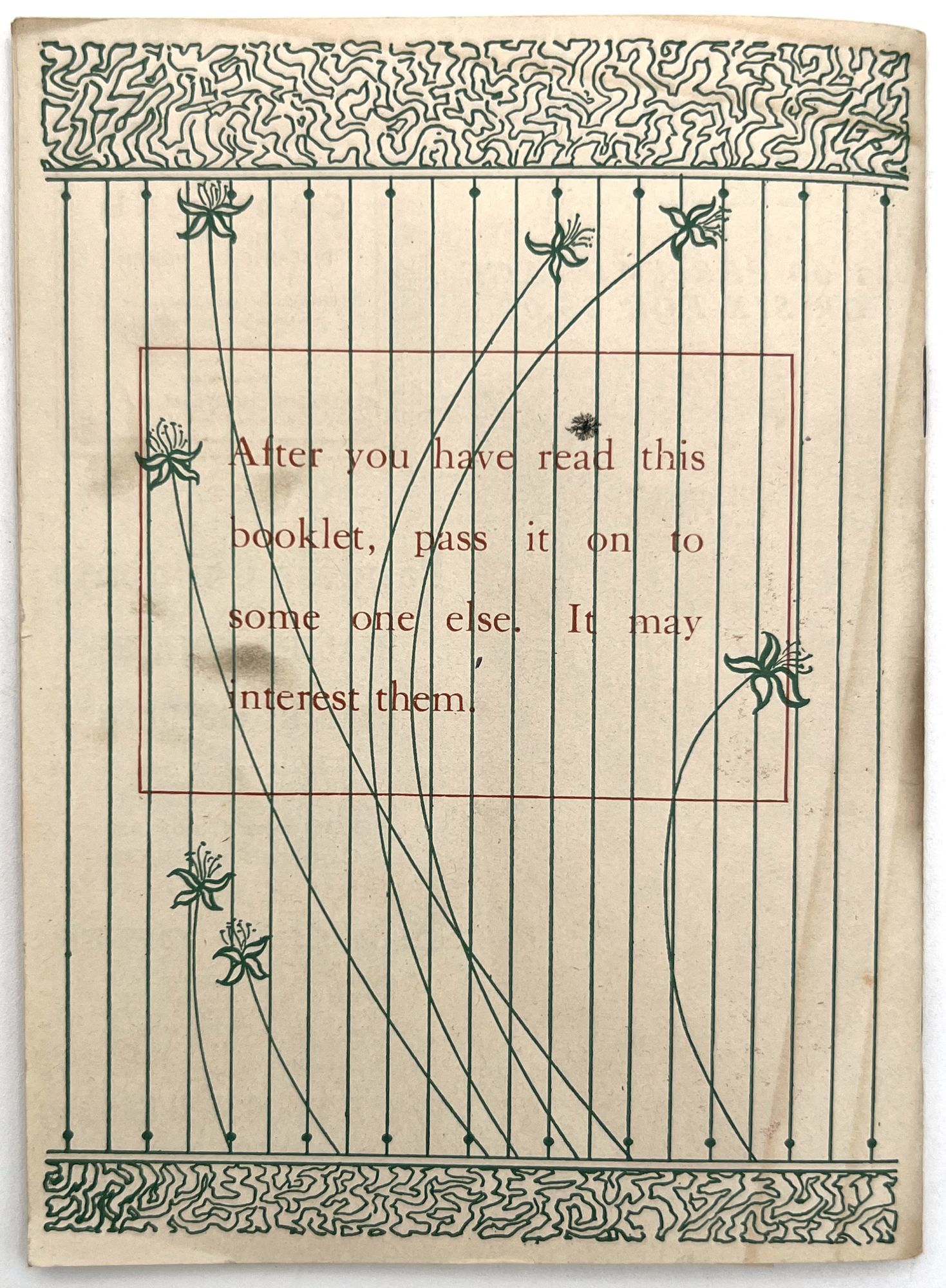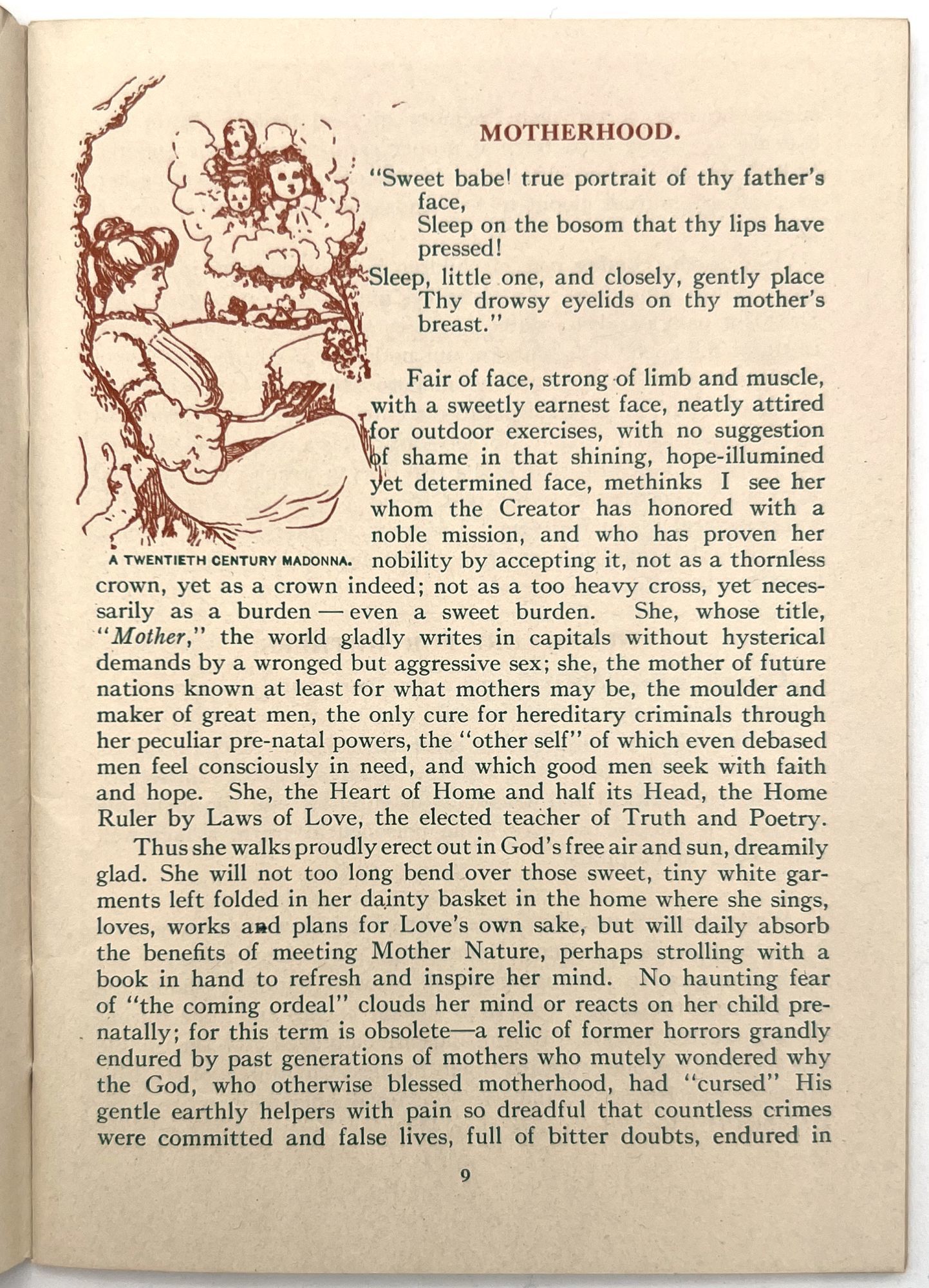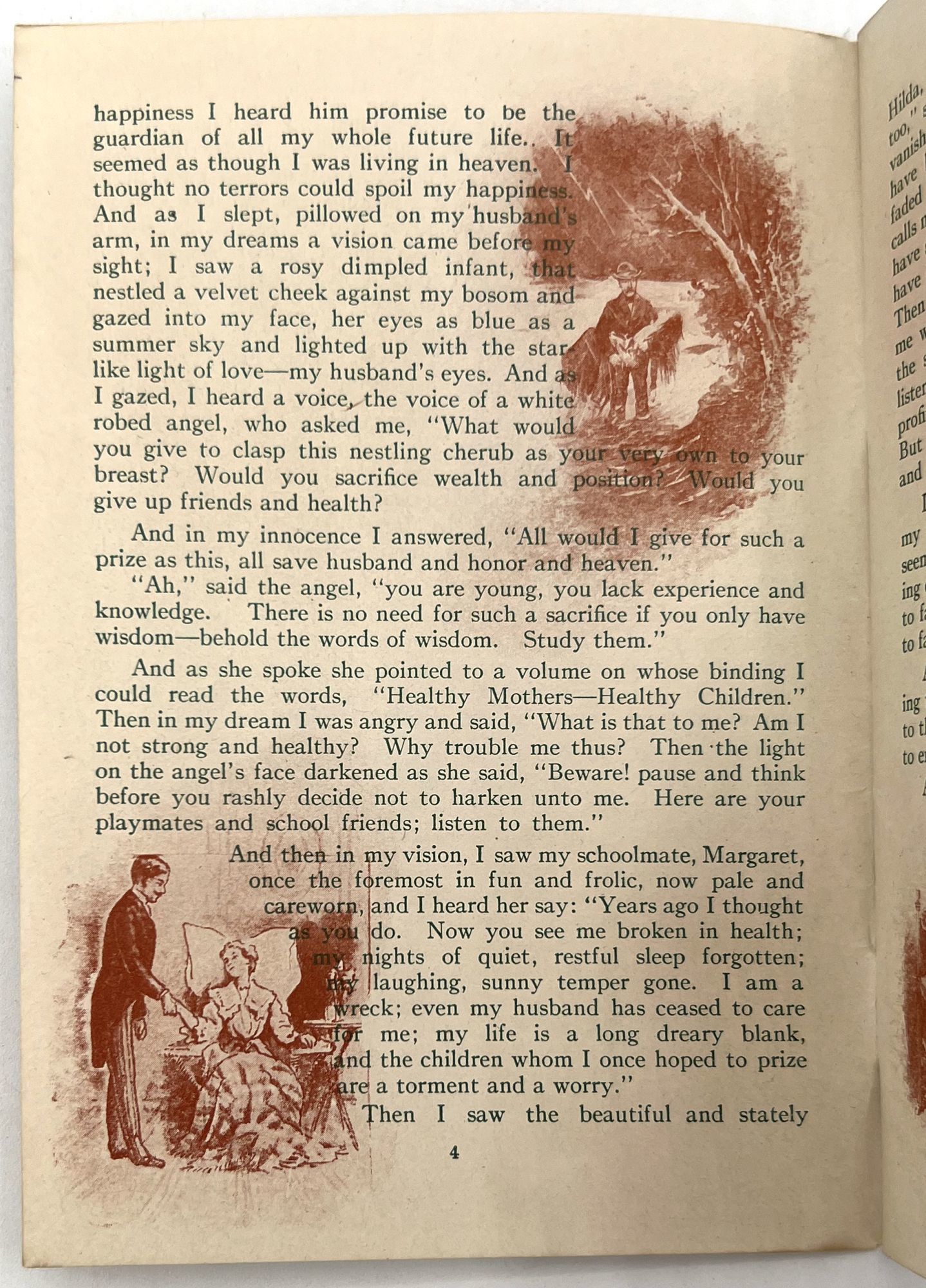Following the "Story of Mrs. Dare" is several pages further describing the benefits of taking Mitchella Compound, focusing heavily on the trope of women who bring suffering upon themselves, and reinforcing the erroneous notion that sterility, pain, and "sickly" babies are the result of a woman's own failings. The final eight pages are comprised of testimonials punctuated by photos of healthy, cherubic-faced infants whose mothers presumably benefitted from the product. Single vol. (6" by 4.25"), pp. 64, illus., stapled in original illustrated self wrappers.