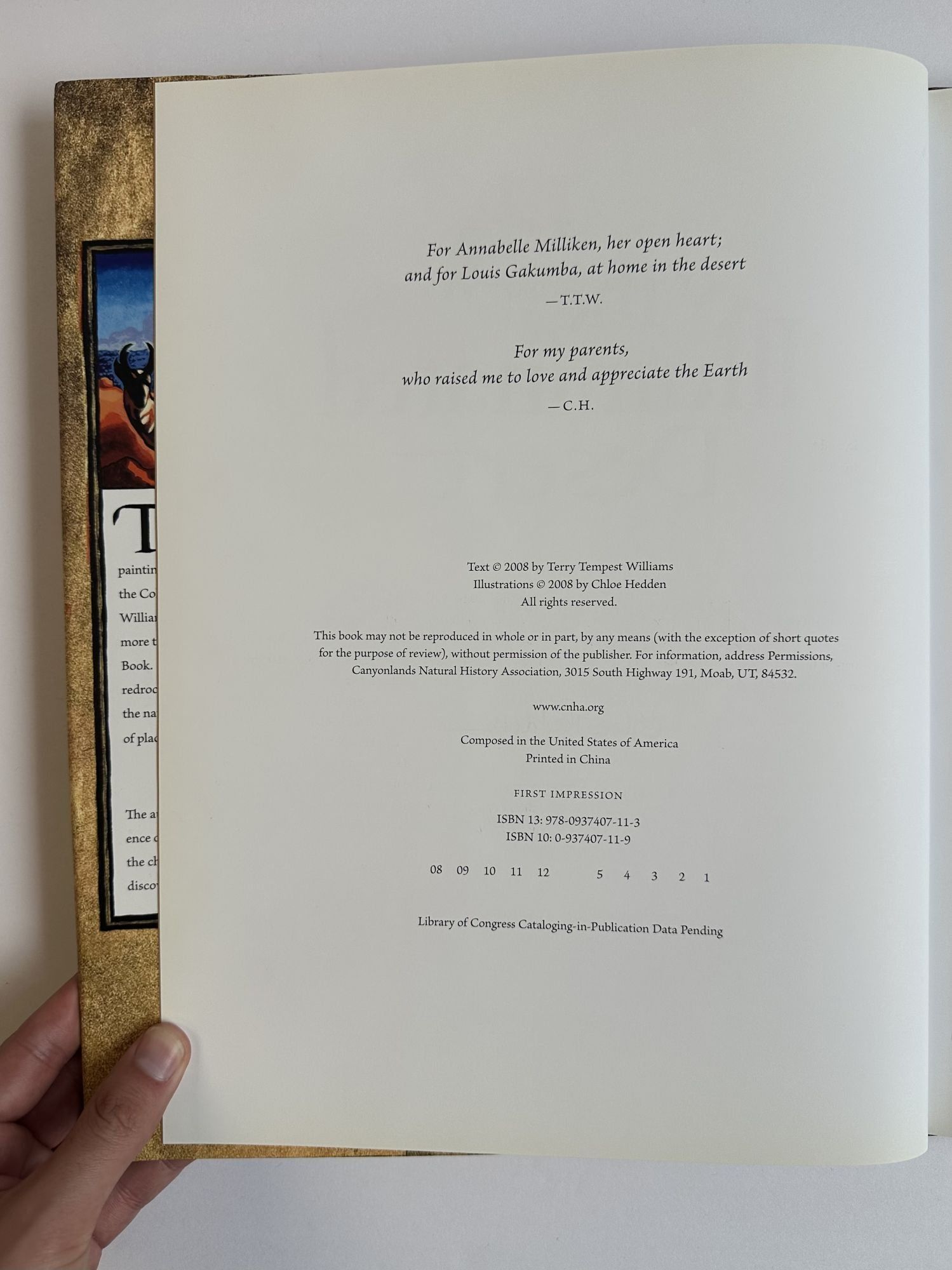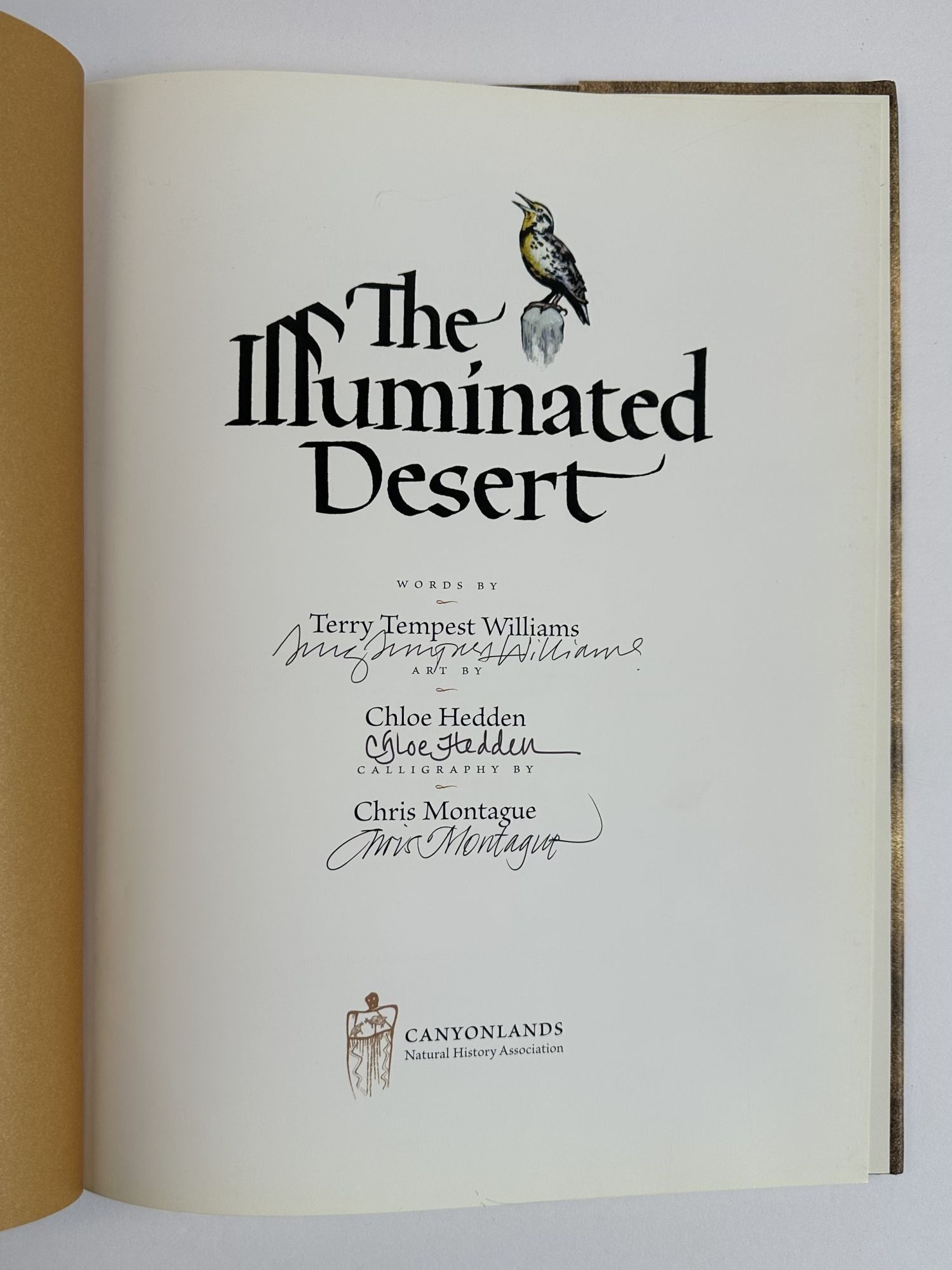 Moab, Utah: Canyonlands Natural History Association, 2008. First Edition, First Impression. Hardcover. Quarto, unpaginated. In Very Good condition with Very Good condition dust jacket. Spine is brown and black with light pink and white lettering. Boards have mild bumping to head fore corners. Signed flat on title page by Terry Tempest Williams [Author], Chloe Hedden [Illustrator], and Chris Montague [Calligrapher]. Shelved in Case 14. 1400230. Shelved Dupont Bookstore.