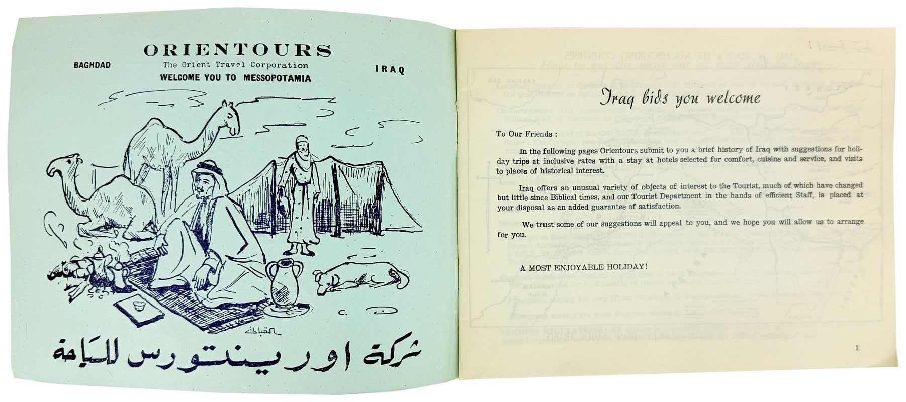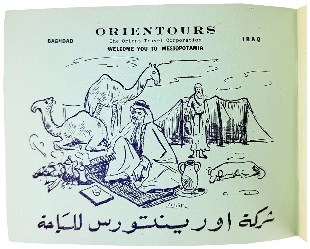 Unrecorded brochure by the Baghdad-based travel company Orientours, marketing two and three-day tours of Iraq and the Middle East for American and British travelers ("you will have no difficulty when using only English in Iraq"). The work opens with a short overview "How to get the most out of your visit to Iraq," including the country's characteristics, as well as passport, customs, and health regulations (smallpox health certificate required).