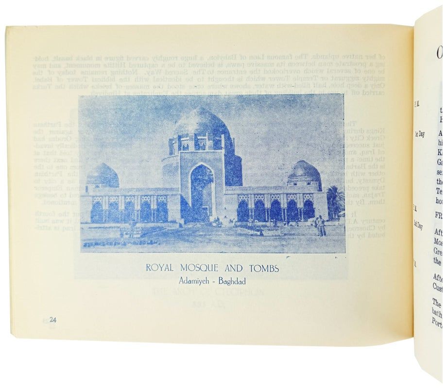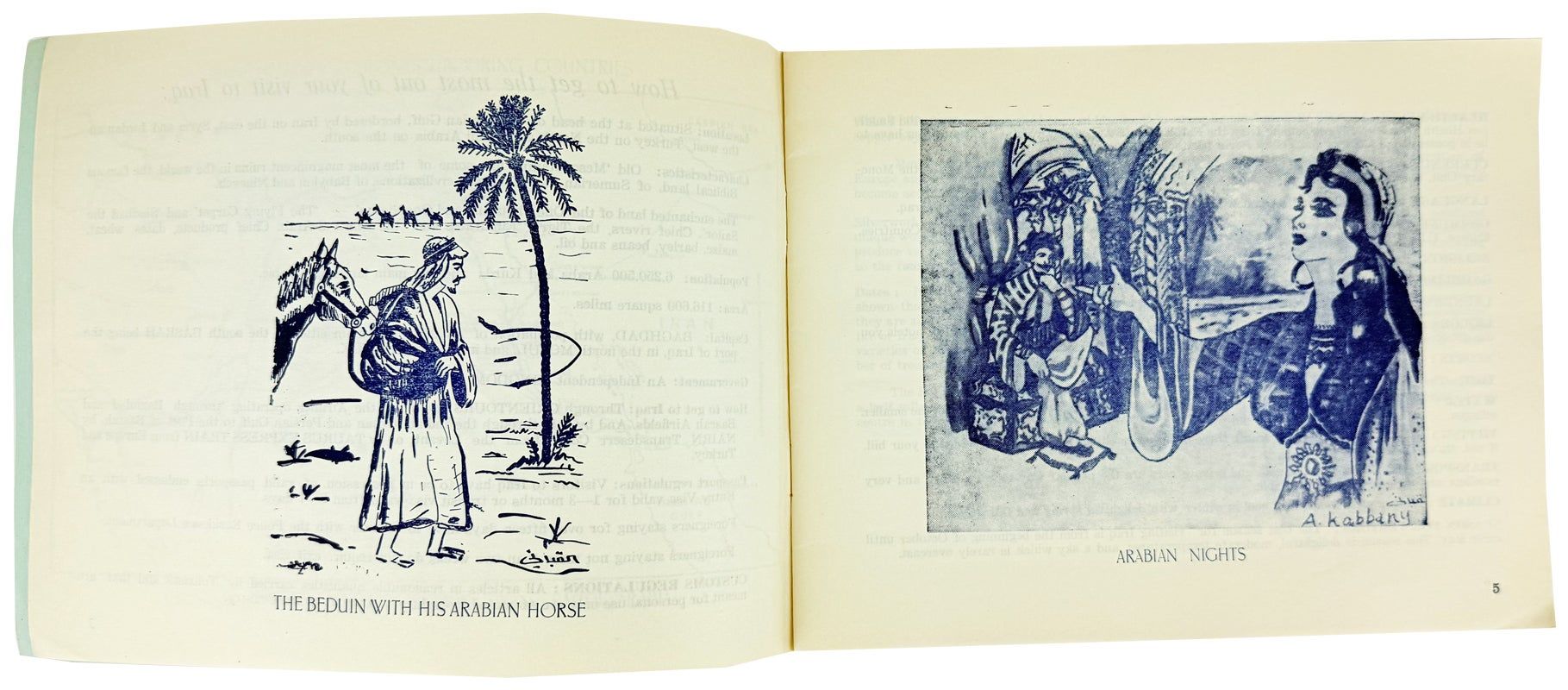 Baghdad, Iraq: Orientours, 1959. Very Good. Baghdad, Iraq: Orientours, [ca. 1959]. Oblong octavo (16.5x21cm); publisher's blue staple bound wrappers printed in dark blue; 52pp.; halftone photographs and illustrations throughout printed entirely in blue. Light soil and brief curling to wrapper margins, else a Very Good or better example. Date of publication based on newspaper appearances of Orientour advertisements, which began popping up in 1959.