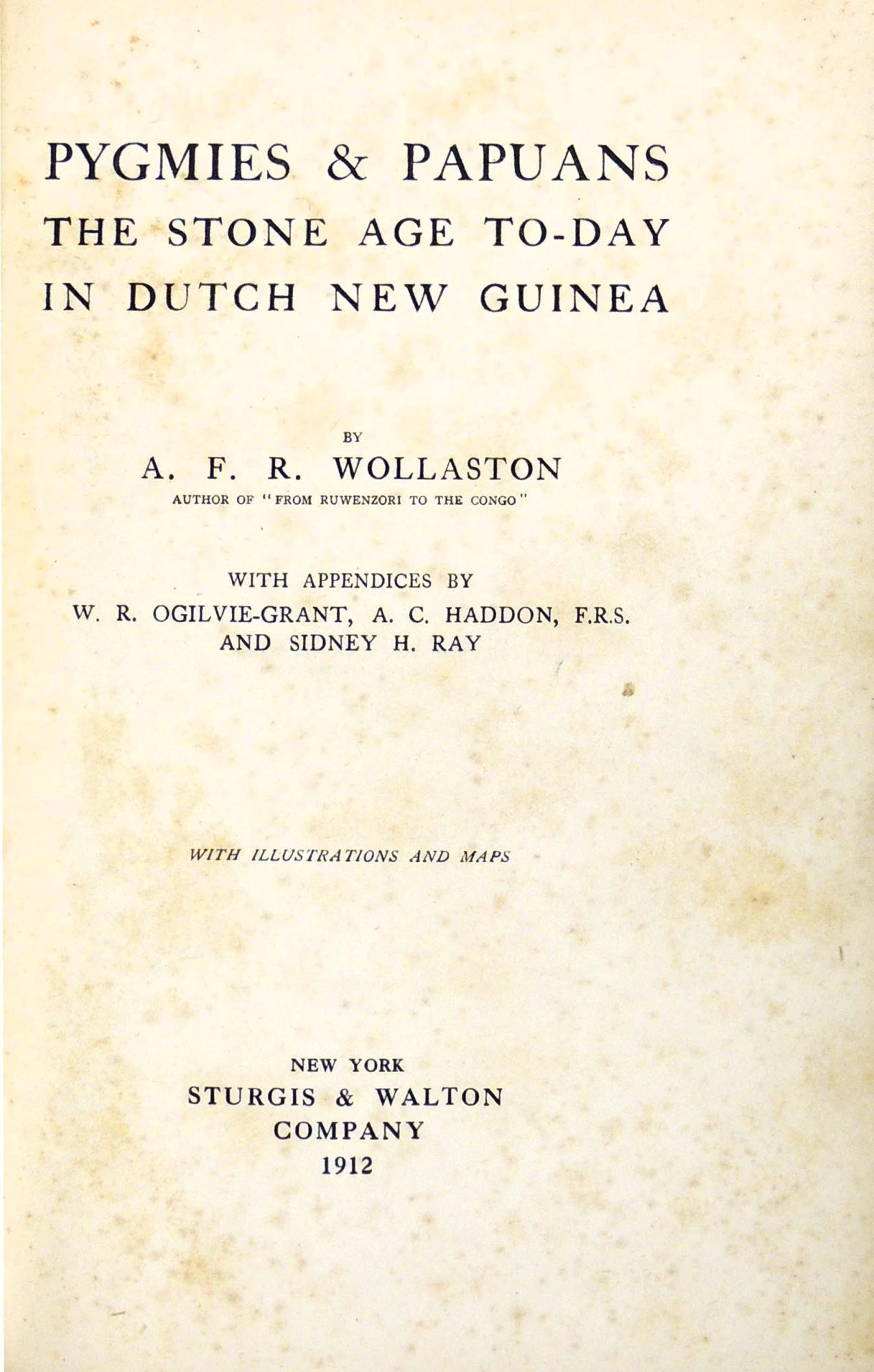 New York: Sturgis & Walton, 1912. Hardcover. Very Good. Hardcover. Alexander Frederick Richard Wollaston (1875 - 1930) was an English medical doctor, ornithologist, botanist, climber, and explorer. He participated in the British Ornithologists' Union Expedition to the Snow Mountains of Netherlands New Guinea in 1910-11 to climb the highest mountains and to collect biological and ethnological specimens; although, the expedition was largely unsuccessful due to problems with Dutch authorities. This book is Wollaston's account of the expedition. A few years later he led more successful expedition to New Guinea and in 1921 he took part in an expedition to Mount Everest. He won several medals and awards for his expeditions. Sadly, he was fatally shot by a student after accepting a position as tutor at King's College, Cambridge (Wikipedia).