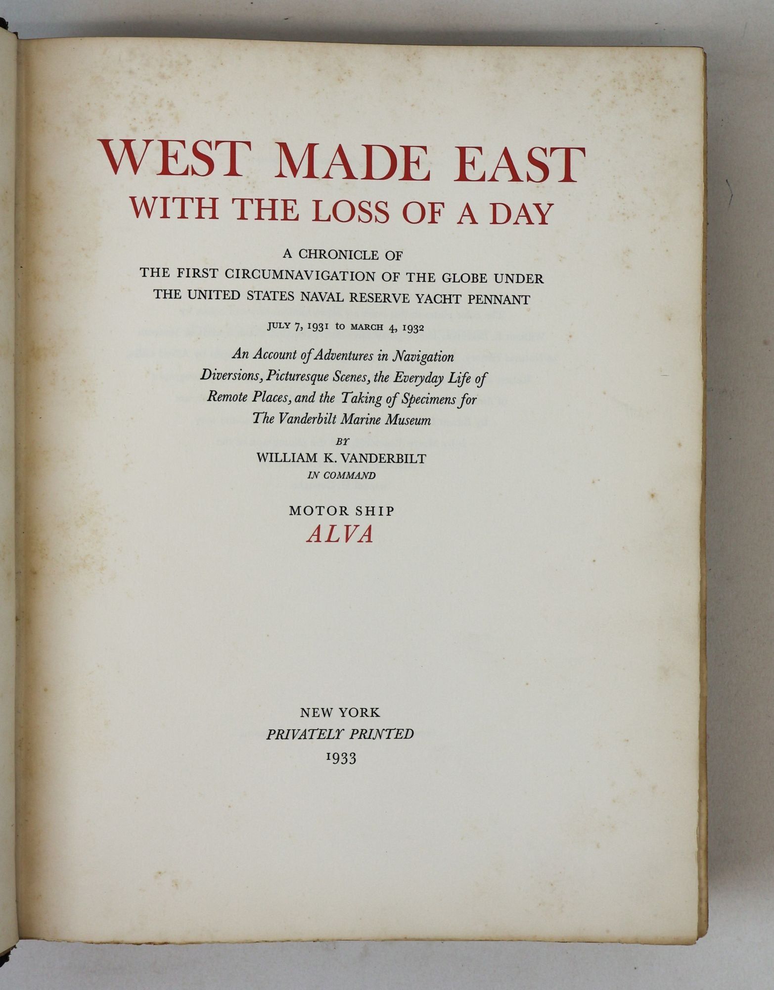 WEST MADE EAST WITH THE LOSS OF A DAY; A CHRONICLE OF THE FIRST CIRCUMNAVIGATION OF THE GLOBE UNDER THE UNITED STATES NAVAL RESERVE YACHT PENNANT; JULY 7, 1931 TO MARCH 4, 1932; AN ACCOUNT OF ADVENTURES IN NAVIGATION DIVERSIONS, PICTURESQUE SCENES, THE EVERYDAY LIFE OF REMOTE PLACES, AND THE TAKING OF SPECIMENS FOR THE VENDERBILT MARINE MUSEUM [Signed]