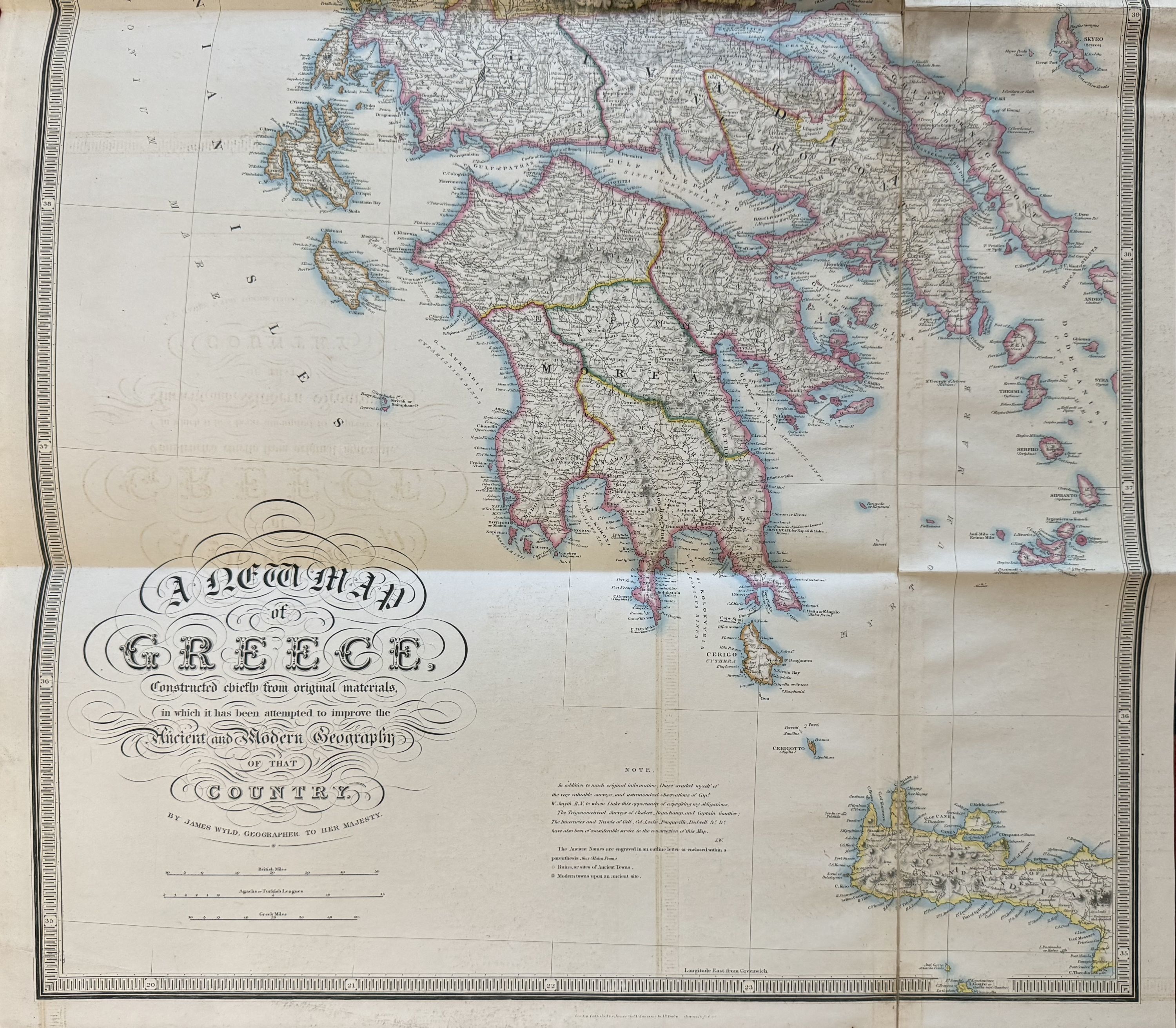 This oversized map of Greece published in 1845 displays an impressive compilation of cartographic information from various sources listed. Wyld notes "In addition to much original information, I have availed myself of the very valuable surveys and astronomical observations of Captain W. Smyth, R.N. to whom I take this opportunity of expressing my obligations. The trigonometrical surveys of Chabert, Beauchamp, and Captain Gauttier [Galthier de Rigny]; the itineraries and travels of [Sir William] Gell, Col. Leake, Pouqueville, Dodwell &c. have also been of consideration service in the construction of this map." Extensively detailed, the map shows cities, towns, rivers, roadways, islands, mountains, and ports. Topography is depicted by hachure. In very good condition, with minor offsetting and original fold lines as issued. Vertical fold line along the right side reinforced with original linen, with some minor splits at intersections of fold lines.