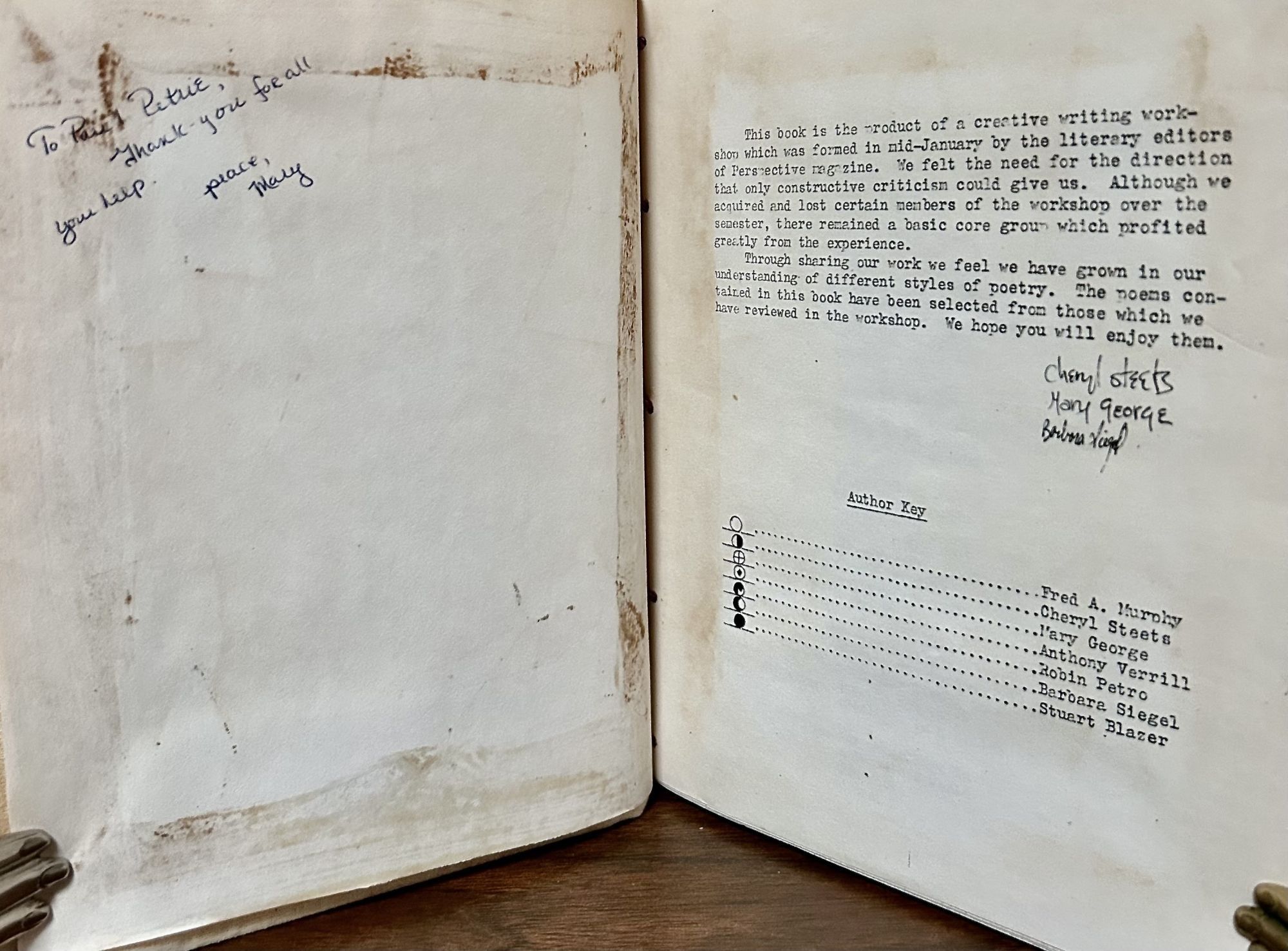 Np: Np, Np. Hardcover. Fine. 28 leaves. 22.5 x 19 cm. Signed in ink by Cheryl Steets, Mary George & Barbara Siegel. Signed presentation copy to Paul Petrie and signed by Mary George. Poetry printed recto only. Hand-bound in full cream cloth with lavender spine cotton cloth stitching. It may perhaps be the only copy -- product of a creative writing workshop by the literary editors of Perspective Magazine.