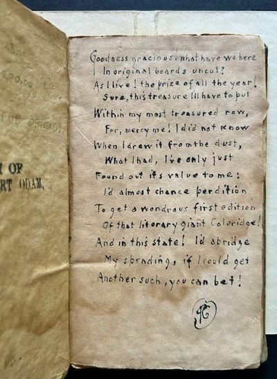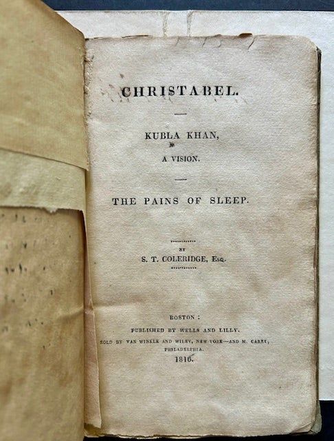 Boston: Wells and Lilly, 1816. Original boards. Good +. The uncommon 1816 1st American edition. The first appearance in The States of these 3 important poems by Samuel Taylor Coleridge (1772-1834), a towering figure in late 18th/early 19th century British poetry and Romanticism. Still in the publisher's original green/gray boards, with handwritten title ("Christabel") to the spine. A presentable, fairly well-preserved copy of a diminutive, fragile book: Good to Good+ only but still solidly bound in its original string-ties. Minor loss at the spine ends (perhaps 3/4" all told), light, forgiveable staining to the boards. Staining to the front pastedown and the front free endpaper as well, discreet former owner stamp at the FP. A curious, wonderful handwritten poem as well singing the praises of this "wondrous first edition" along the front free endpaper. And finally, the half-title page neatly cut in half (or more), missing the lower 50%-60% of the page. 16mo, deckled edges, all signatures cut (making the text completely readable as is). Very scarce in this 1816 original printing out of Boston.