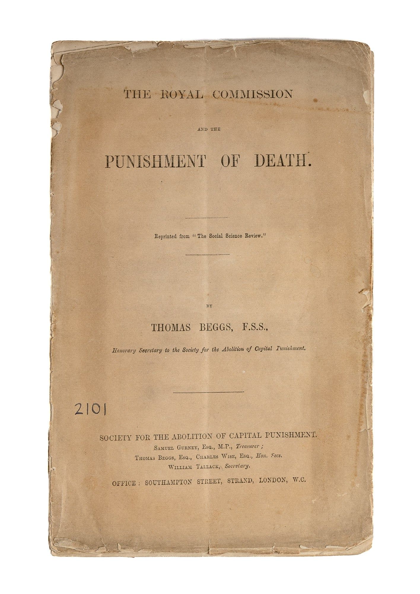 1866. Rare Victorian-Era Pamphlet on the Reduction of Capital Offenses Beggs, Thomas [1808-1896]. The Royal Commission and the Punishment of Death. Reprinted From "The Social Science Review." London: Society for the Abolition of Capital Punishment, [c.1865]. 19 pp. Octavo (9-1/2" x 6"). Stab-stitched pamphlet in printed wrappers, which are detached, lightly soiled and edgeworn. Moderate toning to interior, light soiling and moderate edgewear to margins. $100. * Only edition. The Royal Commission on Capital Punishment met from 1864 to 1866. The commissioners failed to reach a consensus about its abolition, but it suggested a number of reforms, including the abolition of public executions, that were later enacted into law. Beggs was the honorary secretary of the Society for the abolition of Capital Punishment and one of the experts who addressed the Commission. His article discusses its work and offers a series of suggestions for the reduction of capital punishments. OCLC locates 4 copies (British Library, London School of Economics, University of Essex, University of Heidelberg). Library Hub adds 2 more (University of Cambridge, University of Sheffield). No copies located in North America. British Museum Catalogue (Compact Edition) 2:765.