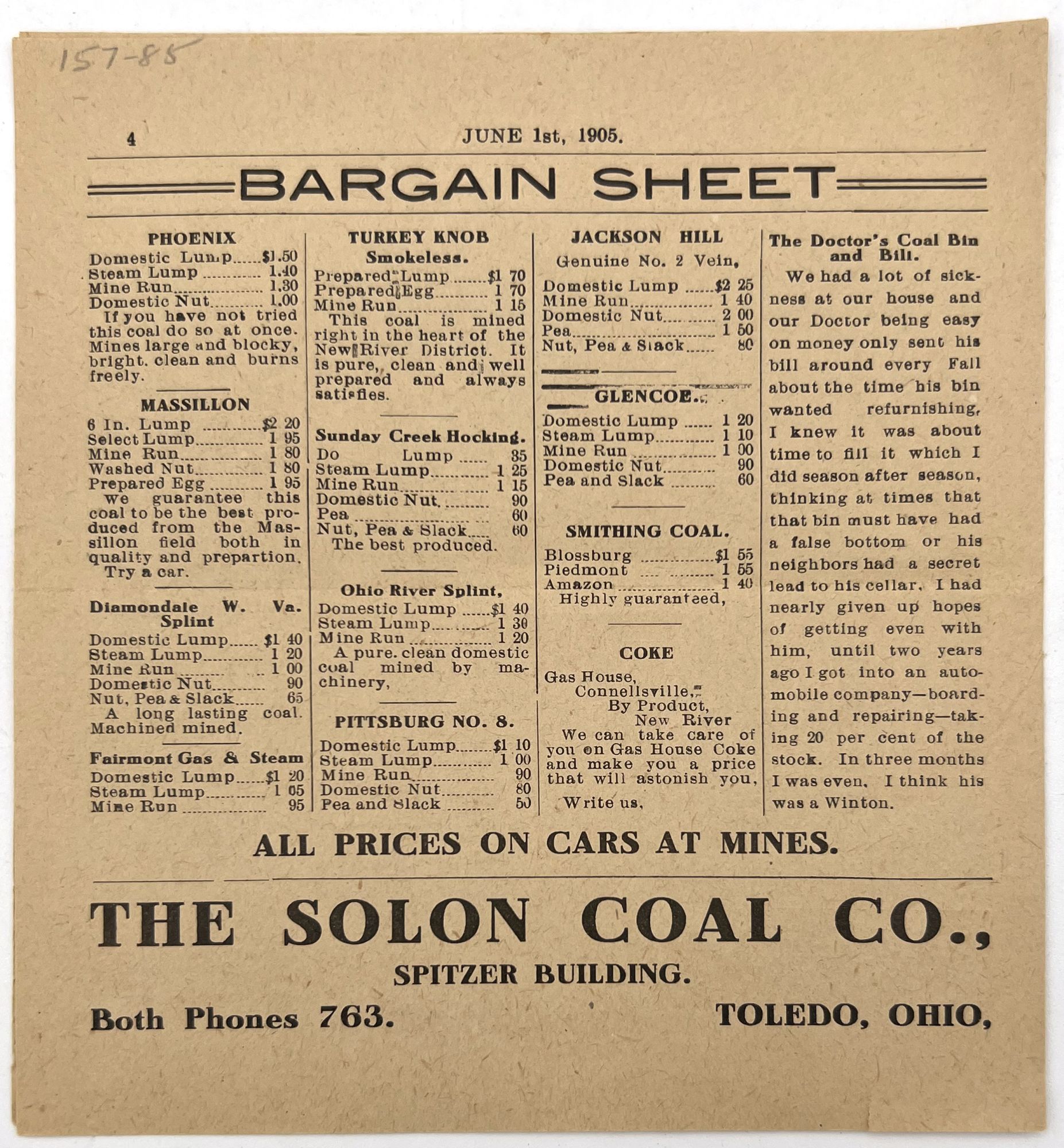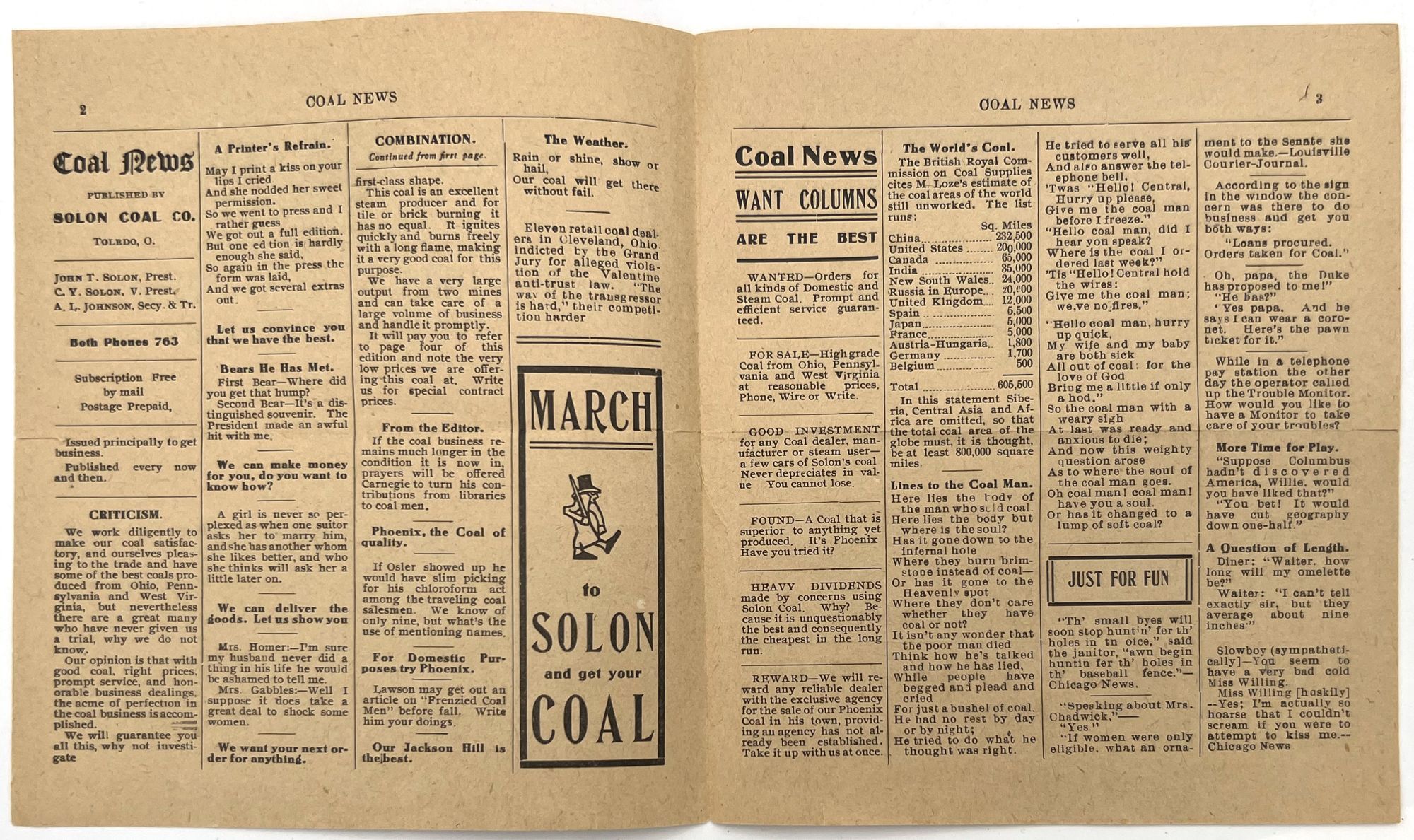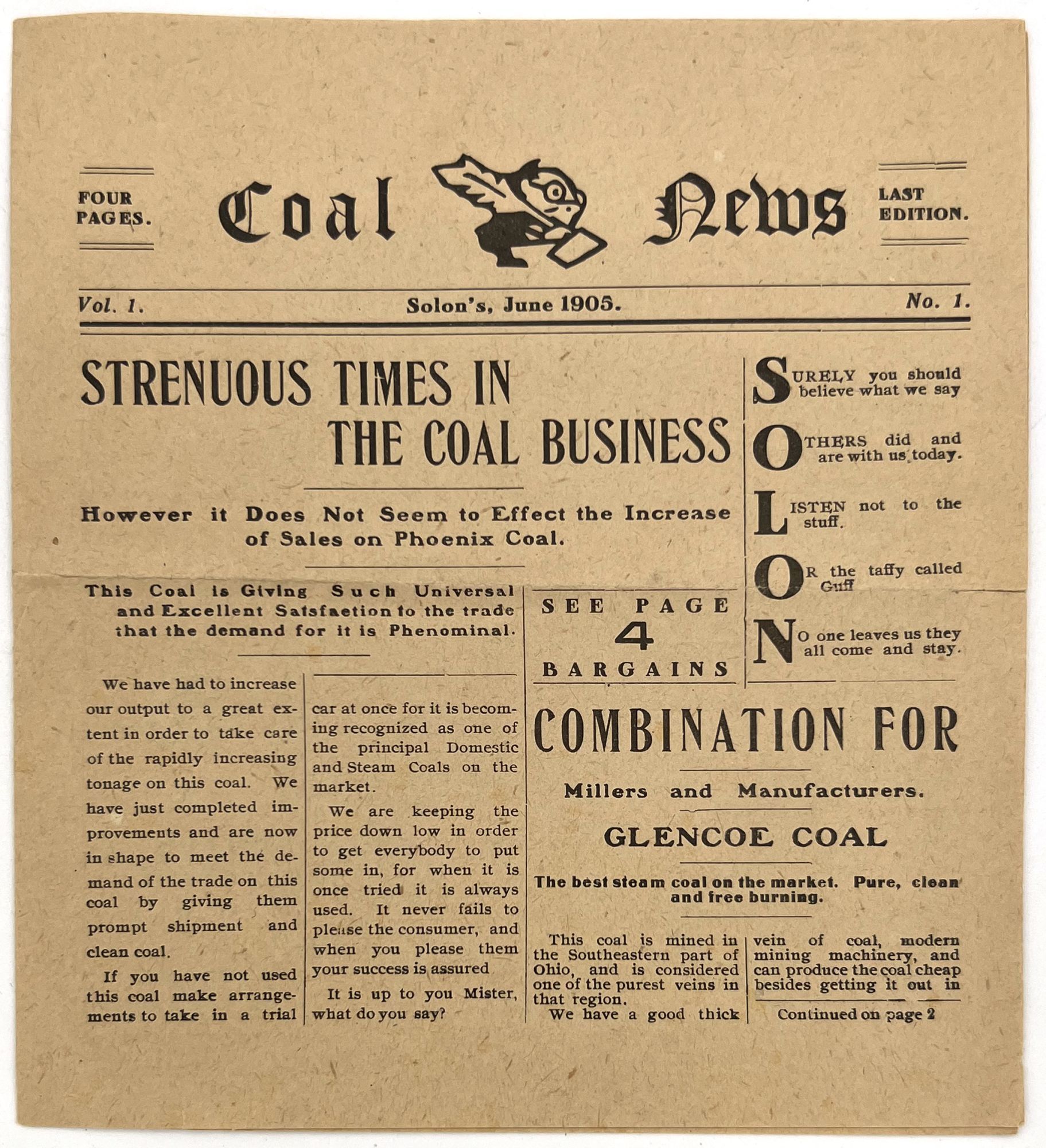 Toledo, Ohio: Solon Coal Co, 1905. Very good. Toning, short tears, horizontal letter fold.. Printed advertisement for The Solon Coal Co., mimicking the format and style of a newspaper. Includes columns praising the product, jokes and amusing poems, and even a coal-themed weather report: "Rain, or shine, snow or hail, Our coal will get there without fail." Features a "Bargain Sheet" on the last page with coal prices. Printed bifolium (6.25" by 5.75"), pp. 4, a couple in-text illus. including cartoon newspaper man on front page.