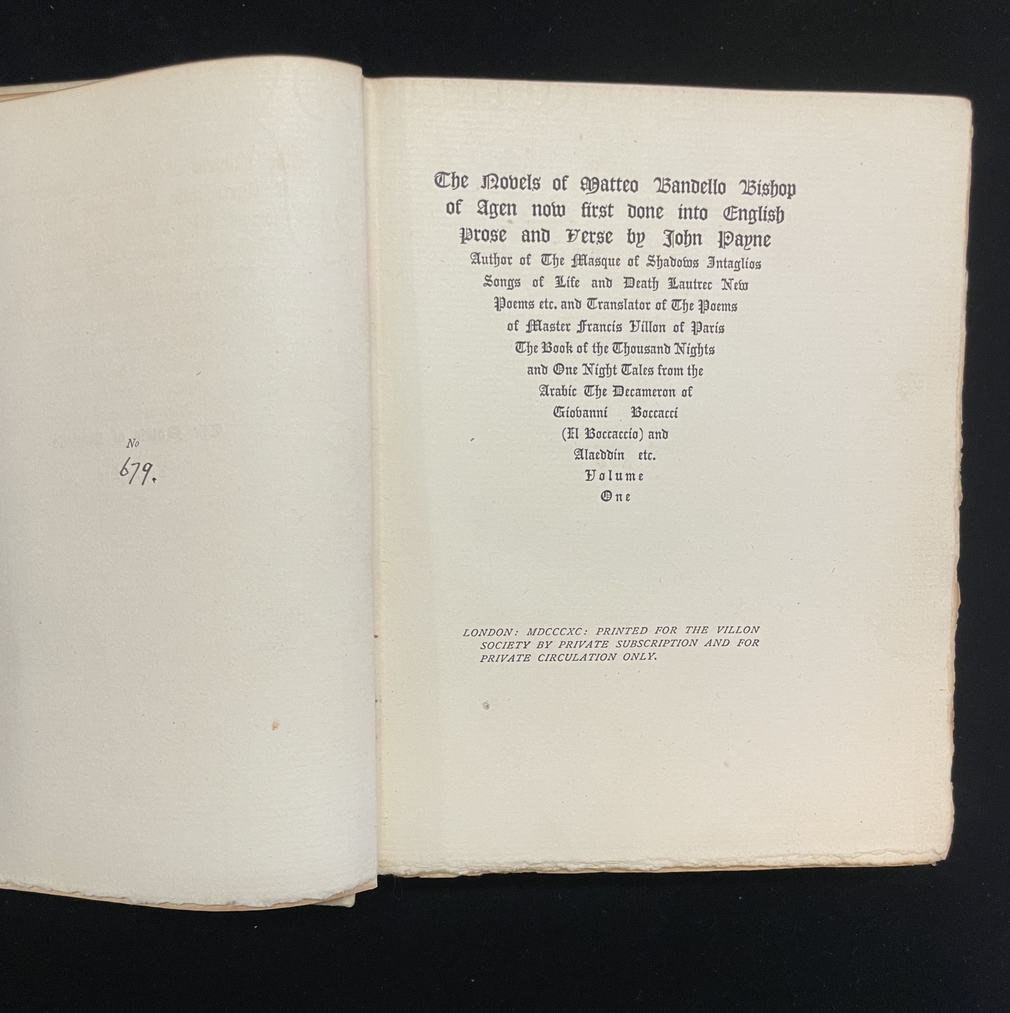 THE NOVELS OF MATTEO BANDELLO BISHOP OF AGEN NOW FIRST DONE INTO ENGLISH PROSE AND VERSE BY JOHN PAYNE... (6 volumes complete)
