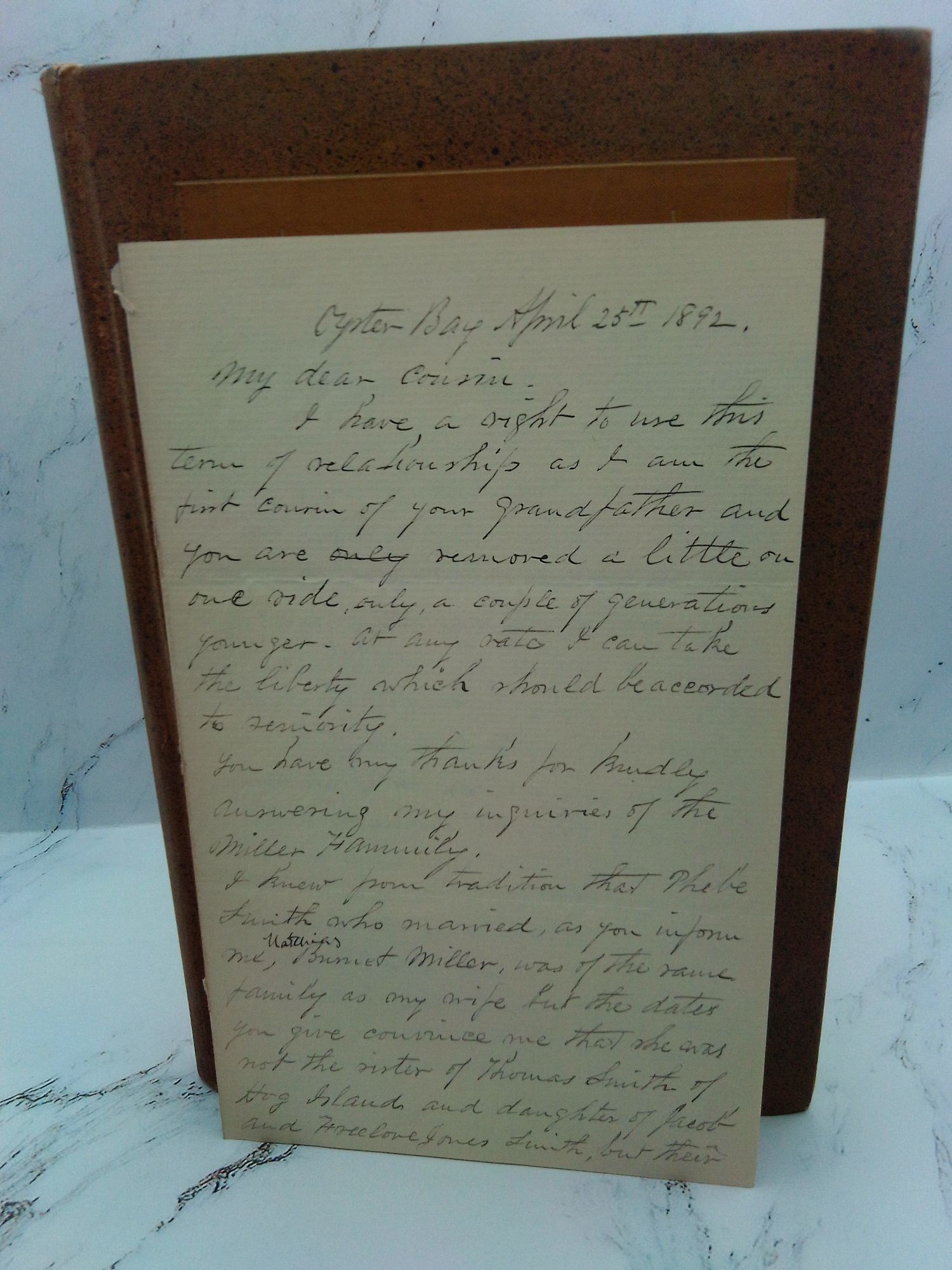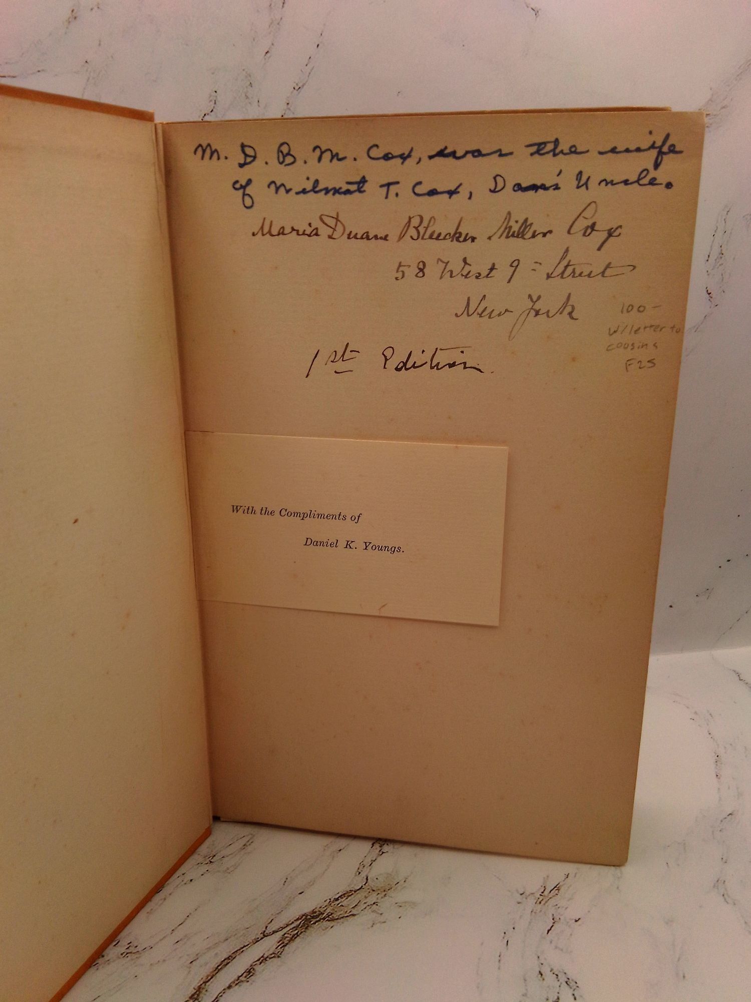 Oyster Bay: Privately Printed, 1890. Hardcover. Octavo, 142 pages. In Good condition. Bound in the publisher's brown cloth bearing gilt lettering to the front. Boards have moderate wear including faint scratches/scuffs and some chipping to the edges. Cocked spine. Text block has moderate wear including age toning to the edges with offsetting to the end papers. Slight age toning to the interior. Several instances of notations/marginalia to the interior. Gift inscription to the front free end paper. Adhesive residue to the gutter at the dedication page. Partial sticker remnant to the rear end paper. "With Compliments of Daniel Youngs" card tipped in. Illustrated. Includes a letter to cousins laid in.