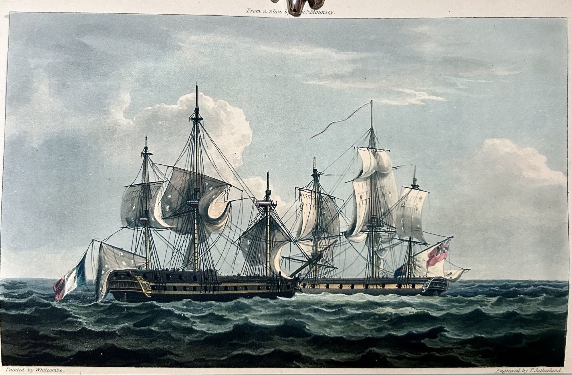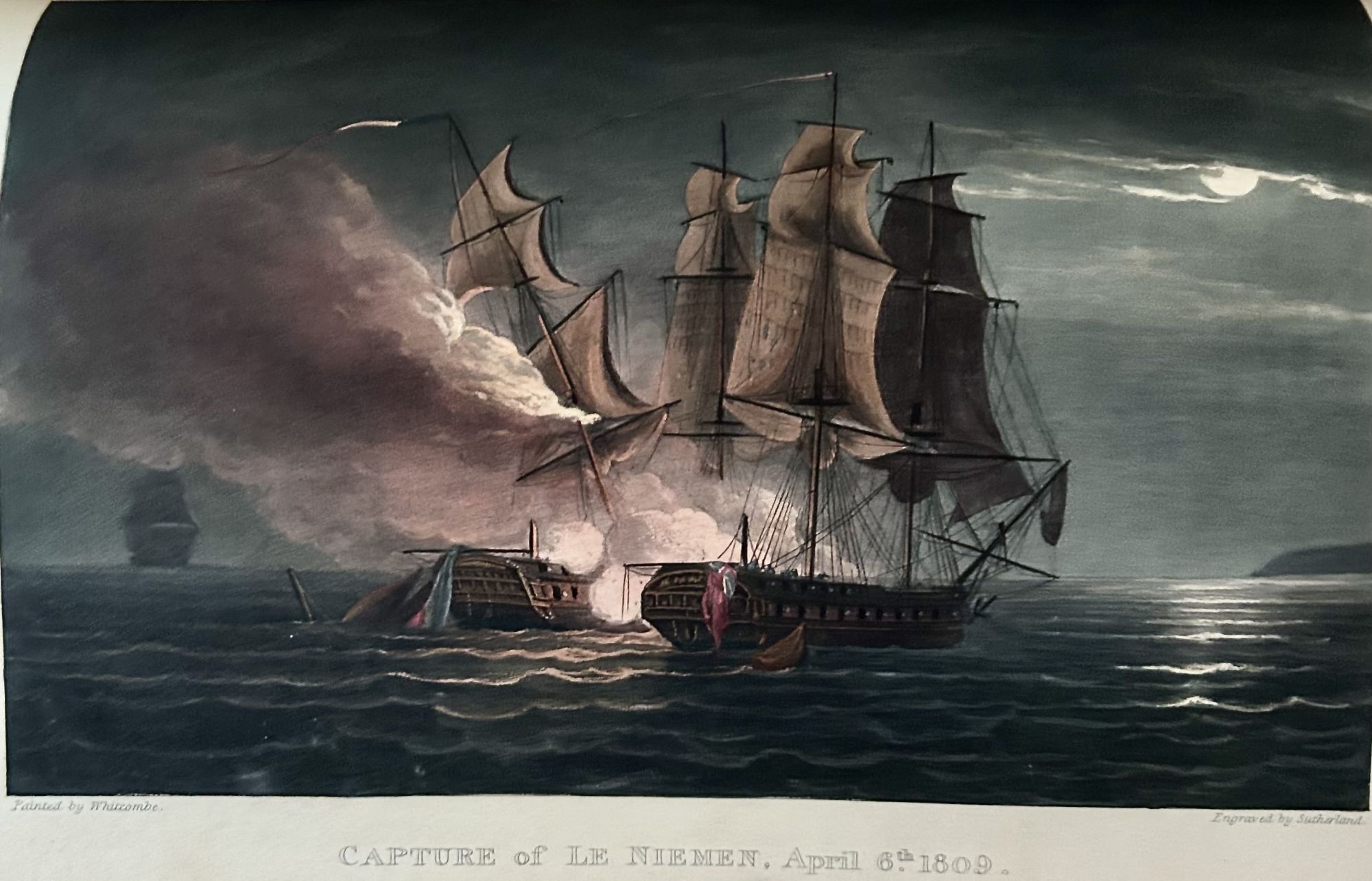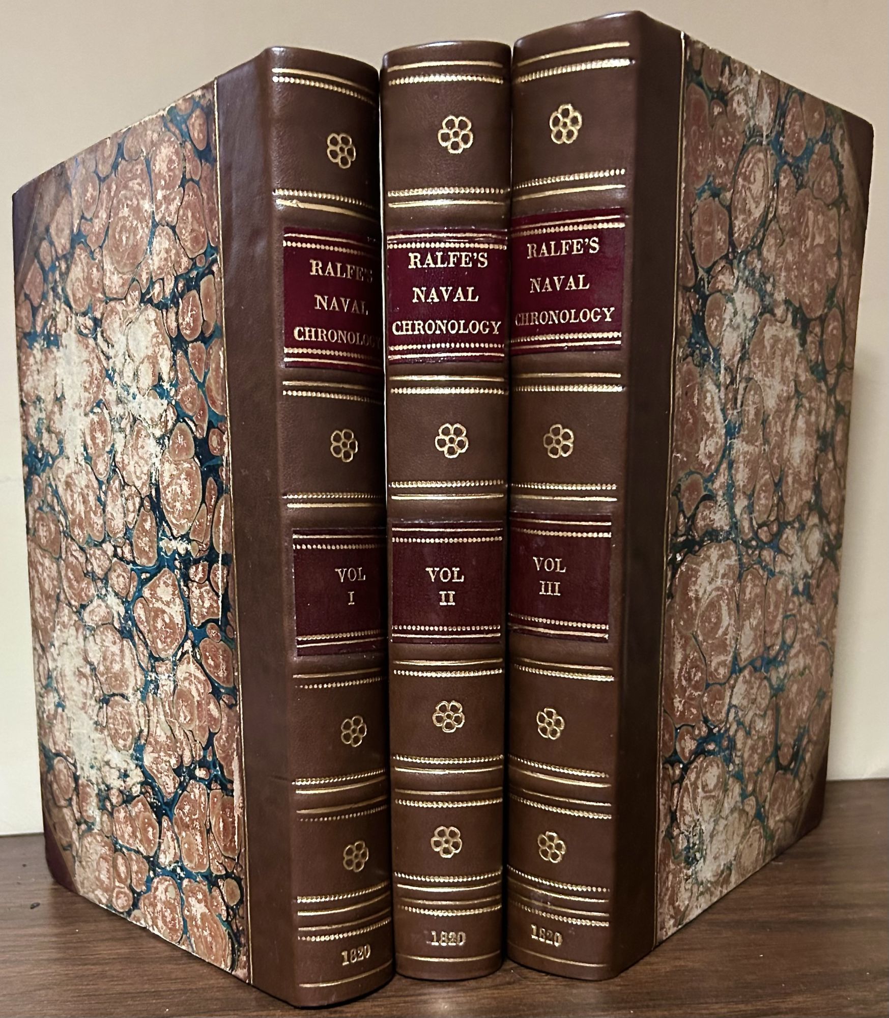 London: Whitmore And Fenn, 1820. First edition. Hardcover. Three quarter brown calf and marbled boards with matching marbled endpapers. Very good. 3 vols. 288, 284, 320 pages. 25.1 x 17.2 cm. Hand colored portrait frontispiece of the Prince Regent (vol. 1), 2 aquatint frontispieces of naval monuments (vols. 2 & 3). and 57 very fine hand colored aquatint plates by T. Sutherland, F. C. Lewis, D. Havell and others after T. Whitcombe, J. Beresford, W. A. Armstrong, J. Gore, W. Hill and others, list of subscribers in first volume, list if plates in third volume. HRH George Augustus Frederic, Prince Regent, was the dedicatee of the work and heads the list of subscribers. The exceptionally fine plates were based on drawings made by officers who participated in the the actions. The aquatints were available both uncolored and colored by hand. The present copy has a number of plates with headlines and captions printed in blue, which Abbey cites as a requirement for "genuine coloured copies.” Interior contents clean with some slight offsetting of plates to text. Small brown leather armorial bookplate of Valentine Hollingsworth lettered in gilt inside front cover of all three volumes. Raised bands. maroon leather spine labels lettered in gilt. Covers slightly rubbed. Rebacked. ABBEY LIFE. 342 SABIN 67602. TOOLEY 392.