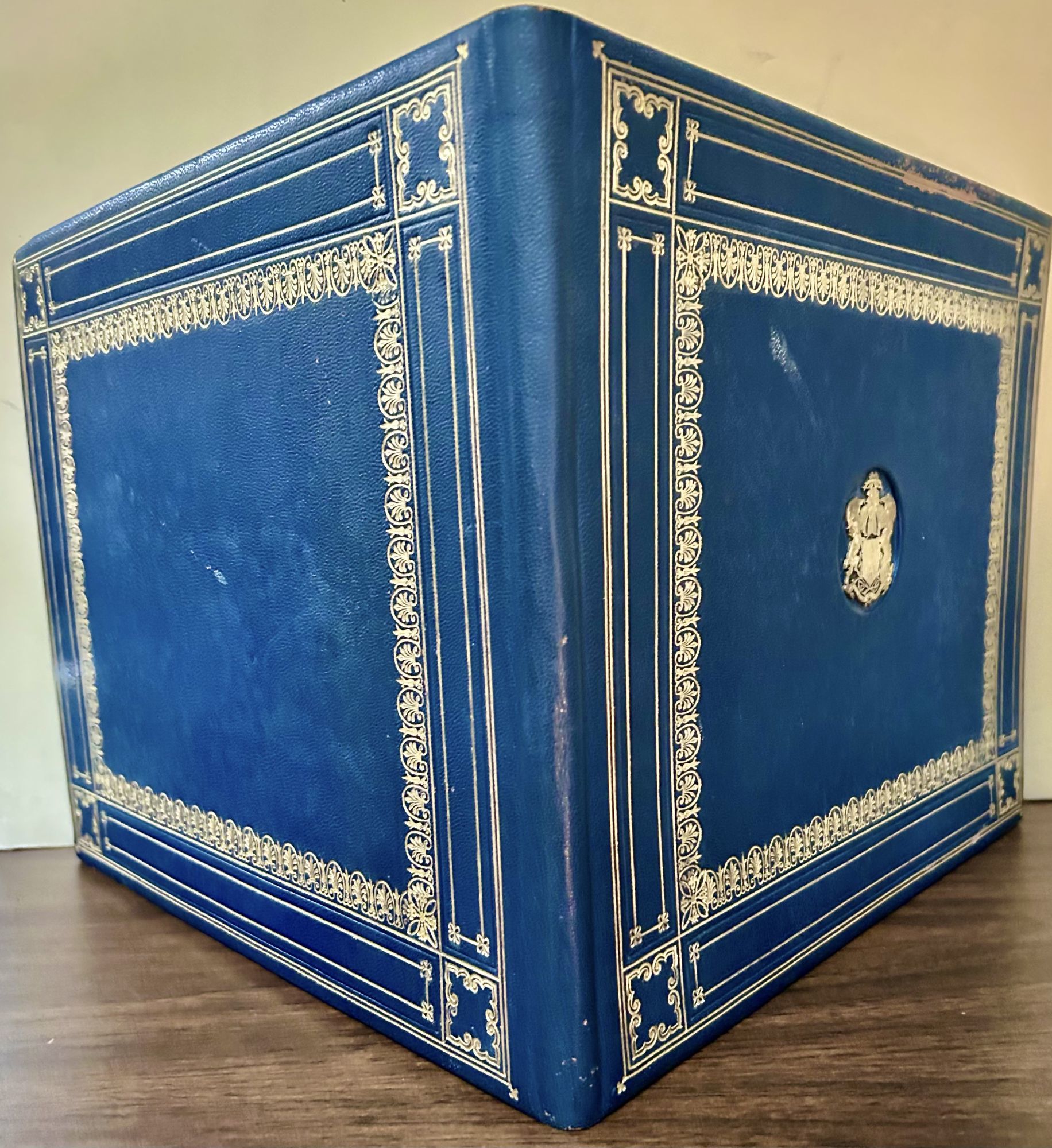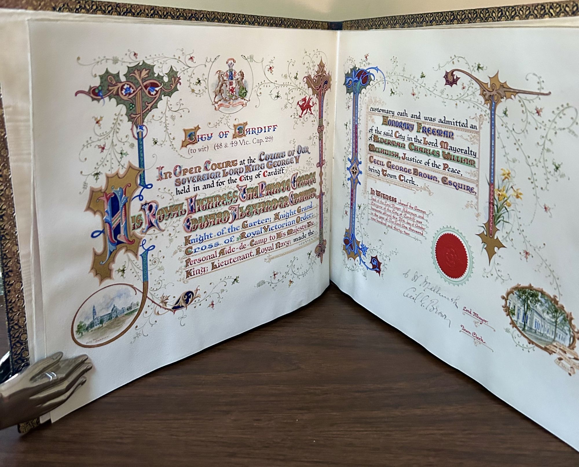 Cardiff: City of Cardiff, 1932. First edition. leather_bound. Navy morocco decorated in multiple designed gilt and emblem features both front and back covers. Two pages. 25.5 x 32.5 cm. A calligraphic tribute to the visit of Cardiff, a two page varicolored manuscript certificate. Presented by Cardiff to His Royal Highness Prince George Edward Alexander Edmund. He was named honorary Freeman. Signed in ink by the Lord Mayor and the Town Clerk. An exemplary sample of calligraphic art. Silk moire endpapers, inner dentelles in elaborately decorated covers.