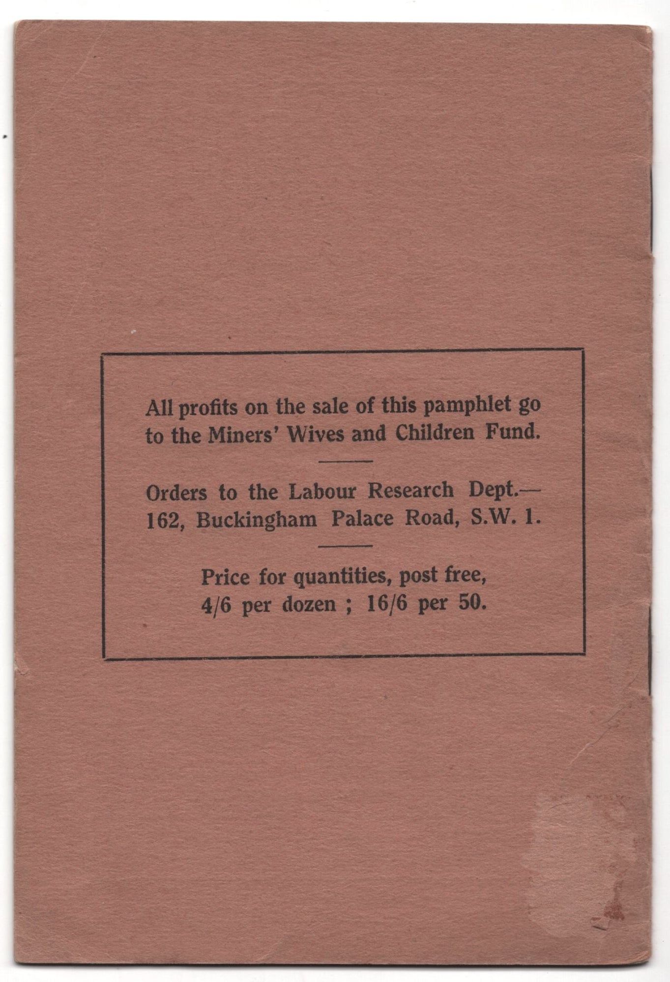 London: Printed and published for A. J. Cook by the Co-operative Printing Society Ltd., 9-11, Tudor Street, New Bridge Street, E.C. 4, 1926. Pamphlet. Very Good. 24 pp. Duodecimo [18 cm]; saddle-stapled in brown printed wrappers. Small abraded area at bottom corner of the rear wrap (measures less than one square inch). Bit of creasing and wear around edges, else a nice and clean copy. From the rear cover: "All profits on the sale of this pamphlet go to the Miners' Wives and Chidren Fund. Orders to the Labour Research Dept.—162, Buckingham Palace Road, S.W. 1. Price for quantities, post free, 4/5 per dozen; 16/6 per 50." Ads for other Labour Research Department publications on the inside rear wrap.