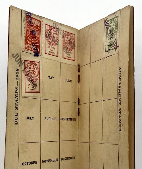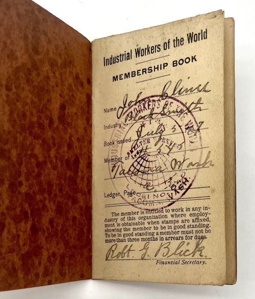 Industrial Workers of the World, 1907. Ephemera. Very Good. 8pp. [10.5cm]. 1/4 black cloth over brown card stock. The I.W.W. logo is stamped in black ink on the cover. The four pages (one sheet) marked "Dues" are detached but present. John Clince was an Irish American blacksmith in Tacoma, Washington. Clince belonged to union no. 545 (Smelting). He was admitted on transfer from a defunct Smelter's union. His membership card was issued on July 5, 1907, in the very early years of the I.W.W. and during the 1907 Tacoma Smeltermen's Strike. The strike began on March 30 and ended on August 12, with the goal of a 50¢ pay increase. Clince's membership is recorded, by due stamp and ink stamp, until June 19, 1908.