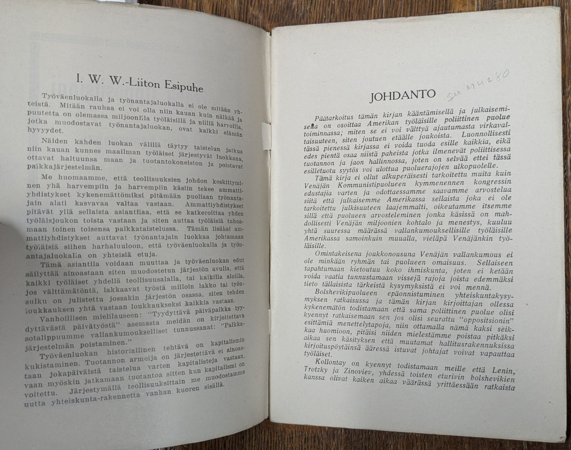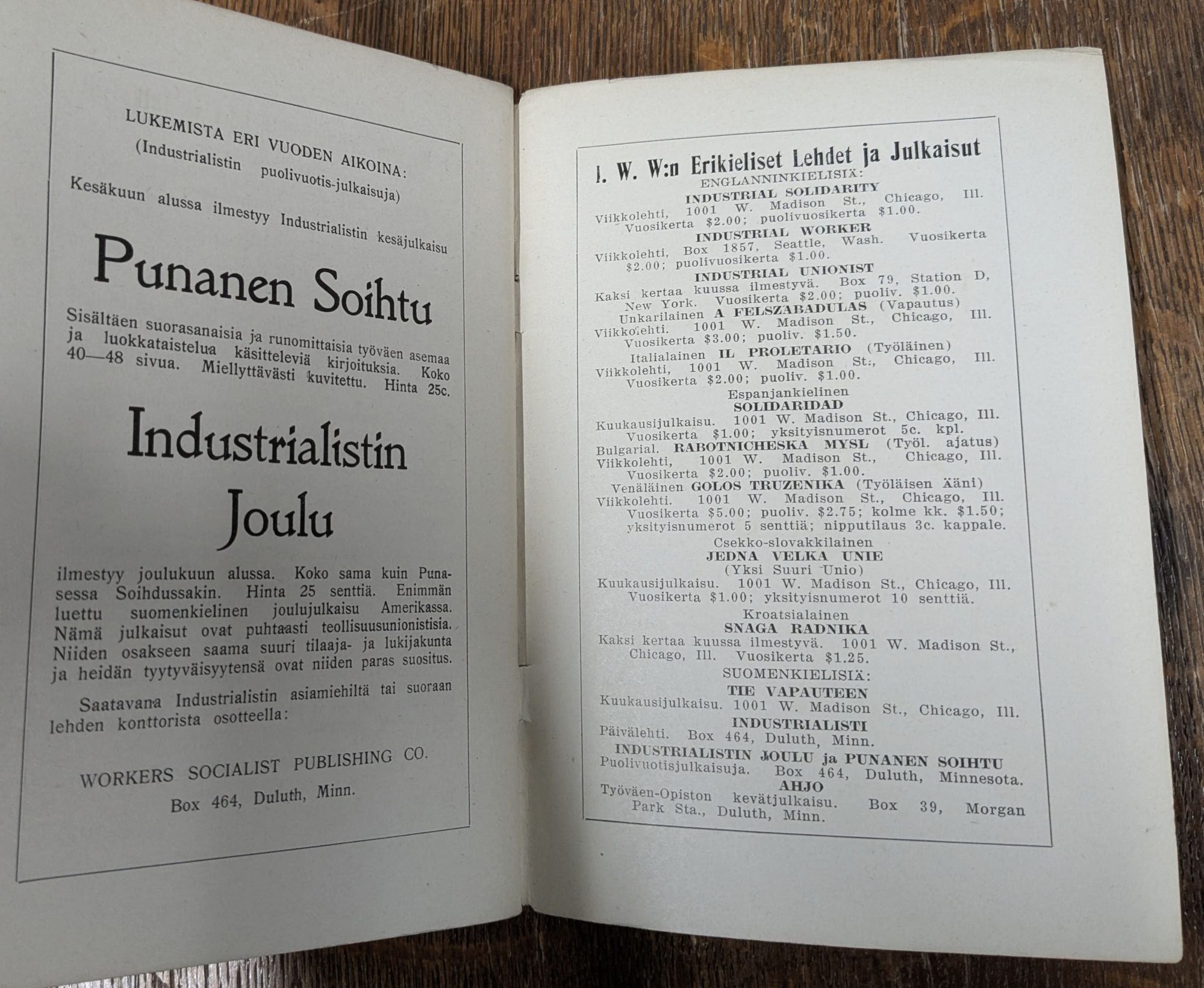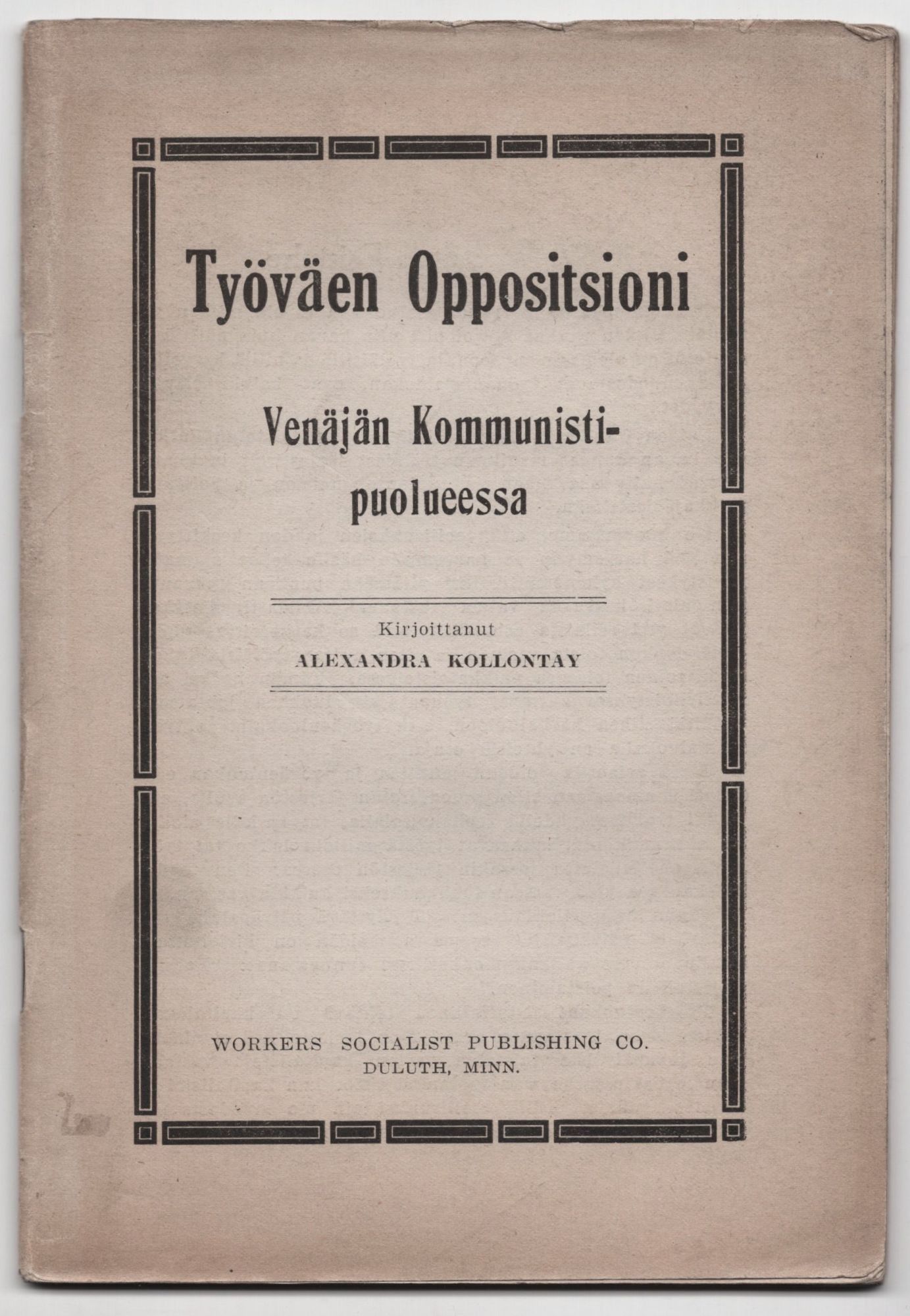 Duluth, Minnesota: Workers Socialist Publishing Co, 1921. Pamphlet. Very Good +. 60 pp. Duodecimo [19 cm]; saddle-stapled in printed self-wrappers. Three pages of ads for other Finnish, IWW, Duluth, etc., publications at the rear. Some minor age-toning and edgewear. A nice copy. Rare; in our searches (April 2025) we located only three institutional holdings via OCLC, and found no other copies offered in the trade. Finnish language edition of Alexandra Kollontay's "The Workers' Opposition in Russia / The Workers' Opposition in the Communist Party" (ref: Miles 4280). Printed by the Allied Printing Trades Council of Duluth, MN, with their union label device printed on the rear wrap.