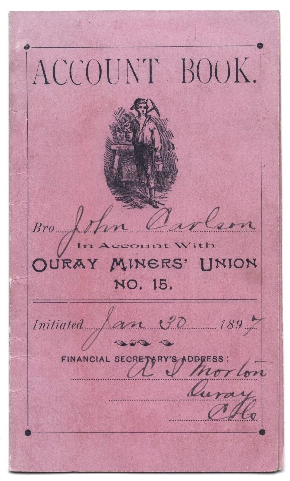 Account Book. Bro[ther] [John Carlson] In Account With Ouray Miners' Union No, 15, Initiated [Jan 30] 189[7]. Financial Secretary's Address: [A I Morton Ouray Colo]. (With a handwritten letter laid in.)