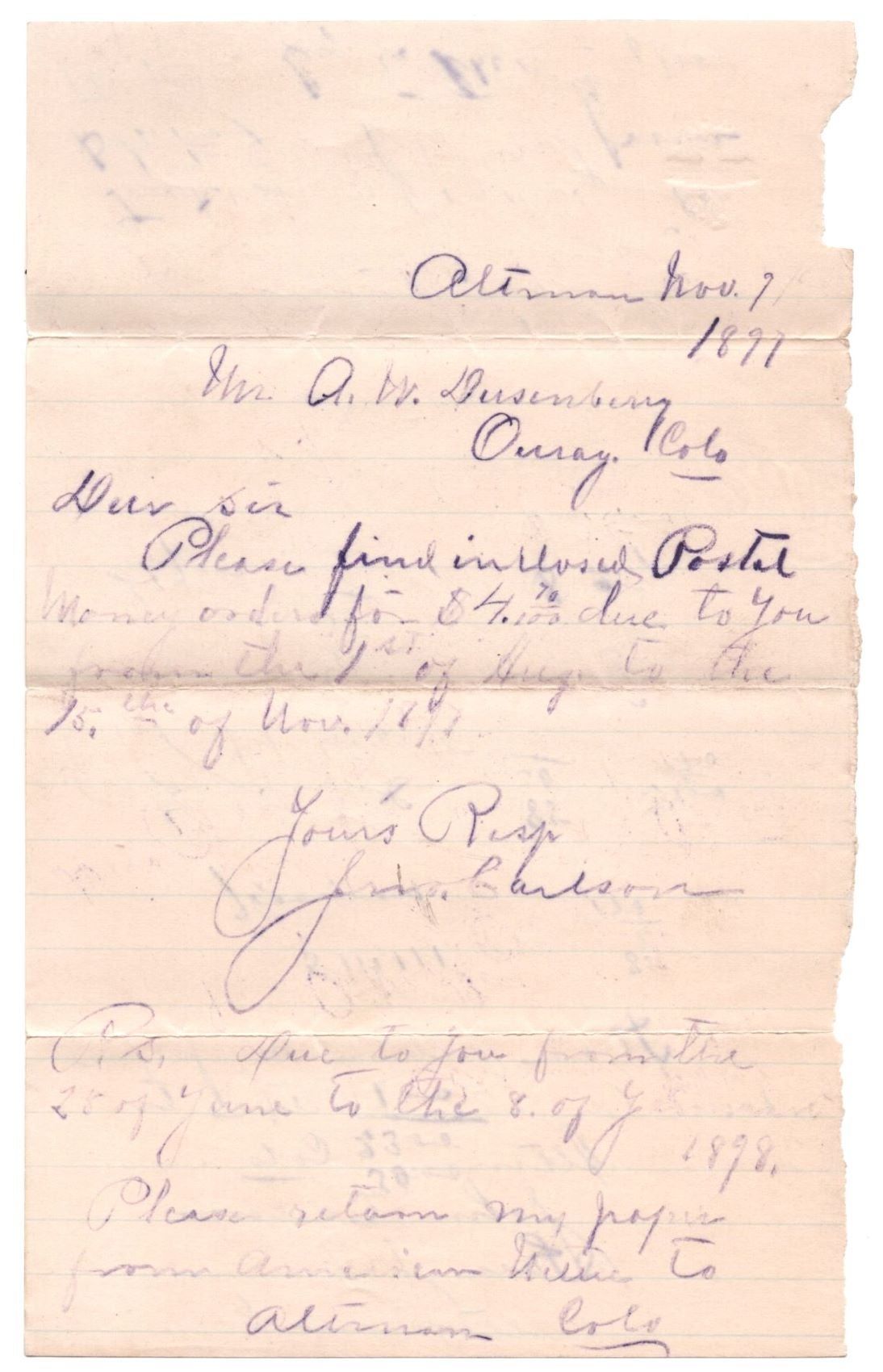"Altman [Colorado] Nov. 7 | 1897 | Mr. A. W. Dusenberry [?] | Ouray. Colo | Dear Sir | Please find inclosed Posted | Money order for $4.70 due to you | from the 1st of Aug. to the | 15the of Nov. 1897. | Yours Resp | John Carlson | P.S. Due to you from the | 25 of June to the 8 of J[anuary?] | 1898 | Please return my paper | from American [?] to | Altman Colo"