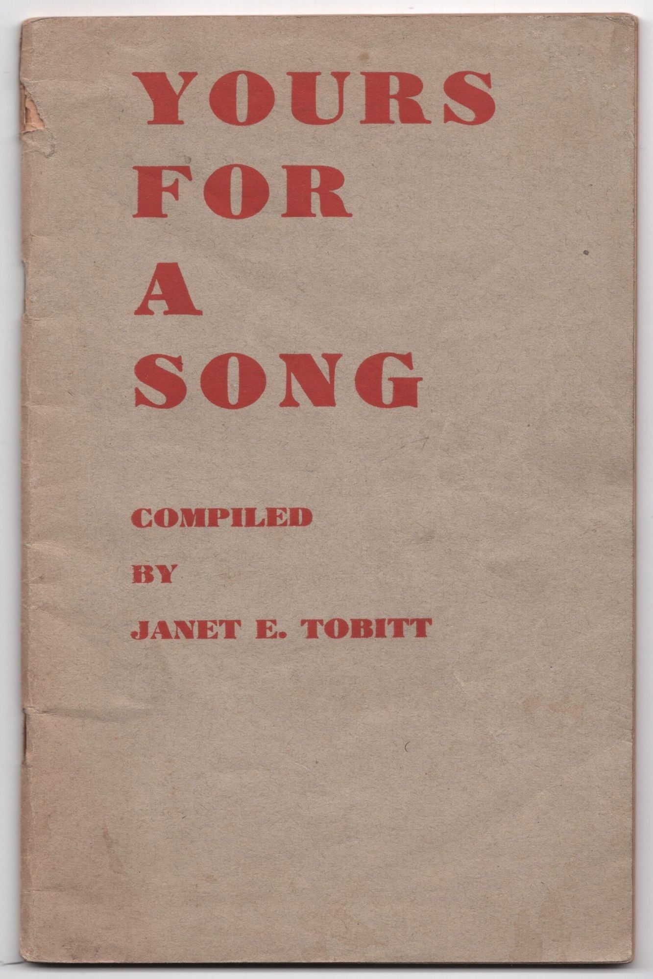 New York, NY: Janet E. Tobitt, 1939. Pamphlet. Good +. 64 pp. Octavo [21 cm]; saddle-stapled in printed wraps. Lightly age toned. Sporadic gentle creases. Top corner is bumped at the spine resulting in a small tear and split to the cover and outer pages. Clean and unmarked. A songbook full of Folk Songs, Hymns, Carols, Art Songs, Rounds, and Canons from a wide variety of international origins. The lyrics and the musical notation are both printed for every song.