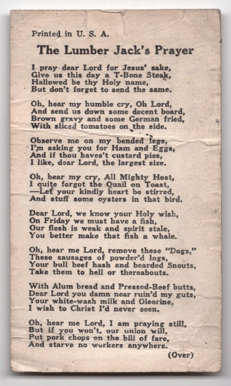 [Recto:] "Printed in U. S. A. | The Lumber Jack's Prayer | I pray dear Lord for Jesus' sake, | Give us this day a T-Bone Steak, | Hallowed be thy Holy name, | But don’t forget to send the same. | Oh, hear my humble cry, Oh Lord, | And send us down some decent board, | Brown gravy and some German fried, | With sliced tomatoes on the side. | Observe me on my bended legs, | I’m asking you for Ham and Eggs, | And if thou havest custard pies, | I like, dear Lord, the largest size. | Oh, hear my cry, All Mighty Host, | I quite forgot the Quail on Toast, | —Let your kindly heart be stirred, | And stuff some oysters in that bird. | Dear Lord, we know your Holy wish, | On Friday we must have a fish, | Our flesh is weak and spirit stale, | You better make that fish a whale. | Oh, hear me Lord, remove these “Dogs,” | These sausages of powder’d logs, | Your bull beef hash and bearded Snouts, | Take them to hell or thereabouts. | With Alum bread and Pressed-Beef butts, | Dear Lord you damn near ruin’d my guts, | Your white-wash milk and Oleorine, | I wish to Christ I’d never seen. | Oh, hear me Lord, I am praying still, | But if you won’t, our union will, | Put pork chops on the bill of fare, | And starve no workers anywhere. | (Over)"