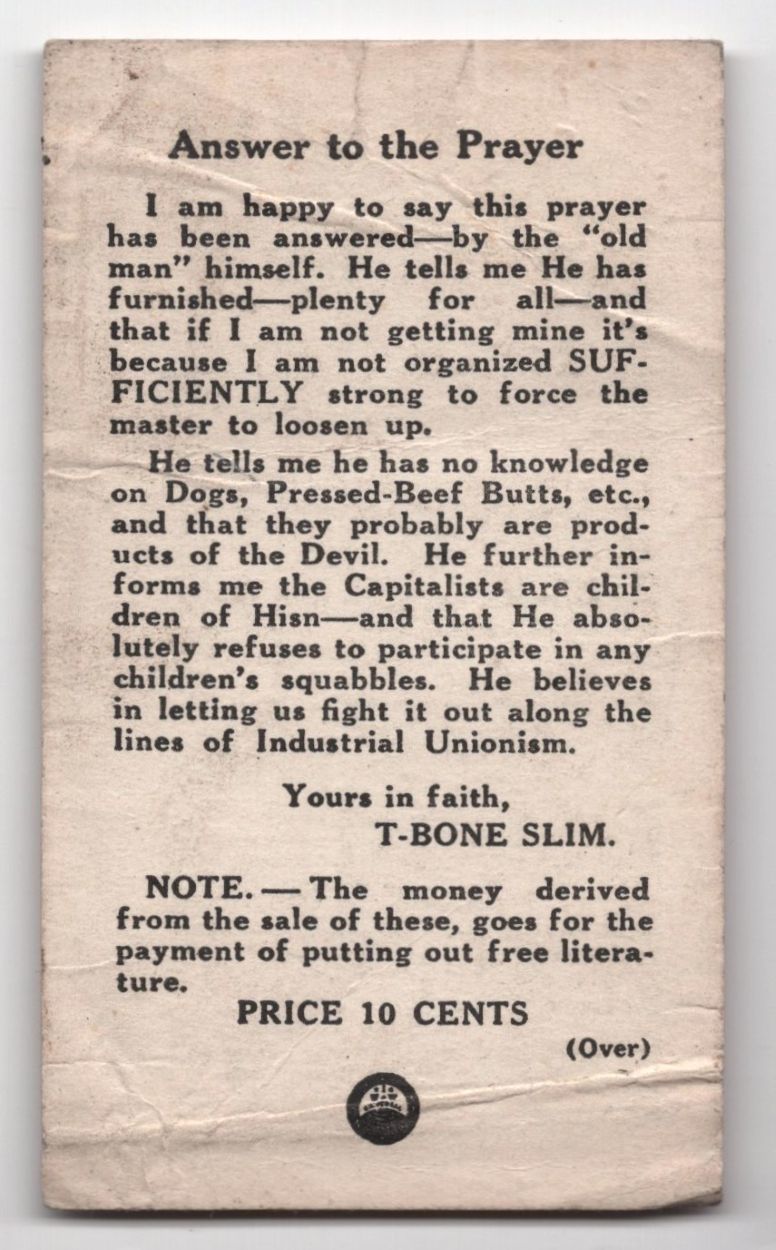 [Verso:] "Answer to the Prayer | I am happy to say this prayer has been answered—by the “old man” himself. He tells me He has furnished—plenty for all—and that if I am not getting mine it’s because I am not organized SUFFICIENTLY strong to force the master to loosen up. | He tells me he has no knowledge on Dogs, Pressed-Beef Butts, etc., and that they probably are products of the Devil. He further informs me the Capitalists are children of His—and that He absolutely refuses to participate in any children’s squabbles. He believes in letting us fight it out along the lines of Industrial Unionism. | Yours in faith, | T-BONE SLIM. | NOTE.—The money derived from the sale of these, goes for the payment of putting out free literature. | PRICE 10 CENTS | (Over) | [IWW Logo at bottom center]