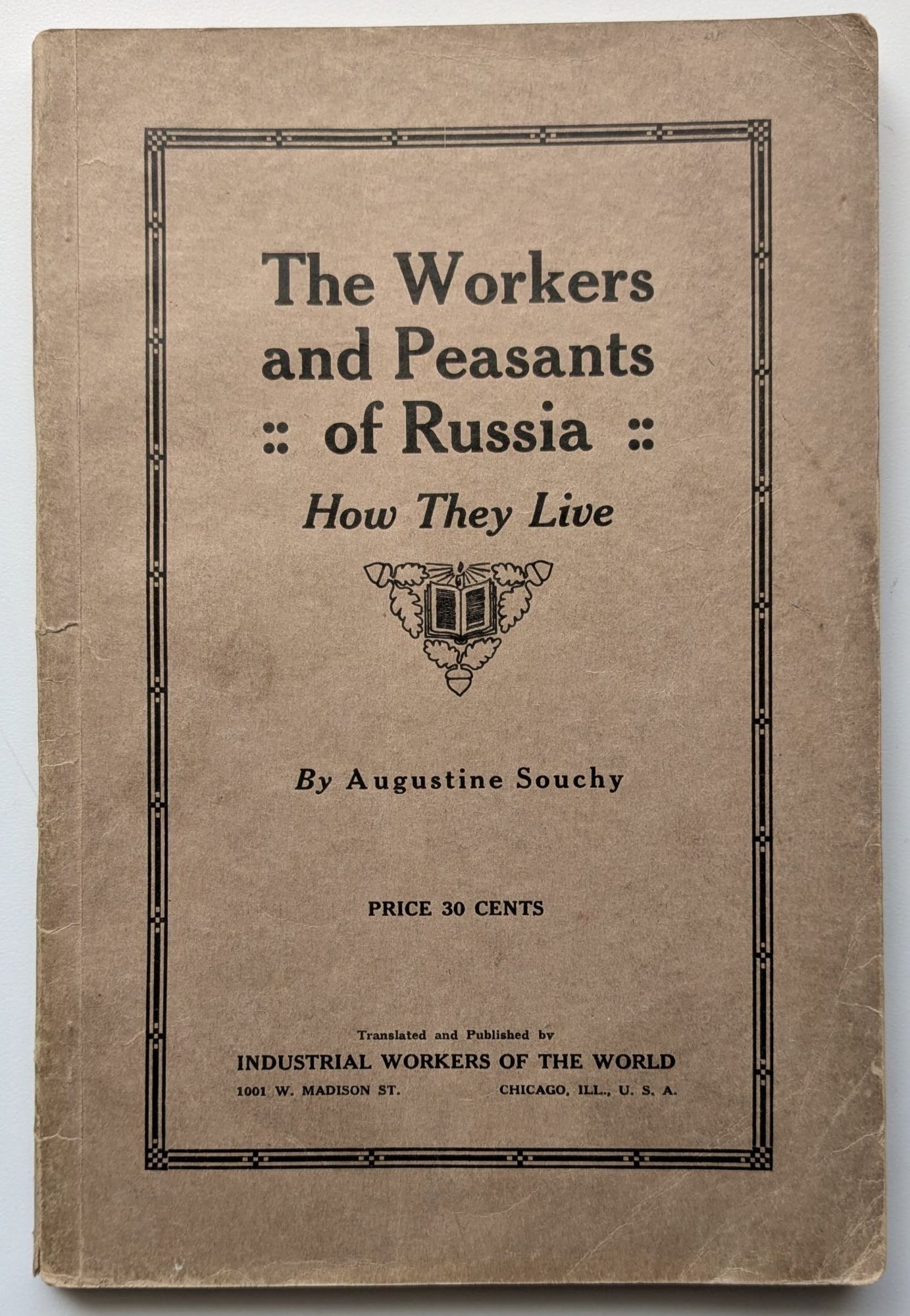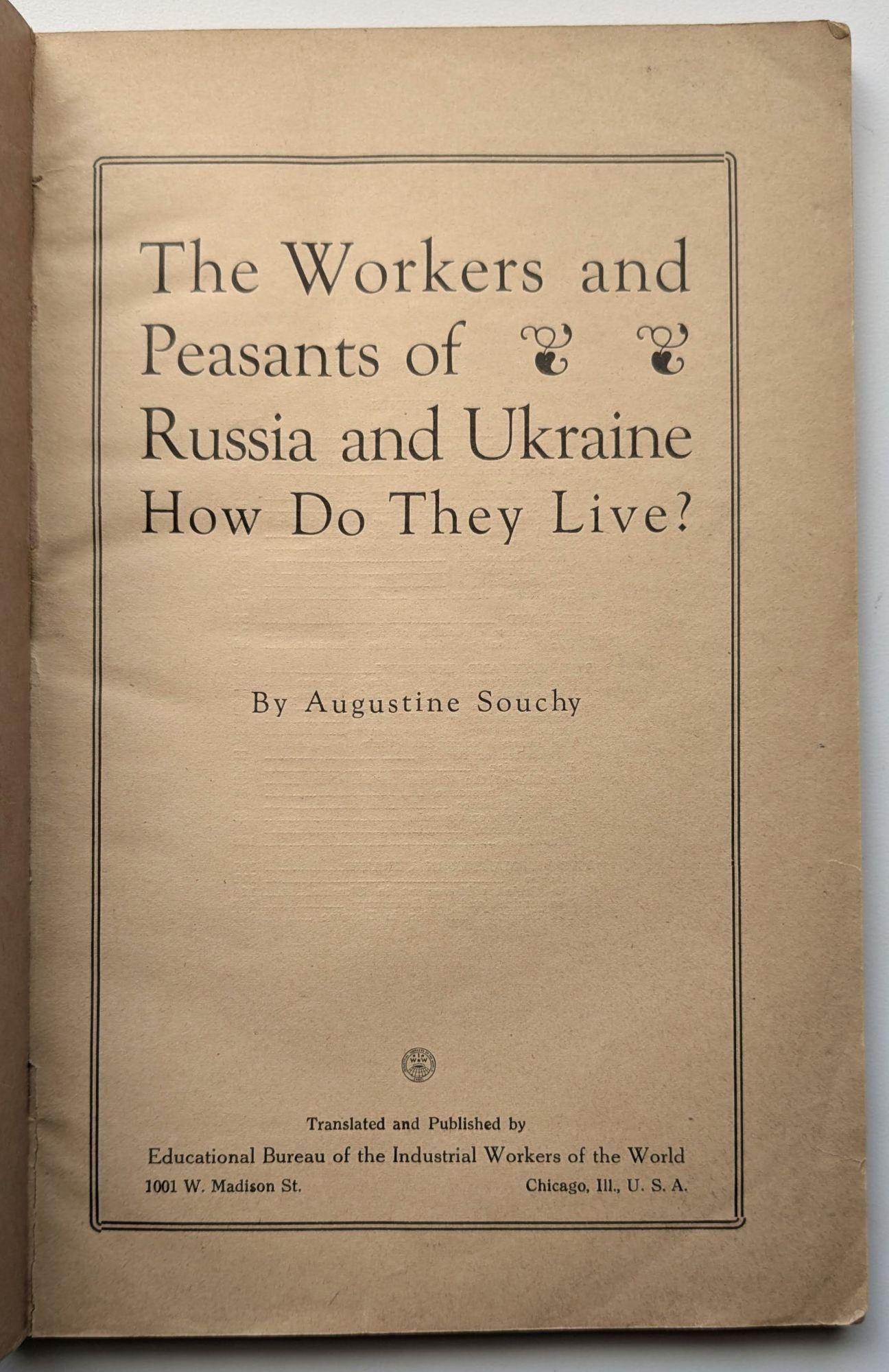 Chicago, Illinois: Educational Bureau of the Industrial Workers of the World [I.W.W. / IWW], 1922. Pamphlet. Good +. 144 pp. Octavo [23 cm]; side-stapled in printed wrappers. Some staining and soiling to covers. Spine is bumped at the foot with a small split at the edge. Title page starting to split at the bottom near the hinge. Age-toned, but clean and unmarked throughout. An English translation of Souchy's "Wie lebt der Arbeiter und Bauer in Russland und in der Ukraine?" The introduction by George Williams is dated Feb. 10th, 1922. The IWW's address (translator/publisher) is listed on the title page as "1001 W. Madison St., Chicago, Ill." which was the IWW general headquarters location from July 1917 - March 1925.