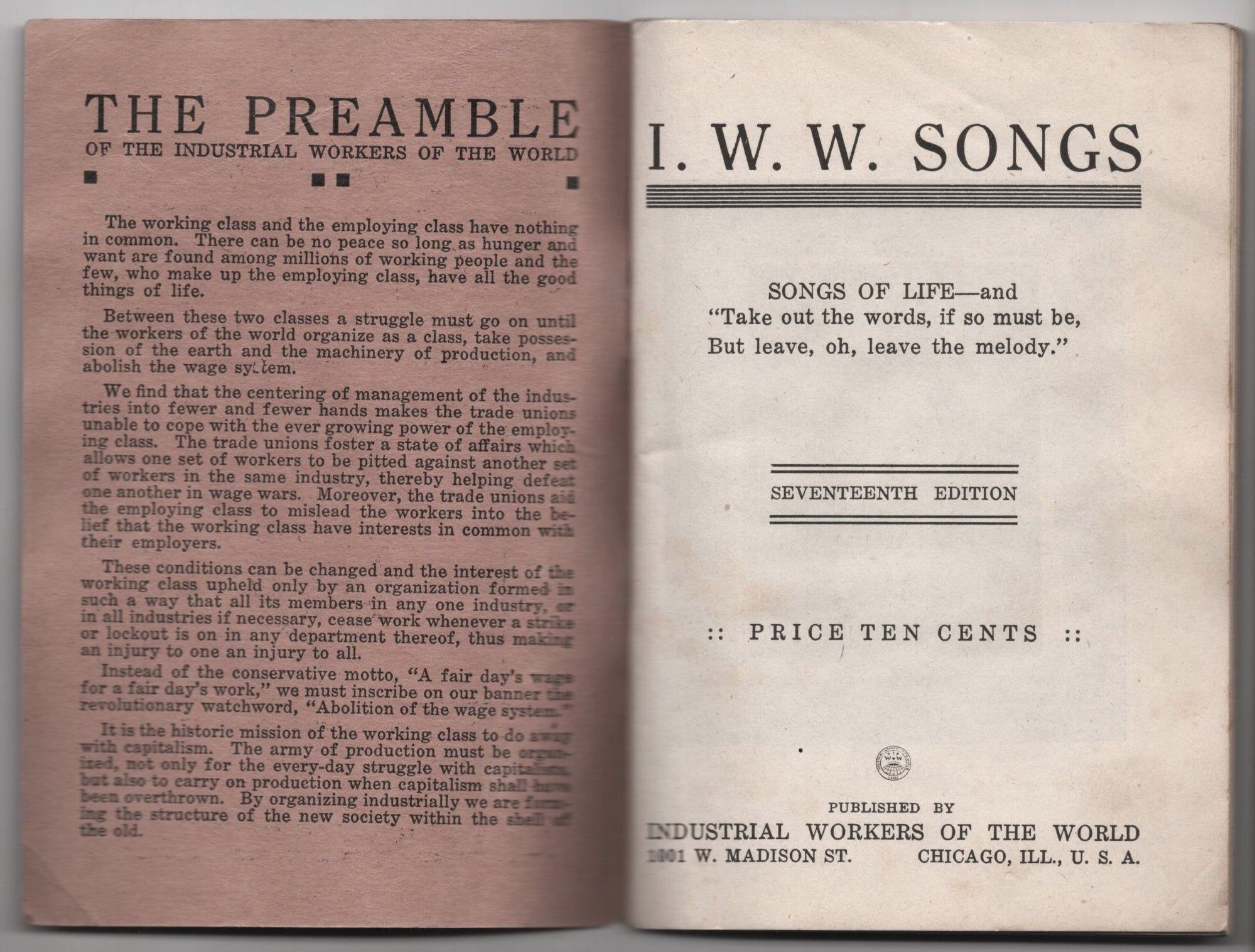 Contains the following songs (in the order printed): The Rebel Girl; The Internationale; We Will Sing One Song; Workers of the World, Awaken!; One Big Industrial Union; The Red Flag; The Workers of the World Are Now Awaking [sic Awakening]; Harvest War Song; Workers of the World; John Golden and the Lawrence Strike; Scissor Bill; Dump the Bosses off Your Back; All Hell Can’t Stop Us!; Up from Your Knees; The Tramp; Whadda Ya Want to Break Your Back for the Boss For?; The White Slave; The Big Question; Solidarity Forever!; The Dollar Alarm Clock; We Have Fed You All for a Thousand Years; I’m Too Old to Be a Scab; Mr. Block; The Industrial Workers of the World; The Workers’ Marseillaise; “Remember”; Industrial Unionism Speaks to the Toilers of the Sea; The Preacher and the Slave; “The Popular Wobbly”; “Renunciation”; Don’t Take My Papa Away from Me; When You Wear That Button; My Wandering Boy; The Everett County Jail; I Wanna Free Miss Liberty; May Day Song; They’ll Soon Ring Out; Onward, “One Big Union”; Count Your Workers—Count Them!; Fifty Thousand Lumberjacks; Tie ‘Em Up!; Joe Hill’s Last Will; The Mysteries of a Hobo’s Life; Workers’ Memorial Song; Farewell, Frank!; The Commonwealth of Toil; A Worker’s Plea; Organize!; There Is Power in a Union; Harvest Land; Hold the Fort; and Workingmen, Unite!