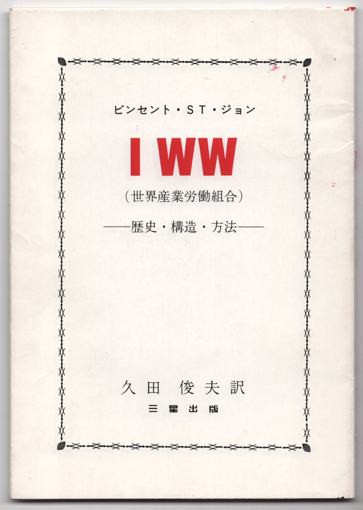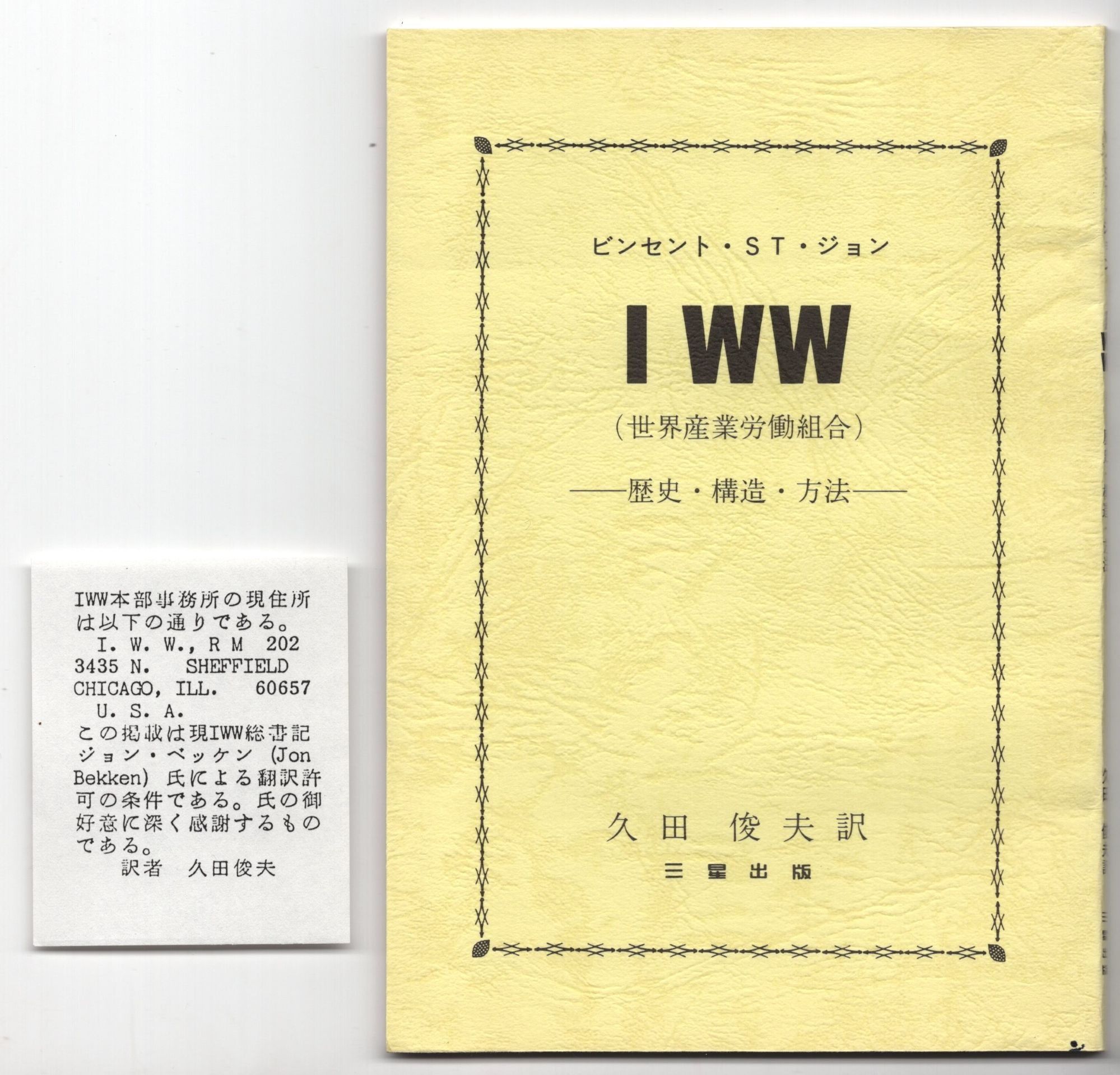 Mizuho-ku, Nagoya [Aichi Prefecture, Japan]: Samsung Publishing Co., Ltd, 1985. Paperback. Near Fine/Very Good +. v, 60 pp. Duodecimo [18 cm]; perfectbound in yellow printed wraps. White, black, and red printed dust jacket. Some very light occasional shelfwear, smudges. Small publisher's slip/note (measuring 7 x 5.5 cm) is laid in. Japanese language edition of Vincent St. John's "The I.W.W.: Its History, Structure and Methods," which was originally published in 1913.
