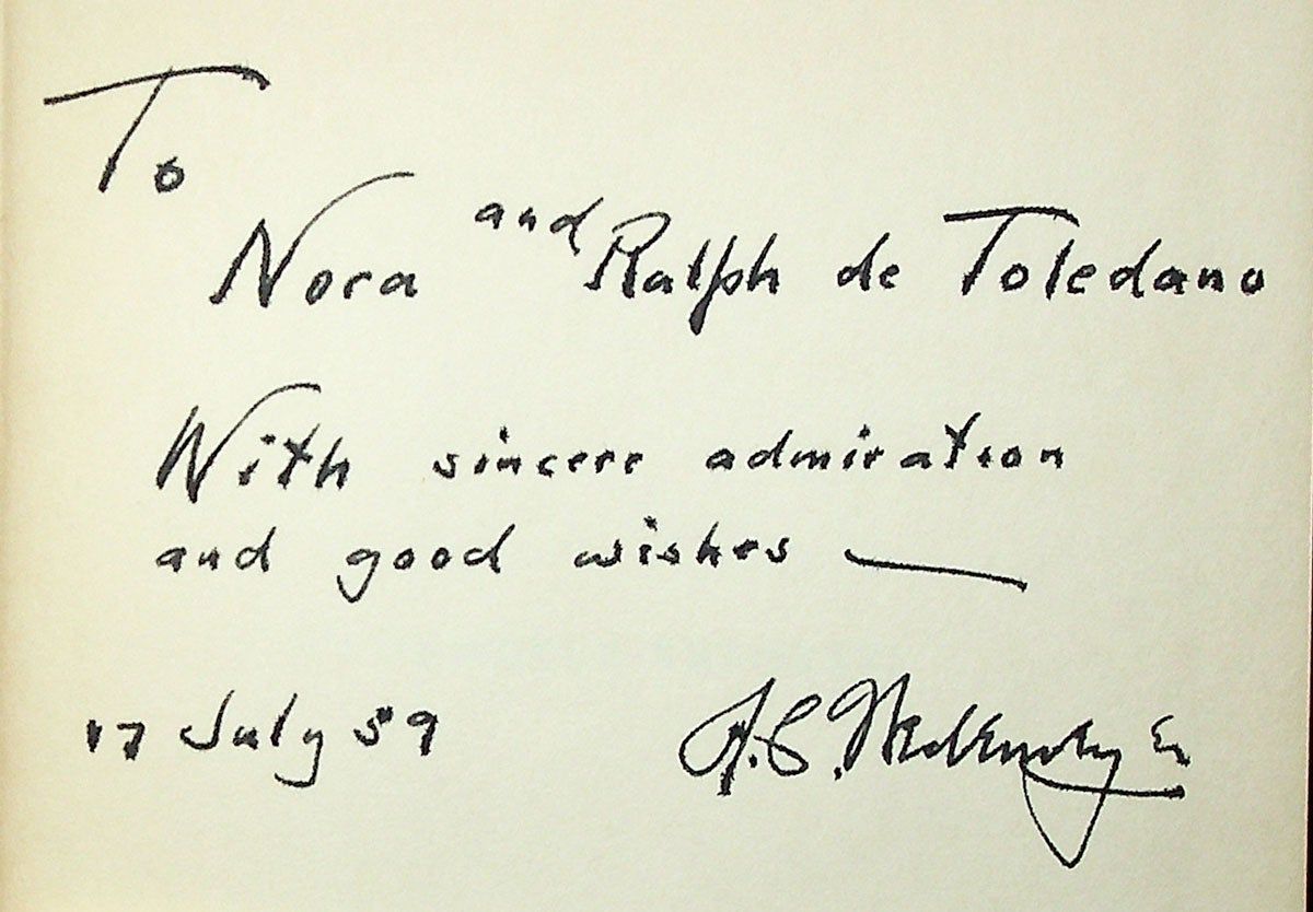 New York: Henry Holt, (1958). First Edition. First printing. Inscribed on front endpaper: "To Nora and Ralph de Toledano / with sincere admiration and good wishes," signed, dated July 1959. Tight, clean and unmarked copy, Near Fine, lacking the dustwrapper.