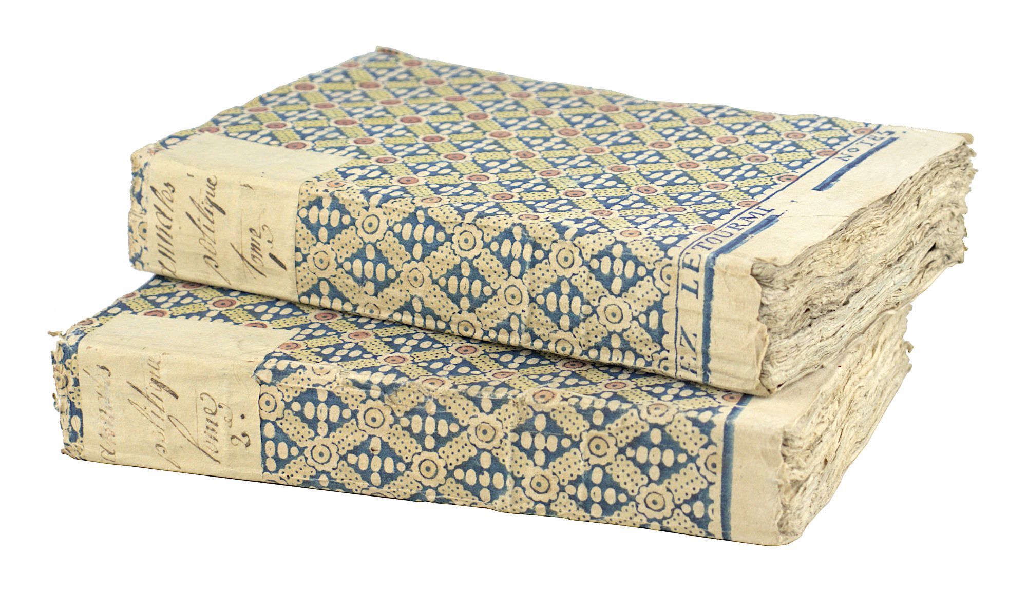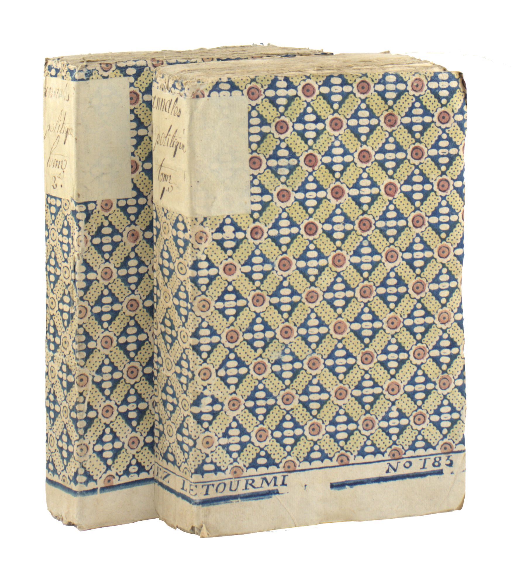 Of special interest is the choice of "temporary" binding, wrappers signed and numbered in print along the bottom margin of the binding by the major local printer, Jean-Baptiste Letourmy of Orleans. "Assisted by one or more skilled block-cutters, [Letourmy] produced numerous religious prints and traditional images, keeping up with current events when revolution broke out. He produced at least 321 designs of patterned paper," of which this is pattern no. 185 (or possible 183), a repeating motif employing Letourmy's favorite color, brilliant blue, as well as red and yellow. Letourmy was a shrewd businessperson with an extensive net of agents, exemplified by this volume, which was almost certainly published 350 miles away in Paris, not London.
