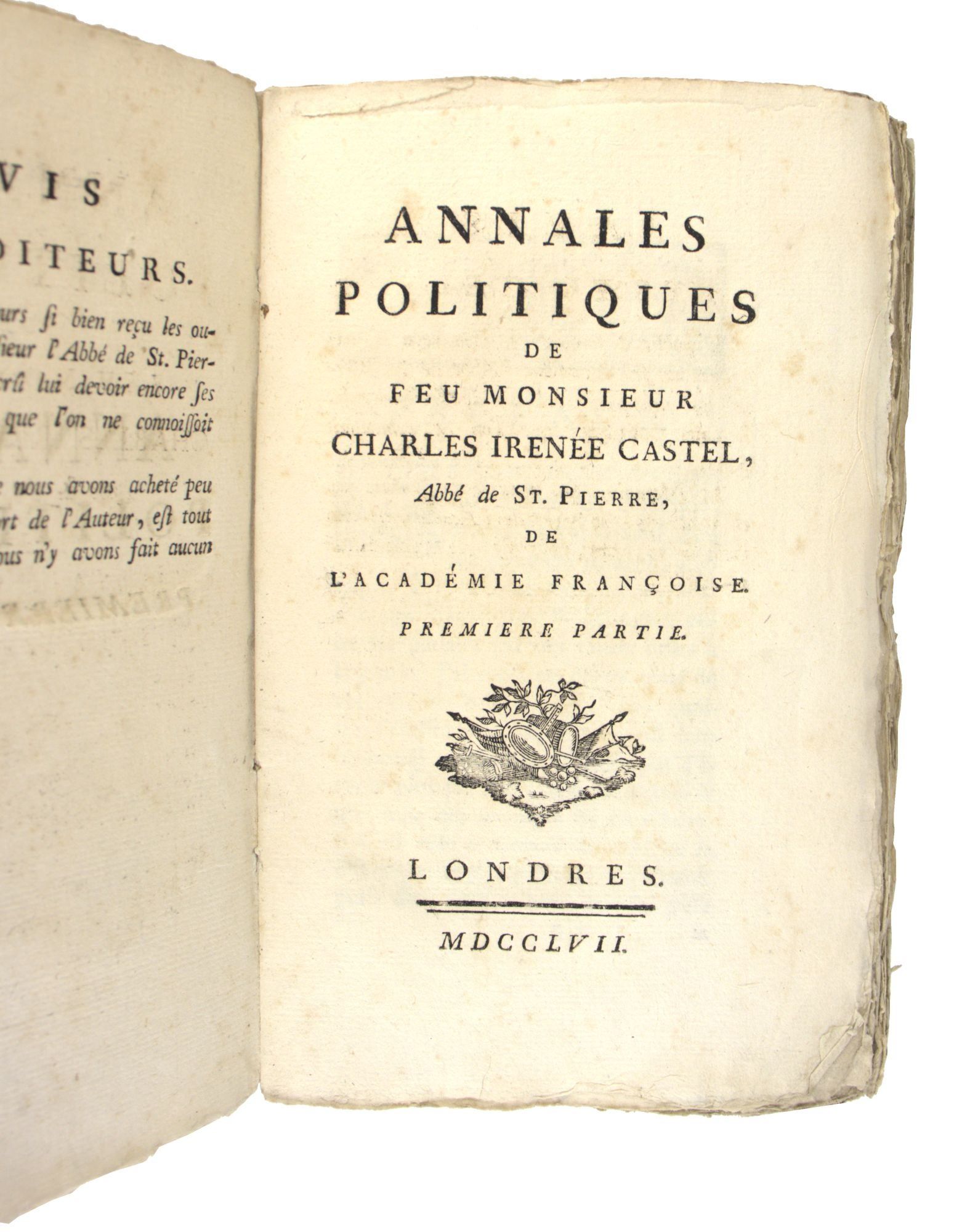 False imprint edition of European political history by the late author Charles Irenée Castel, Abbé de Saint-Pierre (1658-1743). Castel, father of the concept of perpetual peace, was the first to propose a European union in his 1713 "Projet pour rendre la paix perpétuelle en Europe," whose influence reached the minds of Rousseau, Voltaire, Frederick the Great, and Kant. That work was also "destined to exercise considerable influence on the development of various schemes for securing universal peace which culminated in the Holy Alliance [and later the League of Nations and the United Nations]" (Encyclopedia Britannica Eleventh Edition).