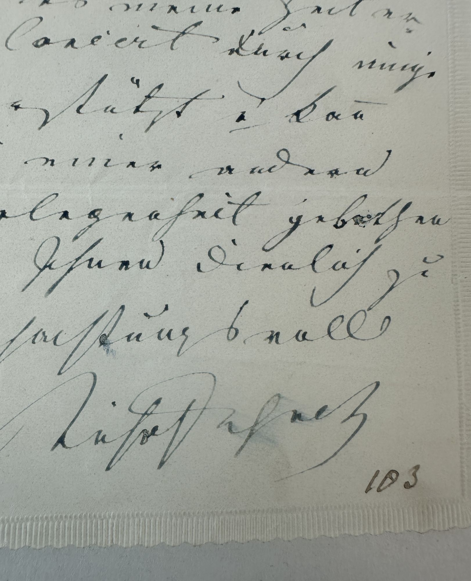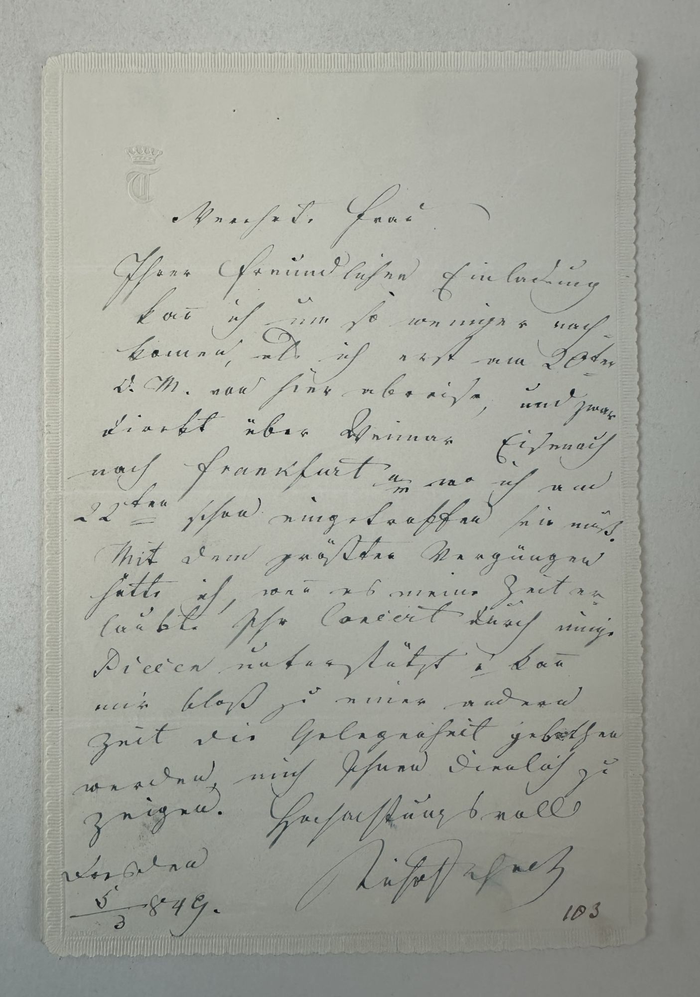 Germany, 1800. In Very Good condition with light age-toning to the letter and moderate age-toning and browning to the edges of the print. Signed by Josef Tichatschek in fountain pen to the letter and portrait. Measurements: Letter - 4.75 in. x 7.25 in., Portrait - 9.5 in. x 12.25 in. 1400373. Special Collections.