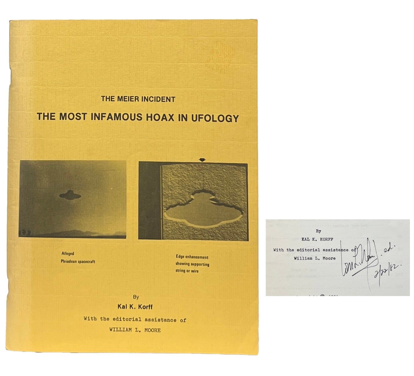 Prescott: William L. Moore Publications and Research, 1981. First Edition. Paperback. Near Fine. Introduction by Korff. Inscribed on the title page by Moore. Near Fine. Yellow wraps lightly faded and rubbed at the spine and edges. Firmly bound with two staples, clean internally. An in-depth debunking of Eduard "Billy" Meier's claims of having taken photos of real UFOs, many of which were published in UFO...Contact From the Pleiades, Volume I. An important work in ufology because, as Korff puts it in his Introduction, "It is imperative to UFOlogy that the serious organizations and researchers speak out against the Adamskis, the Villas, the Meiers, and the future Meiers of the world." From the collection of ufologist Tom Benson. [Rasmussen 595].