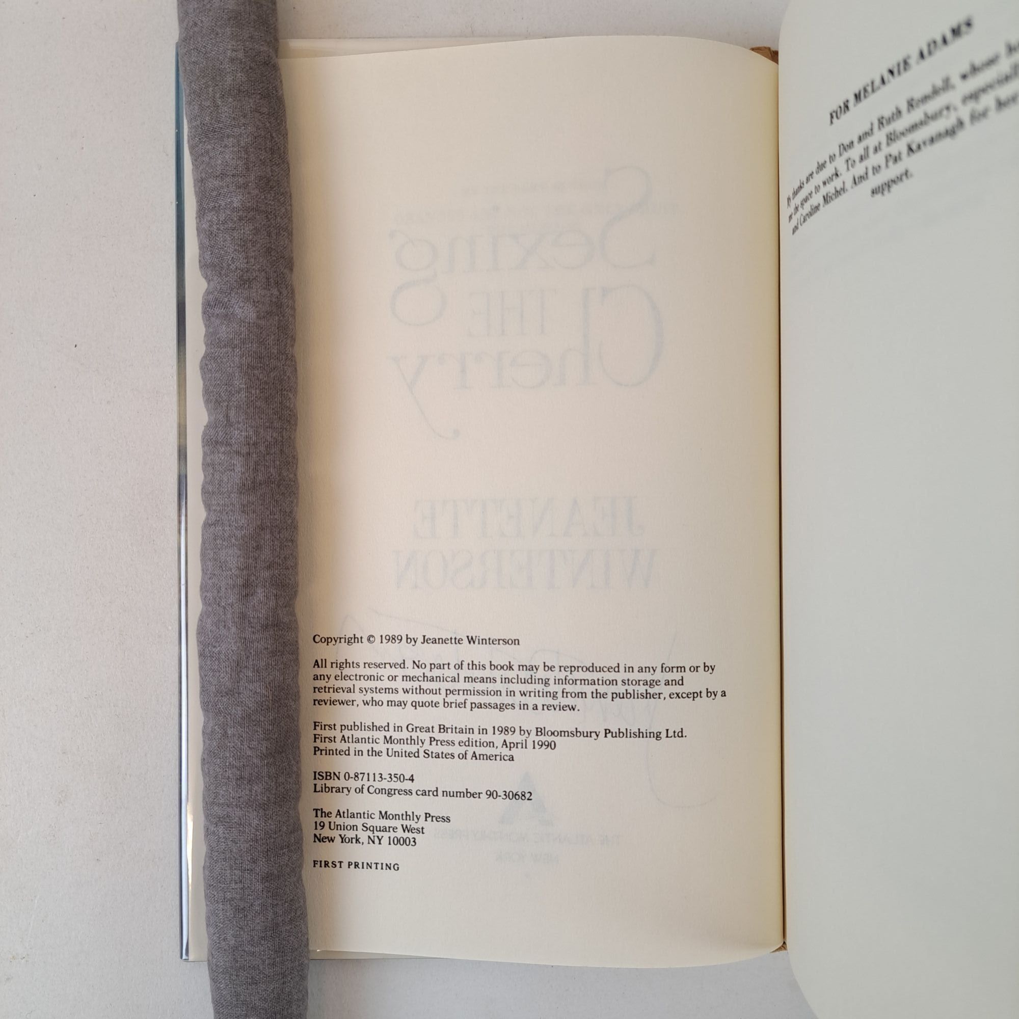 New York, New York: Atlantic Monthly Press, 1989. First US Edition, First Printing. Hardcover. Octavo, 167 pages. In Very Good condition with Very Good condition dust jacket. Spine is dark teal with white lettering. Dust jacket protected by mylar covering, price uncut: "$19.95" on front flap. Boards have mild shelving wear along spine head, tail, and joints. Textblock edges have mild, faint foxing. Signed flat by Jeanette Winterson on title page. Shelved Room C. 1400462. Special Collections.