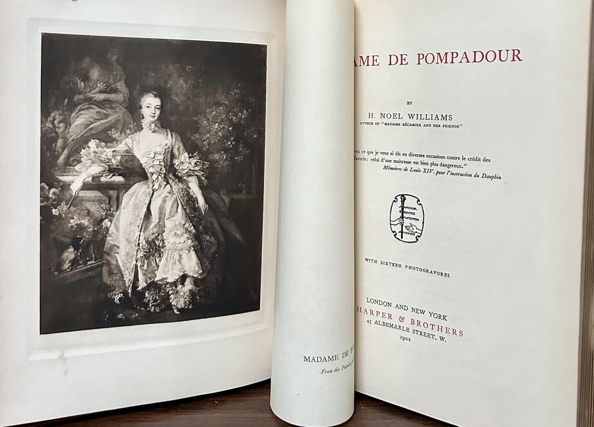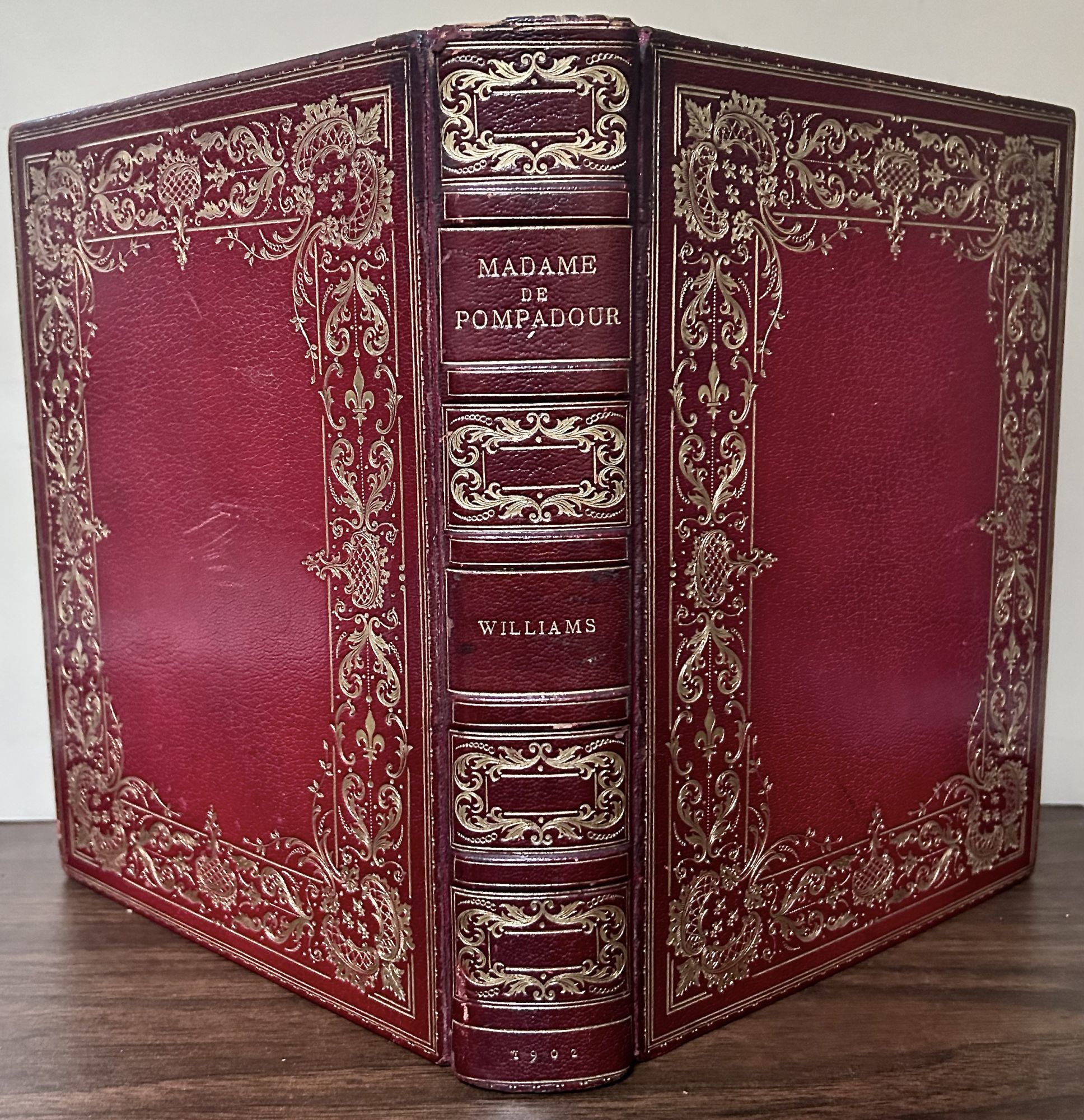 London & New York: Harper & Brothers, 1902. First edition. leather_bound. Full crimson morocco. Aeg. Fine. 431 pages. 26 x 20 cm. Bound by Zaehnsdorf with 16 full page photogravures with tissue guards. Title page printed in red and black. Madame de Pompadour was no ordinary King's mistress: she was a great political force who made and unmade Ministers, selected ambassadors and appointed generals and conferred pensions. Armorial shield and bookplate of Fowler, inner dentelles, raised bands, spine panels and front covers in large gilt arabesques.