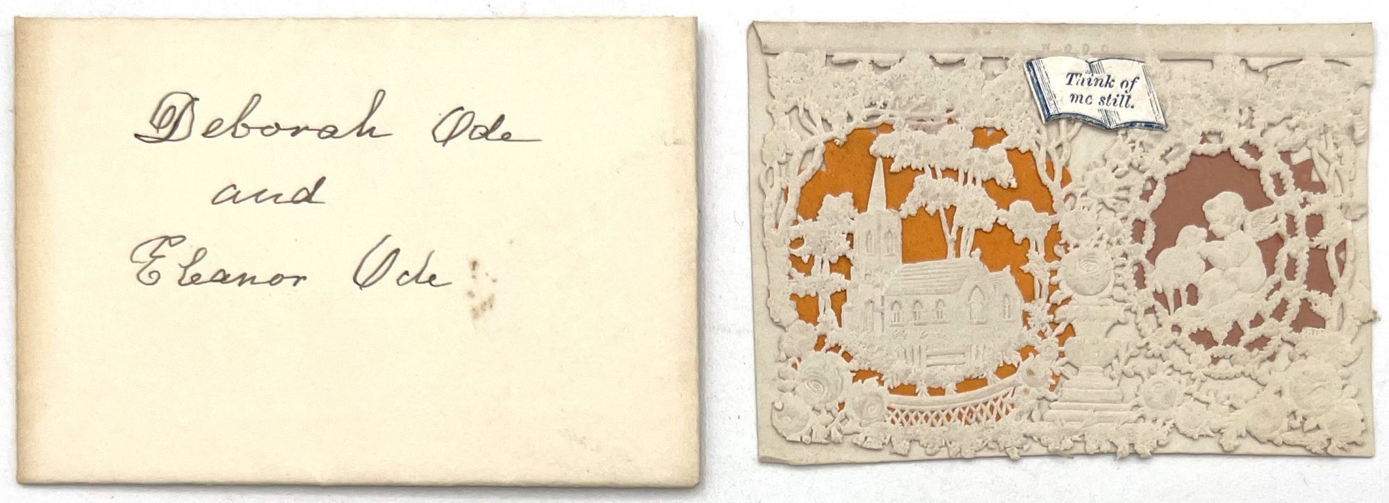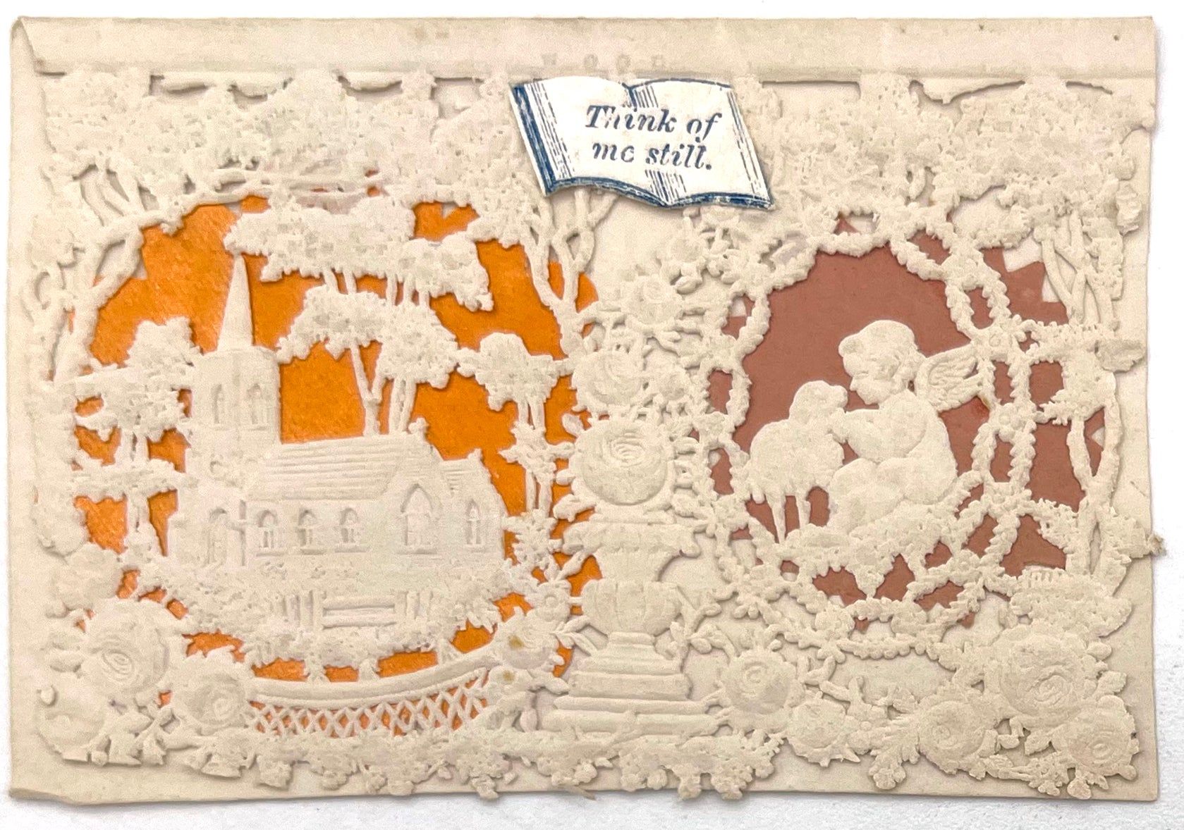 England, 1850. Very good. Light toning, a couple spots to envelope.. A handsome and very petite 32mo valentine constructed from pictorial lace paper with decorated paper peeking through and a small book-shaped applique that reads "Think of me still". Housed in the original blank envelope addressed in contemporary ink to "Deborah Ode and Eleanor Ode". The pictorial lace paper depicts a church on the left, and a small winged putto with a dog on the right. Valentine measures approx. 2" by 2.75", envelope measures approx. 2.25" by 3.25