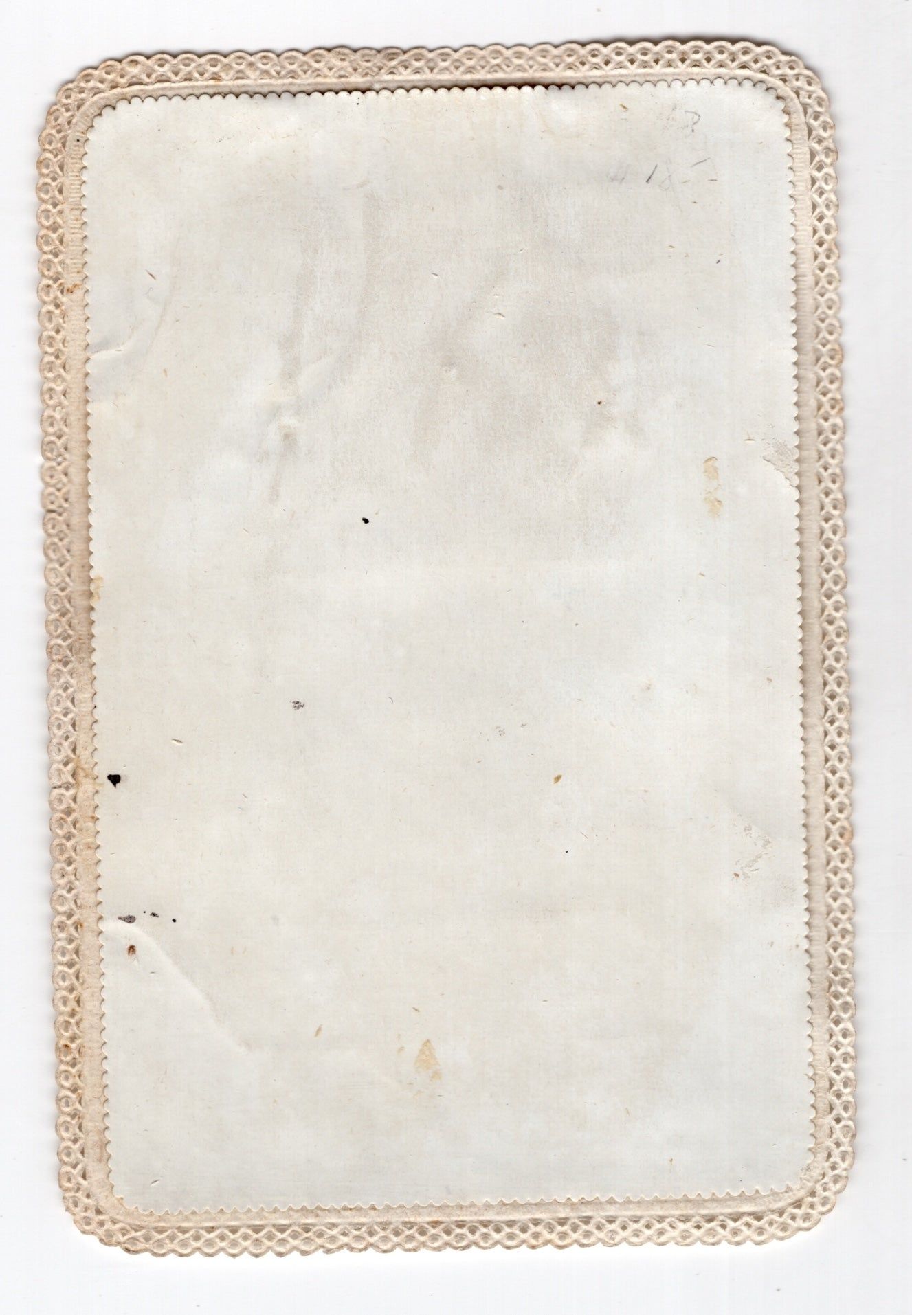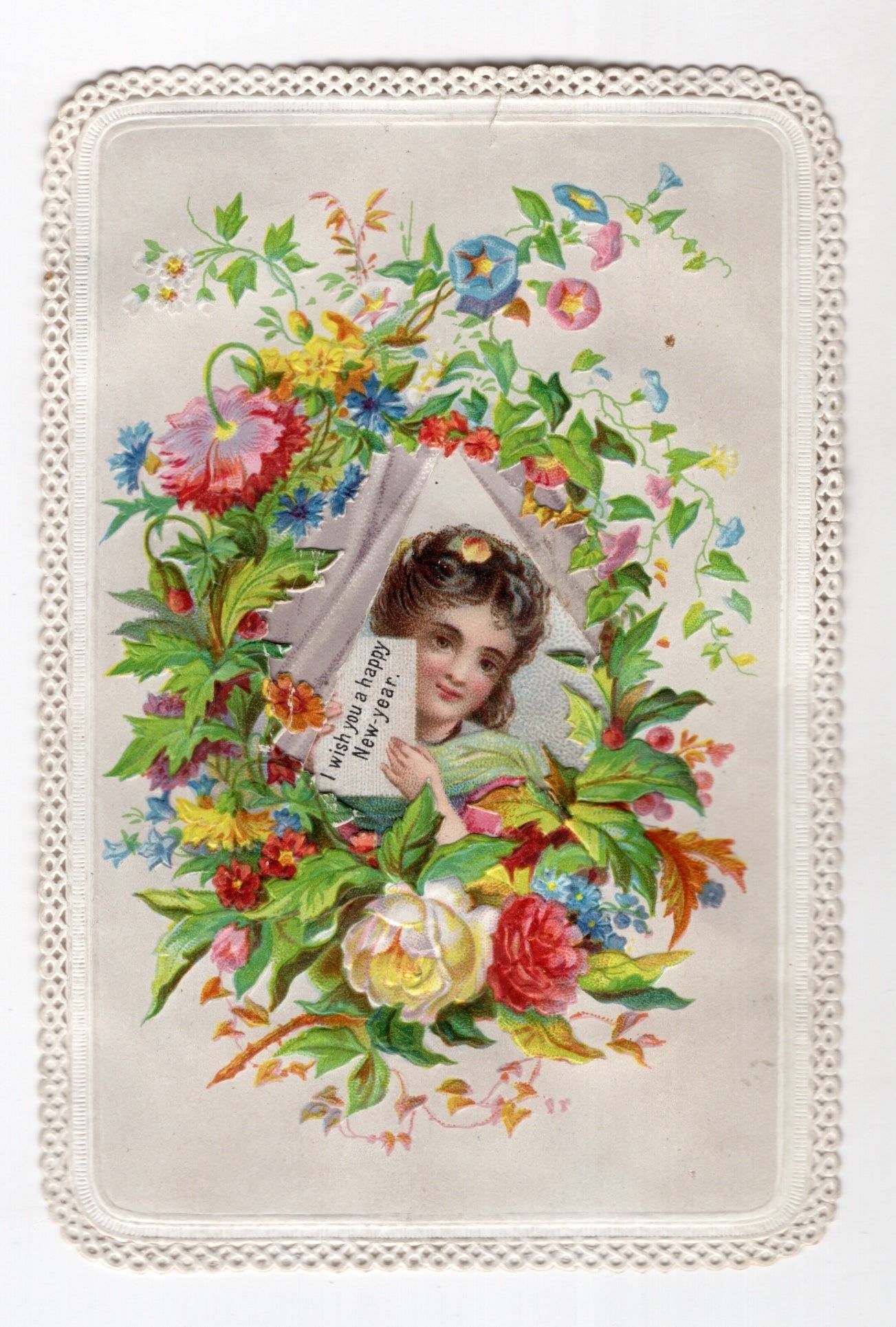 England, 1870. Very good. Light dust soiling, some separation between layers at left-hand edge.. An attractive 12mo greeting card made from layered embossed Victorian card. The outermost layer features a lace paper-like border, and embossed chromolithographed flowers. Through the flowers is a window through which the viewer can see a layer of printed curtains, which part to reveal a young brunette girl holding the message "I wish you a happy New year". Provides an overall very attractive and unique effect. Measures approx. 4.5" by 3", verso blank.