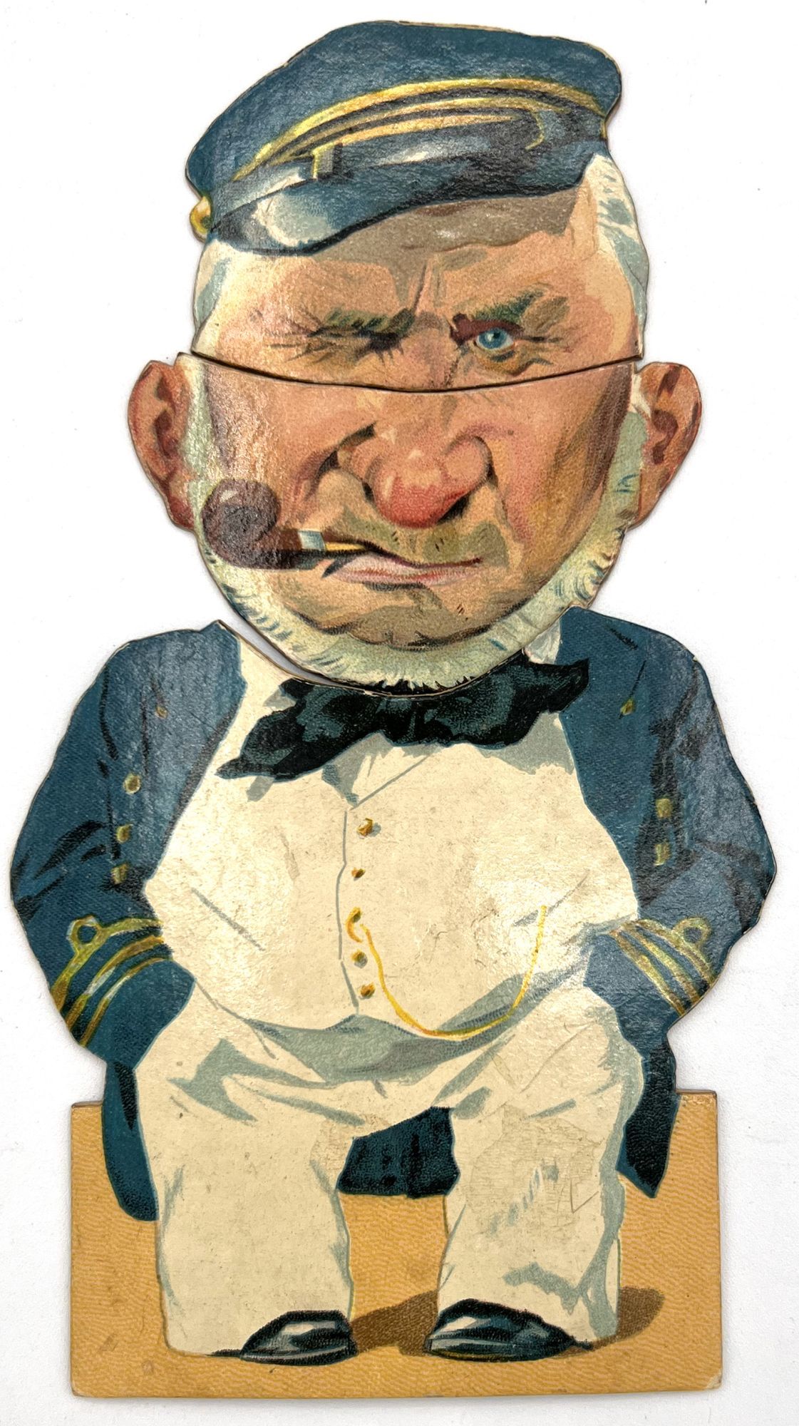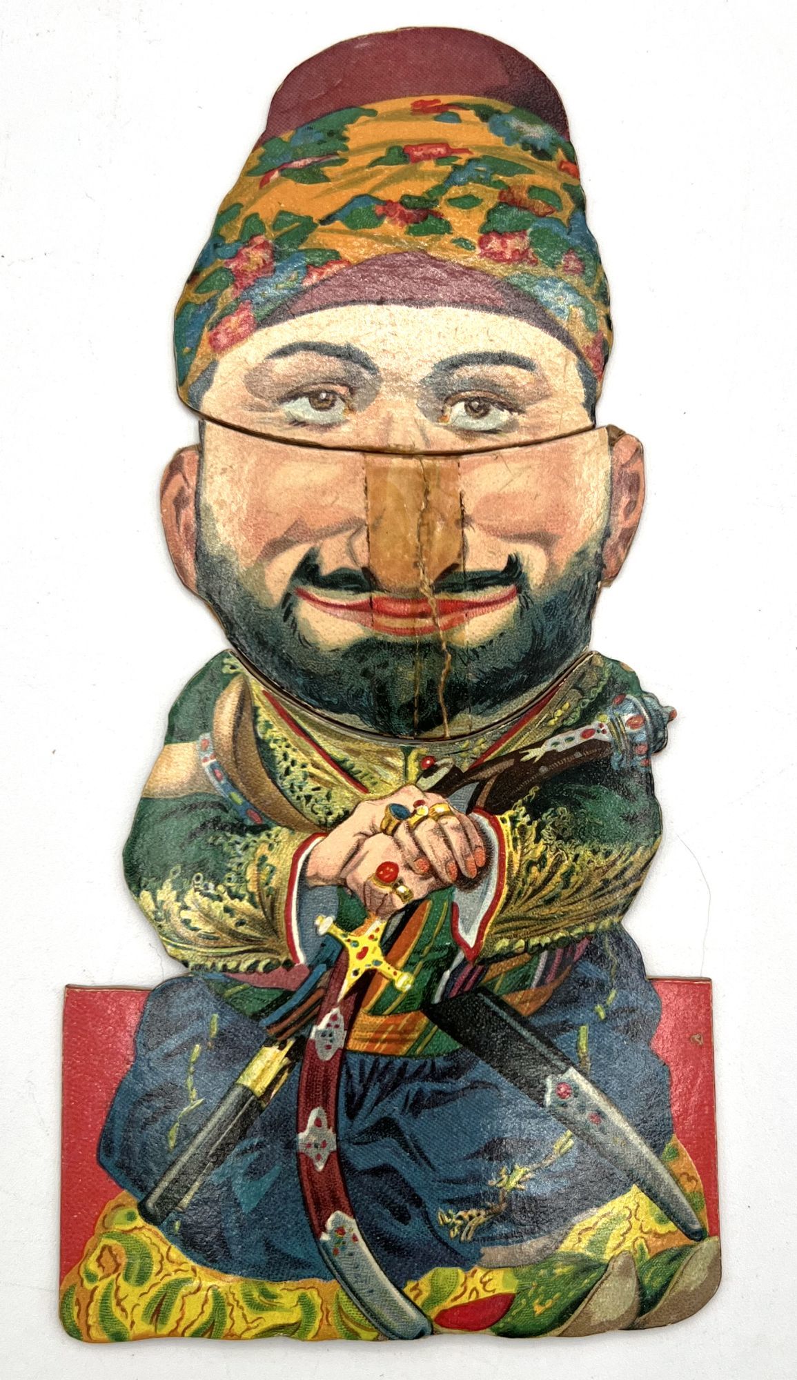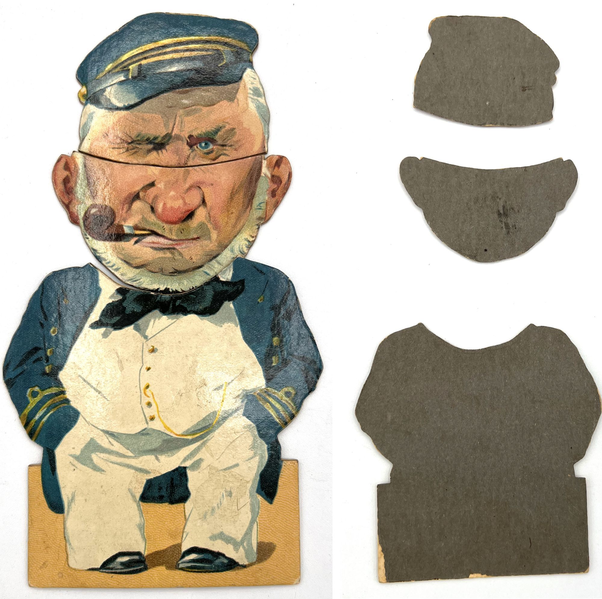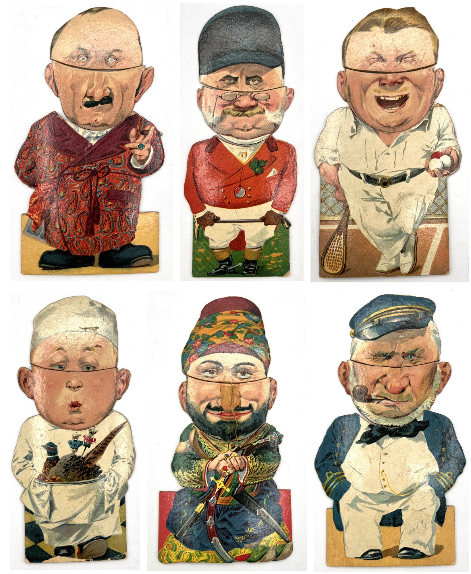 United States, 1930. Very good. Rubbed, modern tape repairs, some nicks/minor wear.. A metamorphic game based on six (6) different amusing caricatures. Each caricature is die-cut and printed onto a stiff piece of card, and is divided into three sections: face, chin, and body. The child playing with the toy can mix and match the different features to create entirely new characters, with dozens of possibilities. The characters include: a crusty old sailor; an Ottoman warrior; a laughing tennis player; a man in fox hunt garb and spectacles; a chef with roast pheasant; and a wealthy gentleman in housecoat and slippers smoking a cigar. Each measures approx. 7" by 3.5", and is printed in color.