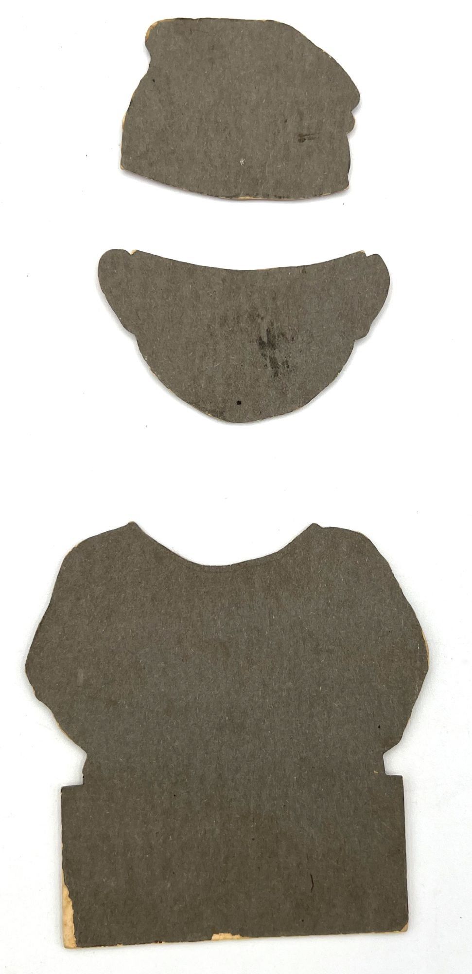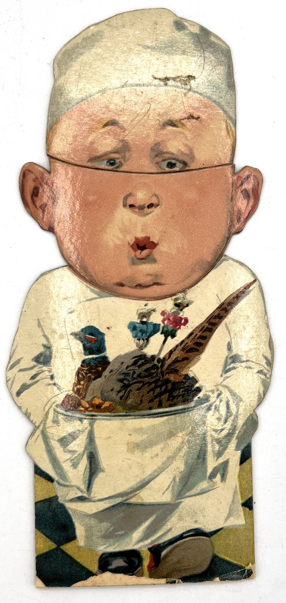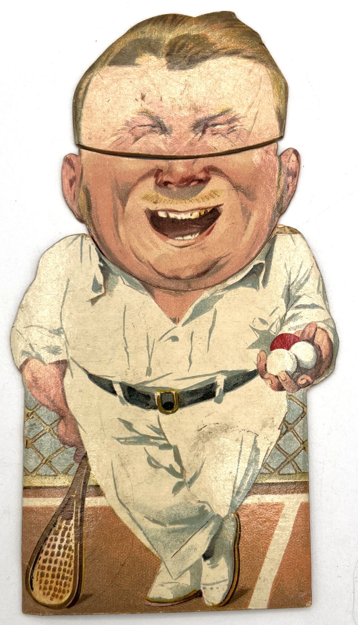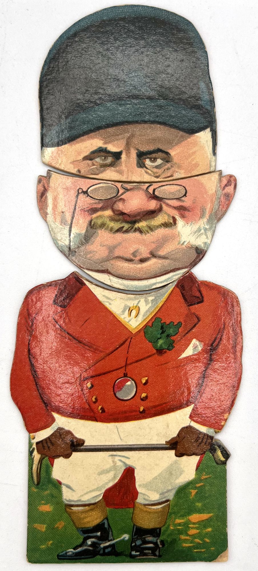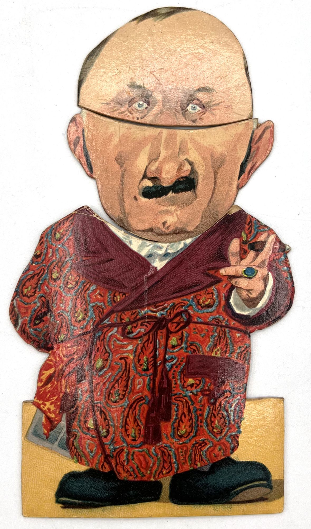 United States, 1930. Very good. Rubbed, modern tape repairs, some nicks/minor wear.. A metamorphic game based on six (6) different amusing caricatures. Each caricature is die-cut and printed onto a stiff piece of card, and is divided into three sections: face, chin, and body. The child playing with the toy can mix and match the different features to create entirely new characters, with dozens of possibilities. The characters include: a crusty old sailor; an Ottoman warrior; a laughing tennis player; a man in fox hunt garb and spectacles; a chef with roast pheasant; and a wealthy gentleman in housecoat and slippers smoking a cigar. Each measures approx. 7" by 3.5", and is printed in color.