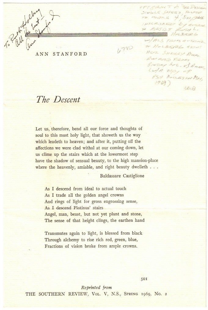 1) Offprint of "The Descent." folded to make 4 pages. Reprinted from The Southern Review, Vol. V, N.S., Spring 1969, No. 2. Inscribed by author to Ruth L. Holberg. Massachusetts author Ruth Langland Holberg (1889-1984) wrote a number of children's books, two cookbooks, and several poems.
