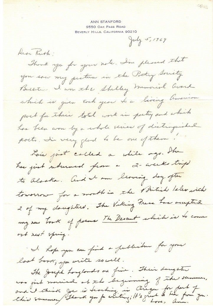 2) ALS on a sheet of paper [7 1/4 x 10 3/8"]. Two horizontal fold lines. With envelope (torn). The letter discusses the fact that Stanford received the Shelley Memorial Award. She also mentions that her new book of poetry, "The Descent," will be coming out the following spring.