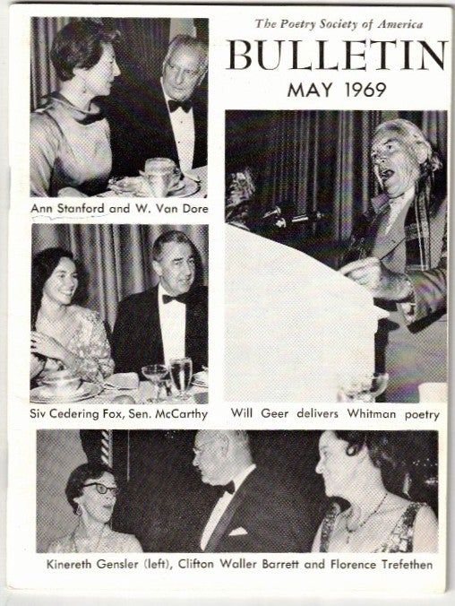 3) Poetry Society of America Bulletin, May 1969 (with very occasional minor pen marks). California poet and scholar Ann Stanford (1916-1987) studied at Stanford University and Radcliffe College, and earned her PhD at UCLA. She published eight poetry collections during her lifetime. Her poetry is meditative, and often weaves themes of ecology, urbanity, and solitude. Stanford is also known for her translation of the "Bhagavad Gita" (1970). Her legacy is honored by the University of Southern California with the Ann Stanford Poetry Prize.
