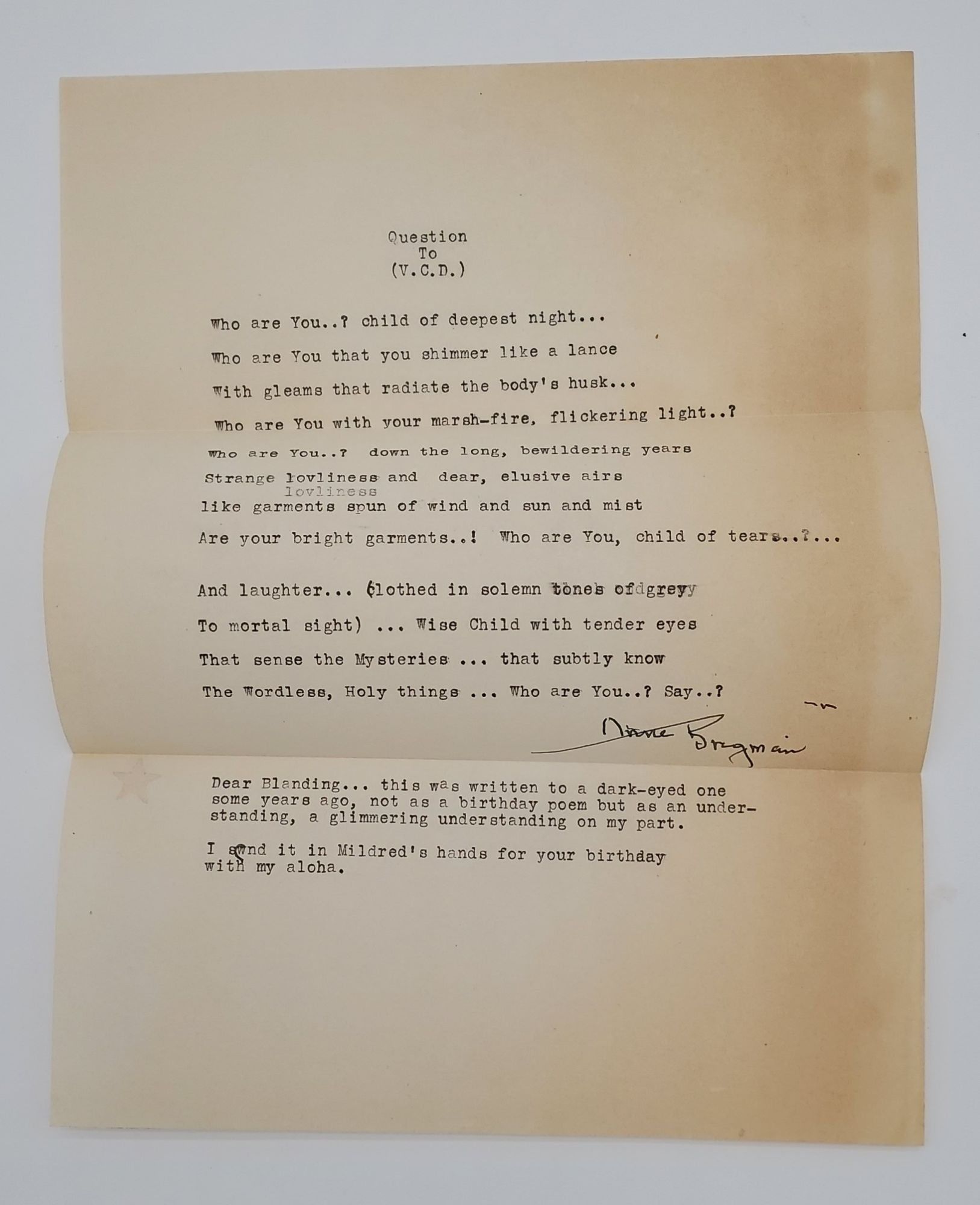 Warmly inscribed by the author, in the year of publication, and one year before her death, to artist, theatrical designer and puppeteer Blanding Sloan and his wife Mildred Taylor, on the reverse of the front free endpaper: "For the / Third Point / of the / Blessed Trinity / of / Blanding and Mildred / and (Tayton?) / Aloha / Anne Brigman / 1949." Additionally laid in, is a poem for Blanding- "Question to (V. C. D.)" typed on a sheet of 8 1/2" by 11" paper and signed by Brigman at the foot. Blanding Sloan (1886-1975) designed stage sets in New York, and had a puppet theater on Montgomery Street in San Francisco in the 1920s. In 1934, he became the director of the WPA Federal Theater in Los Angeles.
