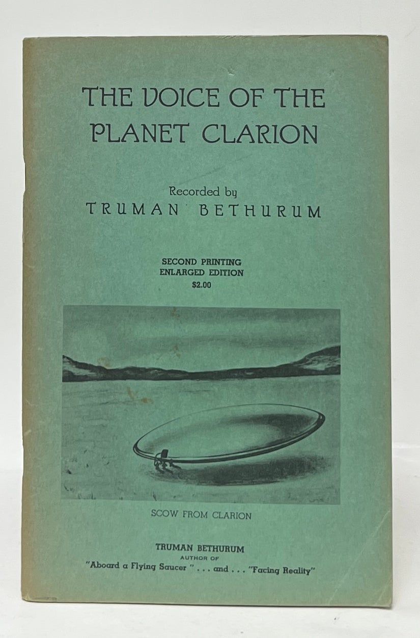 Prescott: Sanctuary of Thought, 1957. Pamphlet. Very Good. Second Printing. Enlarged Edition. Very Good. Green wraps toned at the edges, lightly bumped at the corners. Square and firmly bound with two staples, clean internally. Bethurum's poetic accounts of his contacts with Aura Rhanes, the titular "voice of the planet Clarion." From the collection of ufologist Tom Benson. [Rasmussen 136].