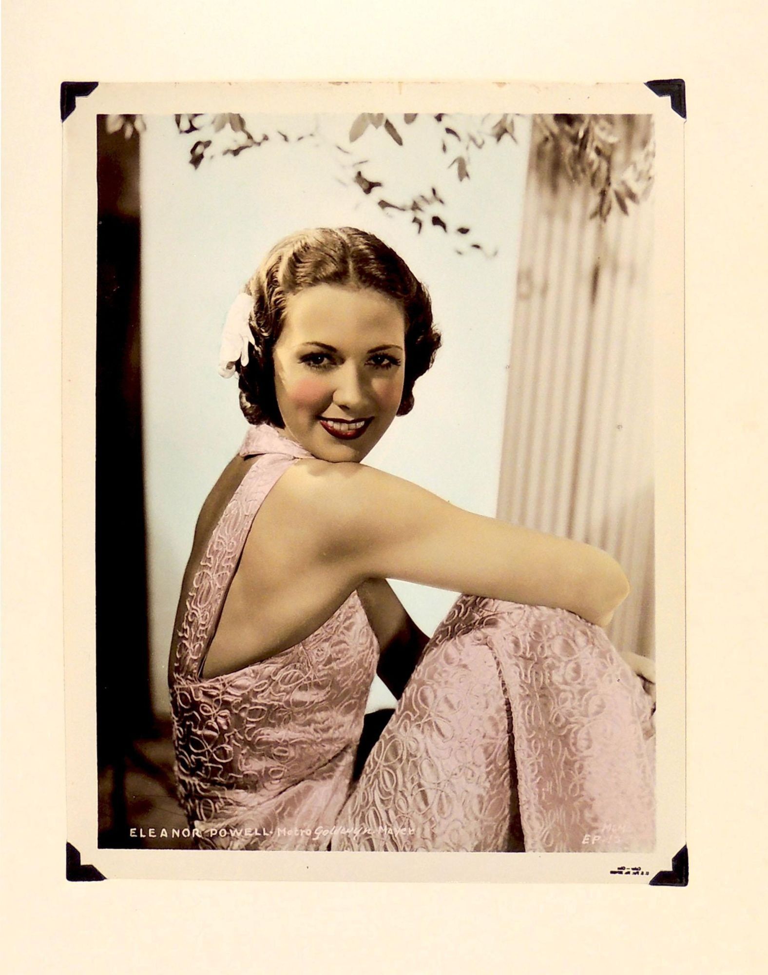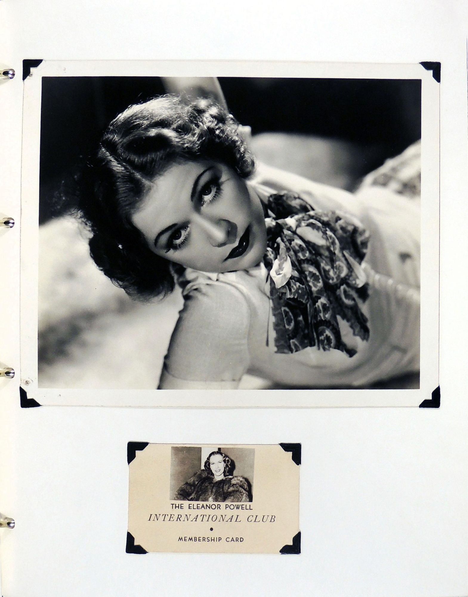 n.p.: n.p., 1950. Near Fine. Whoever created this scrapbook was an ardent fan and admirer of the famed dancer and actress, Eleanor Powell. It is a compilation of 33 pages of photographs of Ms. Powell, most being color or black & white publicity stills and portraits, with a few signed or autographed items. There are also a few black & white informal photos. From Wikipedia: "Eleanor Torrey Powell (1912 – 1982) was an American dancer and actress. Best remembered for her tap dance numbers in musical films in the 1930s and 1940s, she was one of Metro-Goldwyn-Mayer's top dancing stars during the Golden Age of Hollywood. Powell appeared in vaudeville, on Broadway, and most prominently, in a series of movie musical vehicles tailored especially to showcase her dance talents, including Born to Dance (1936), Broadway Melody of 1938 (1937), Rosalie (1937), and Broadway Melody of 1940 (1940). She retired from films in the mid-1940s but resurfaced for the occasional specialty dance scene in films such as Thousands Cheer. In the 1950s she hosted a Christian children's TV show and eventually headlined a successful nightclub act i