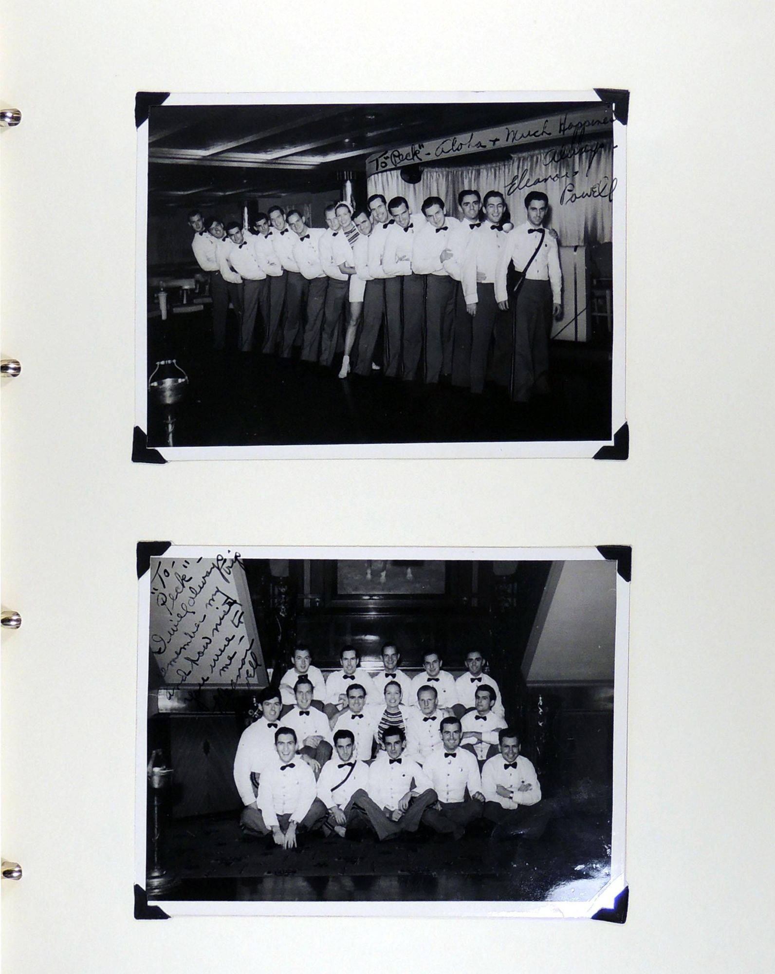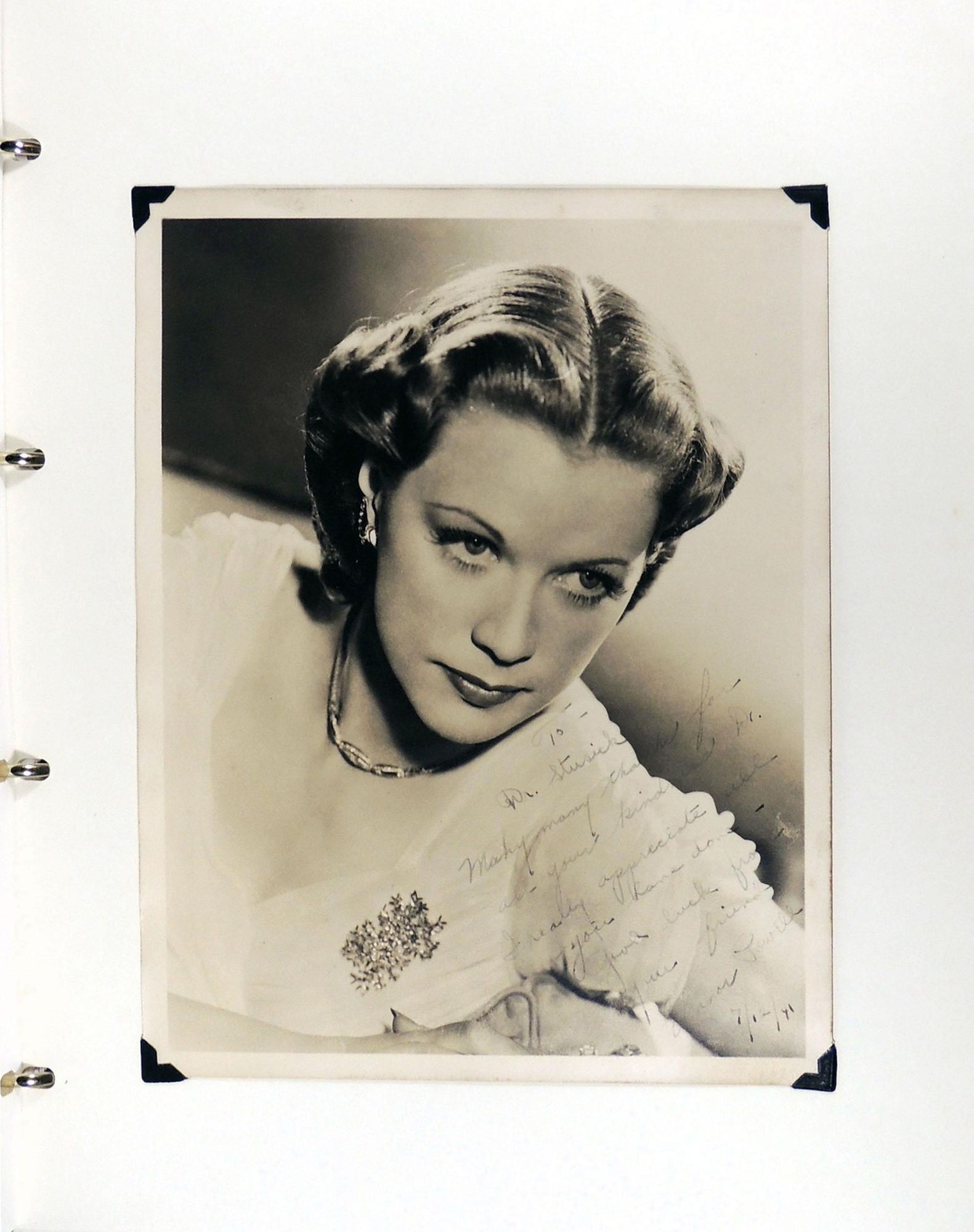 This is a large scrapbook bound in burgundy leather with a black tooled design along the borders and middle of the front cover. It came with about 50 pages, with the scrapbook creator using only the 33 and leaving the remaining blank. The photos, generally 8 x 10 inches, are mounted, usually with one to a page, using photo corners designed for mounting pictures. Many of the photos are protected with tissue guards. This is a rather amazing tribute to this star of musicals from their most popular era. In about fine condition. Covers measure 12.5 x 14.25 inches. scrapbook pages measure 11.5 x 14 inches. It is a heavy item that may require extra postage. FILM/070125.