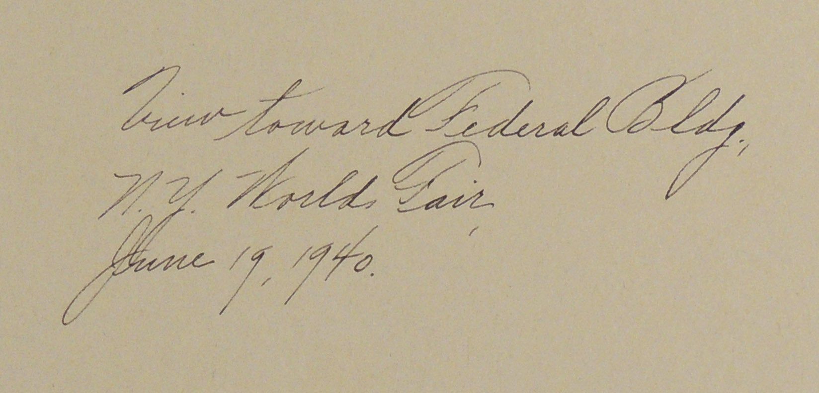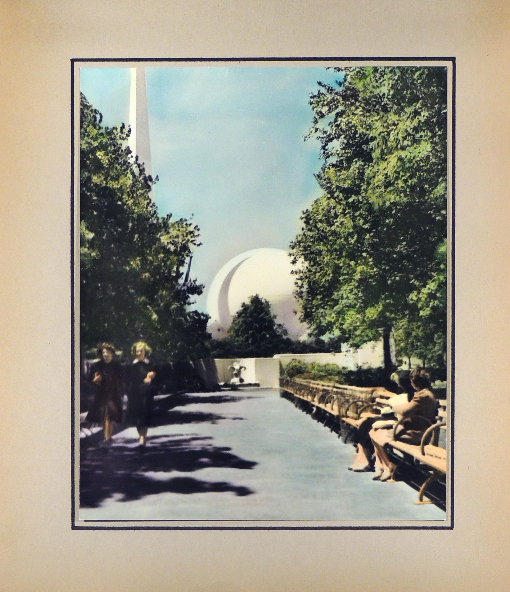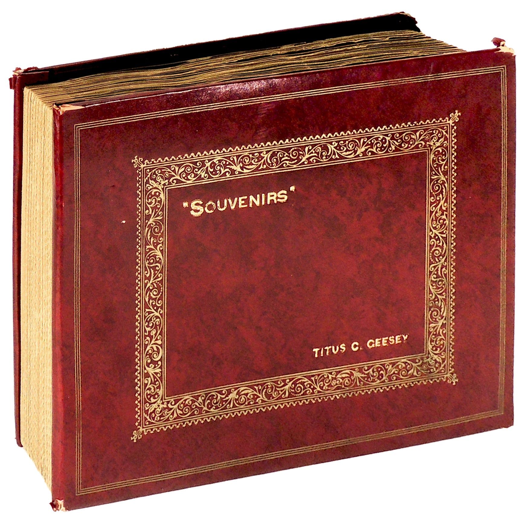 n.p.: [Titus Geesey], 1940. Fine. This is a remarkable and unique item - a scrapbook of photos personally taken by Titus C. Geesey in 1940 at the New York World's Fair that took place at Flushing Meadows in Queens, New York in 1939-1940. He mounted his photographs in a large simulated leather scrapbook, with the title "Souvenirs" and his name in gilt on the front cover. Geesey was a renowned collector of American Folk-Art whose collection was left to the Philadelphia Museum of Art. This deluxe custom album contains 64 quite exceptional and undoubtedly unique photos of pavilions, sculptures, and more, with special attention shown to the Futuristic dimensions of the Fair. Ten of the 64 photos are delicately hand colored - there is also a black and white copy of each of these hand colored photos. One of the photographs is a self portrait of Geesey that he took at the fair of his reflection in a mirrored wall. There are also eight black and white photographs taken at the famed Cloisters in upper Manhattan. The photos are beautifully shot and there are handwritten descriptions along with the date taken on the back of the gray paper frame. The tipped in photos measure 7.5x 9.25 inches and are on textured gray paper within a thin black outline. The pages are 11.5 x 14.25 inches.